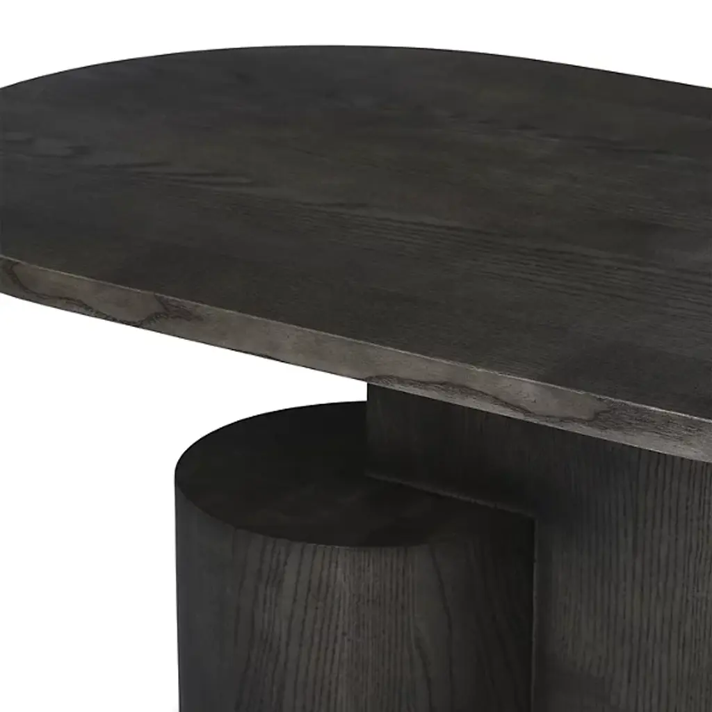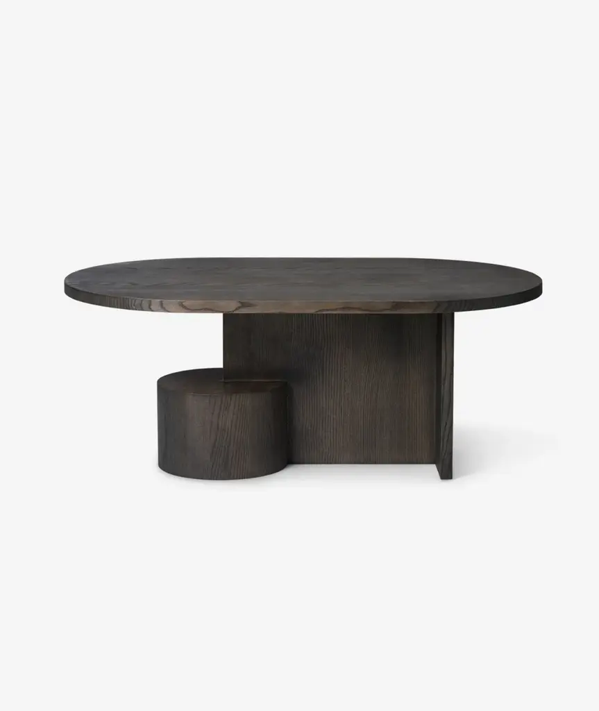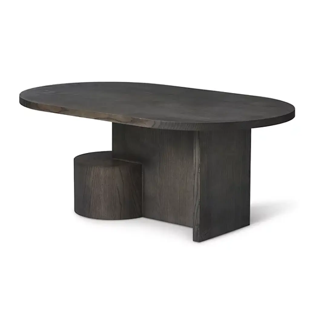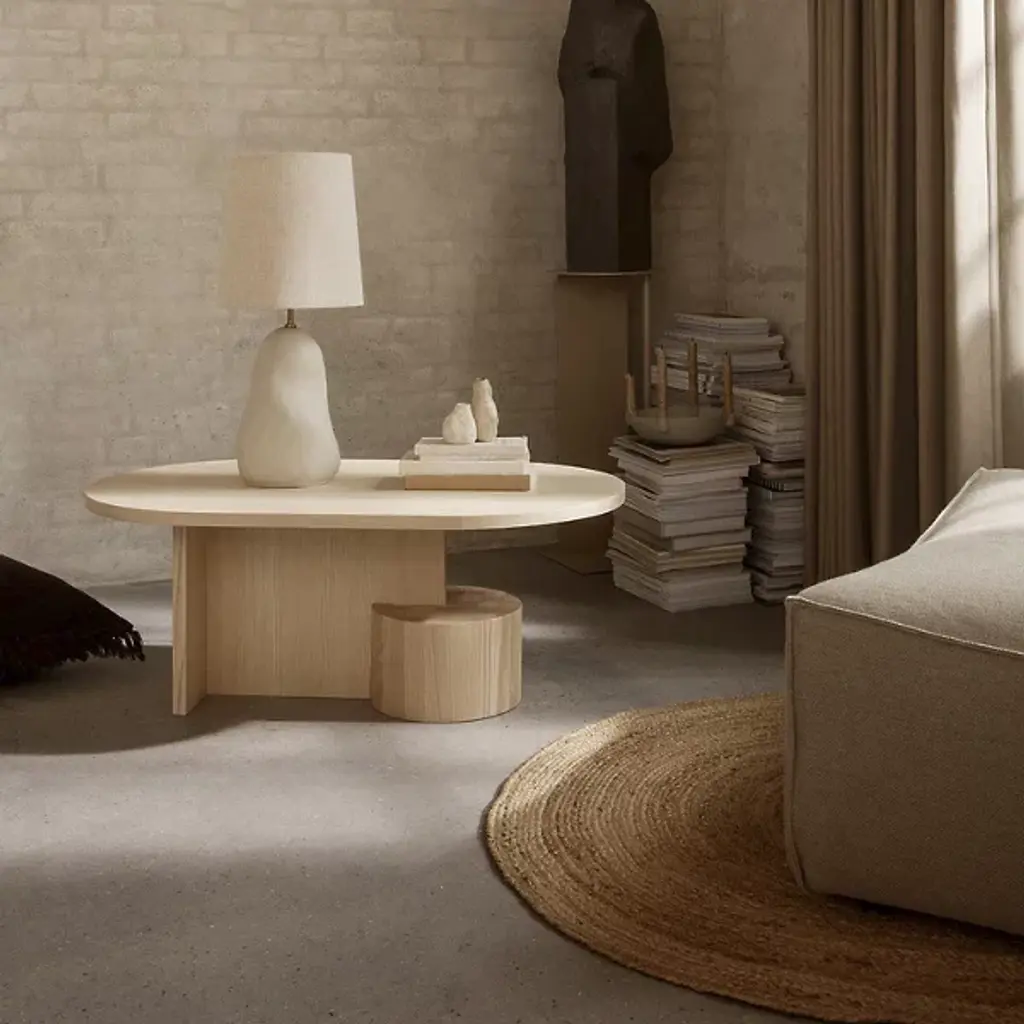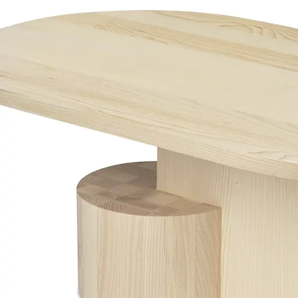 The Insert Coffee Table from Ferm Living, crafted from FSC™-certified solid ash, is both a sturdy and sculptural piece. It features an intriguing design that plays with various shapes, with an oval top that lightly rests on two geometric joints anchored by a substantial cylindrical base. This table seamlessly blends art and functionality, making it a subtle yet striking addition to any living space, providing both aesthetic appeal and practical use as a coffee table.