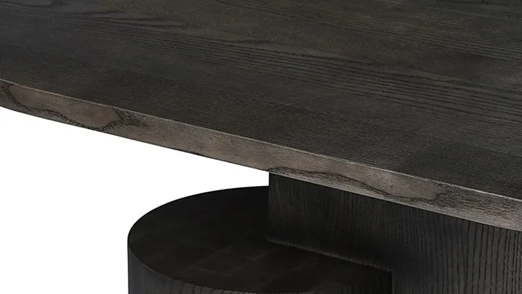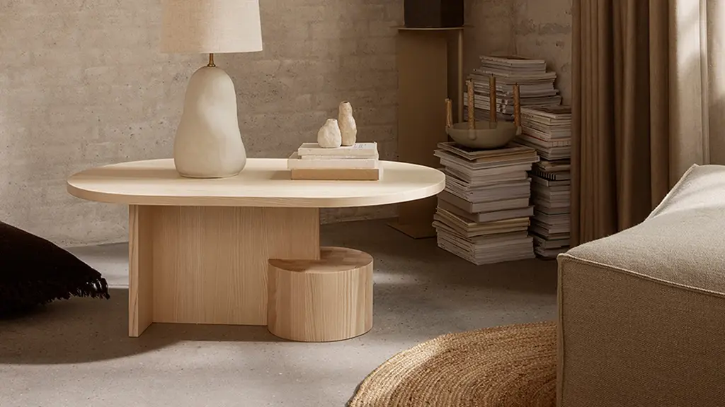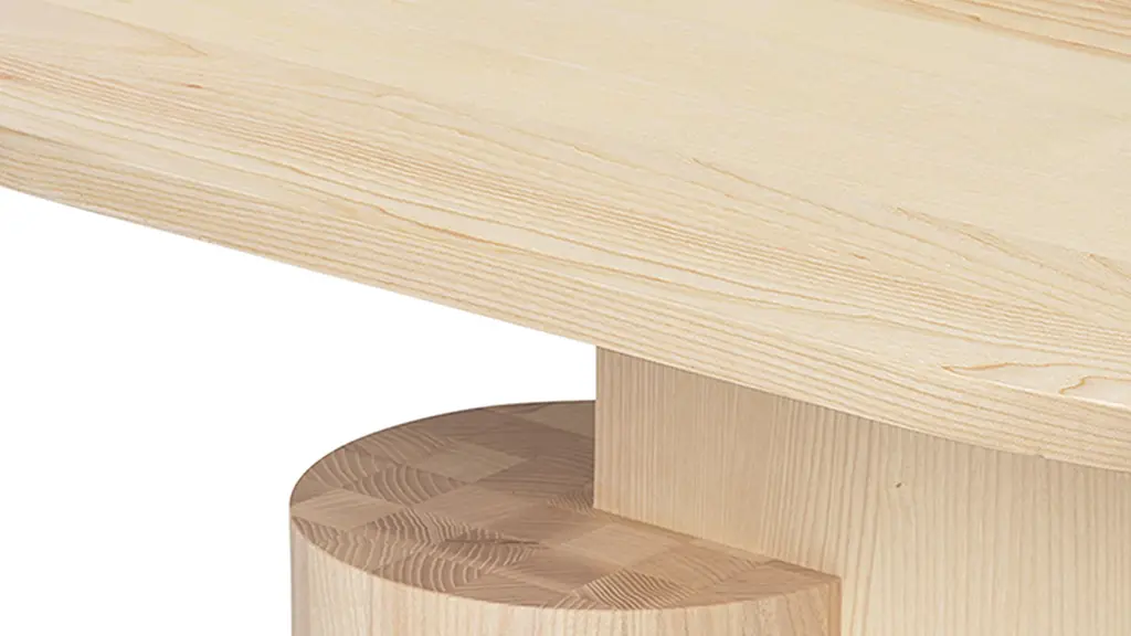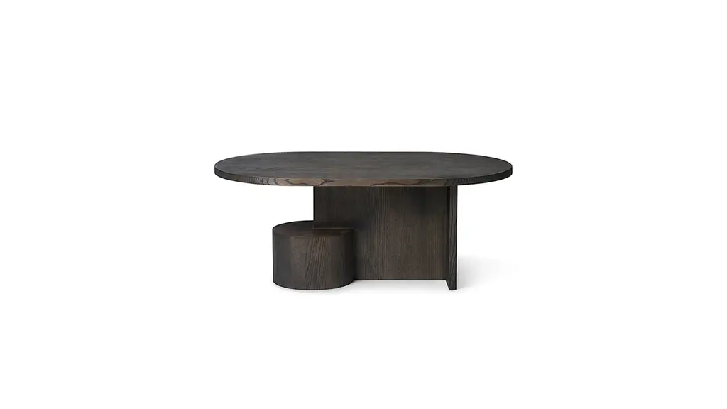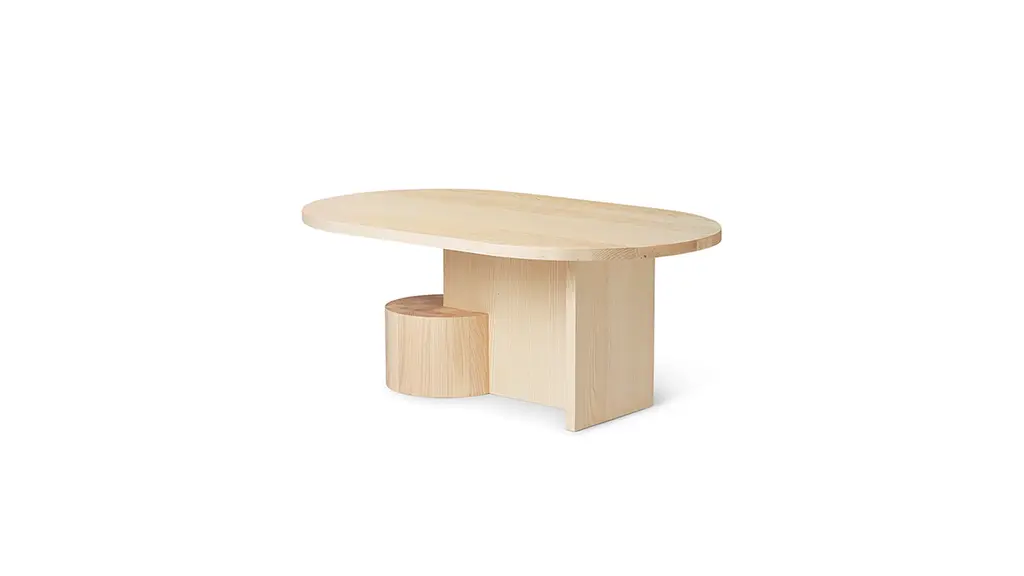 Crafted from FSC-certified solid ash, the Insert Coffee Table is a sturdy yet sculptural piece. Playing with multiple shapes, the oval top rests lightly upon two geometric joints that are anchored by a heavy, cylindrical base. The table is a subtle piece of art in your home that is matched by its functionality as a coffee table. Designed and produced by the Copenhagen-based studio Ferm Living.