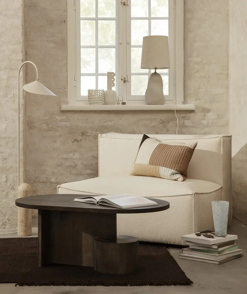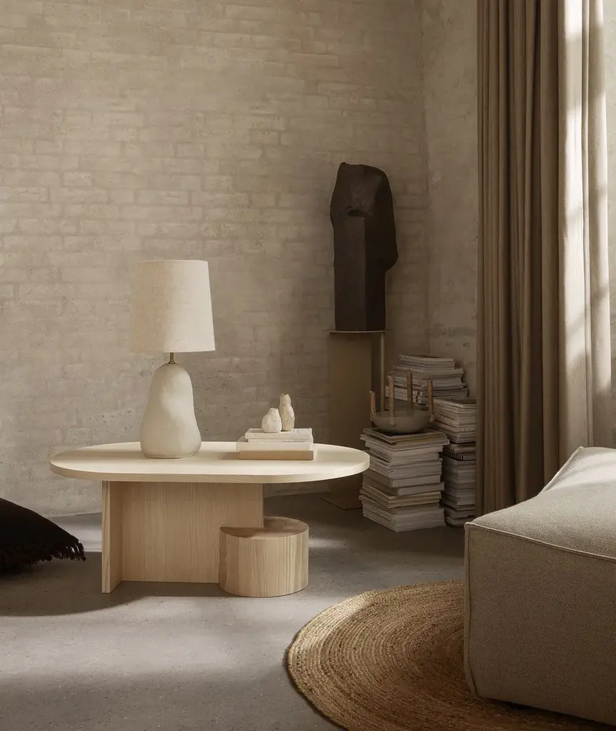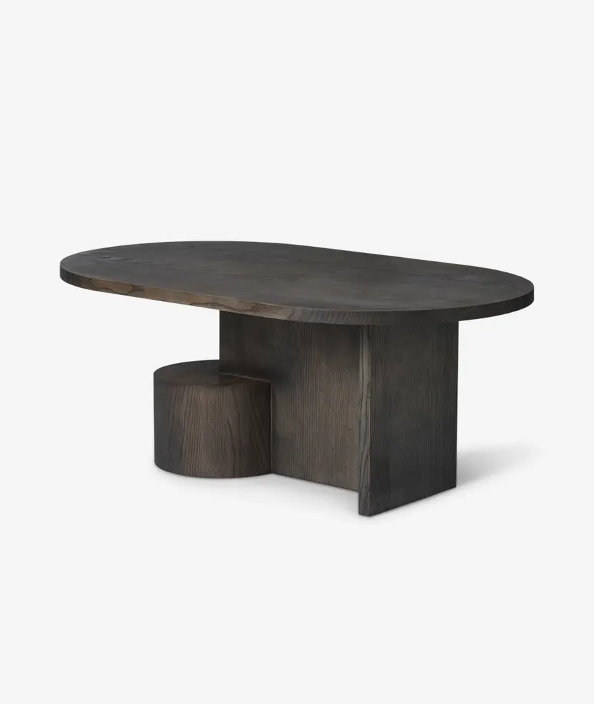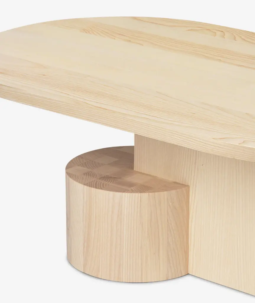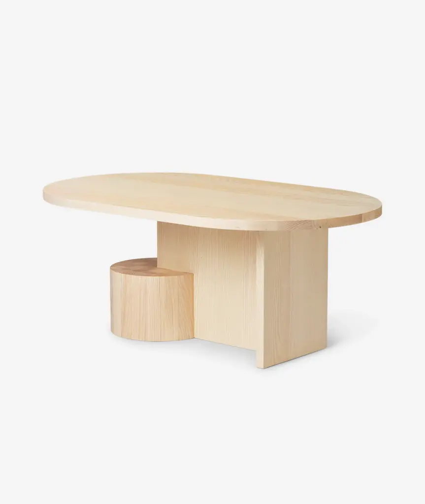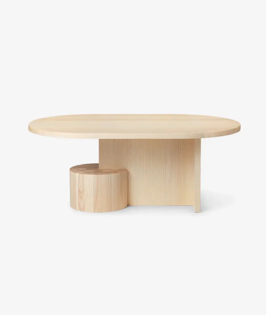 Crafted from solid ash, the Insert Coffee Table is a sturdy yet sculptural piece. Playing with multiple shapes, the oval top rests lightly upon two geometric joints that are anchored by a heavy, cylindrical base. The table is a subtle piece of art in your home that is matched by its functionality as a coffee table.