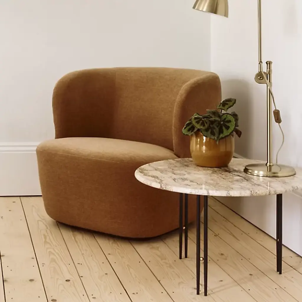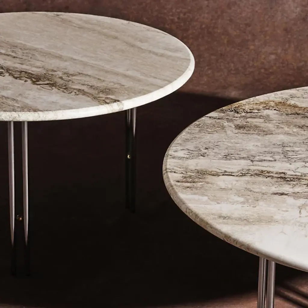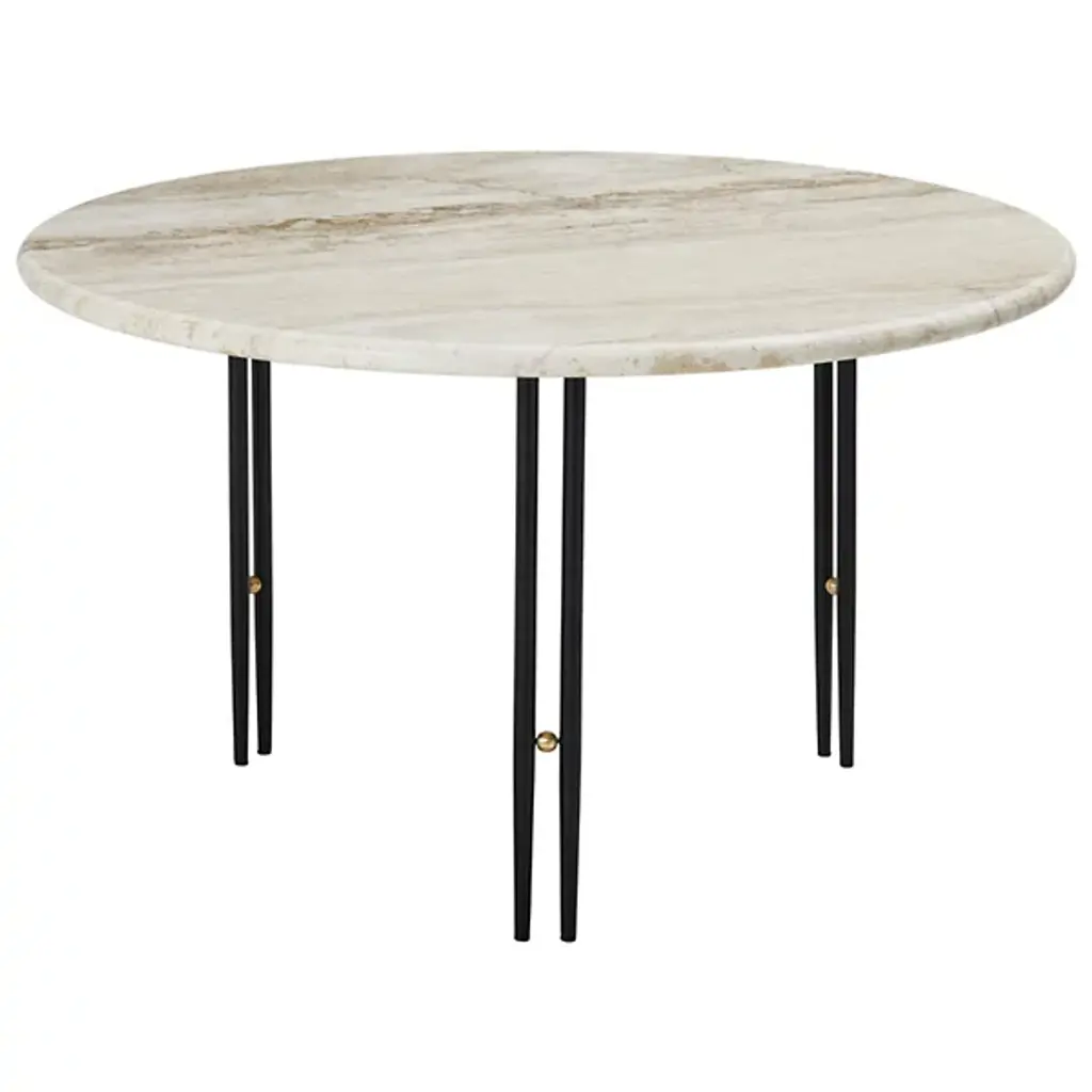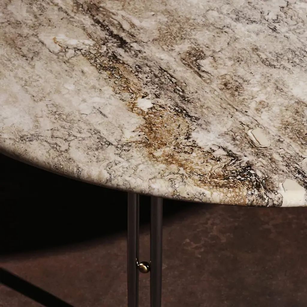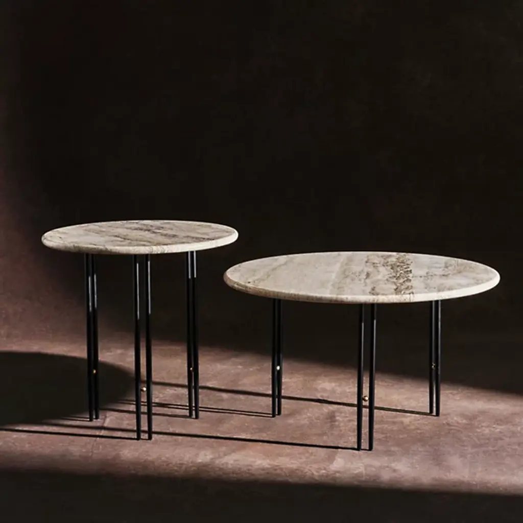 The IOI Coffee Table by Gubi perfectly blends Italian elegance and modern design. Crafted by GamFratesi, it features a beautiful combination of solid brass, sleek steel, and natural travertine. Inspired by Art Deco geometry, its slender twin metal legs are connected by a charming brass sphere—an "I-O-I" design brought to life. Whether displayed solo or arranged in a stylish group, this table adds a touch of sophistication and timeless charm to any room.