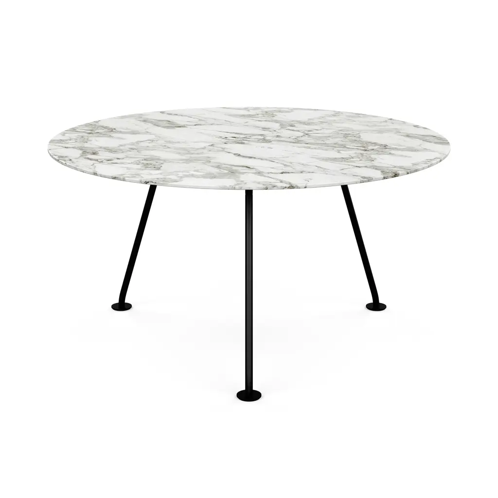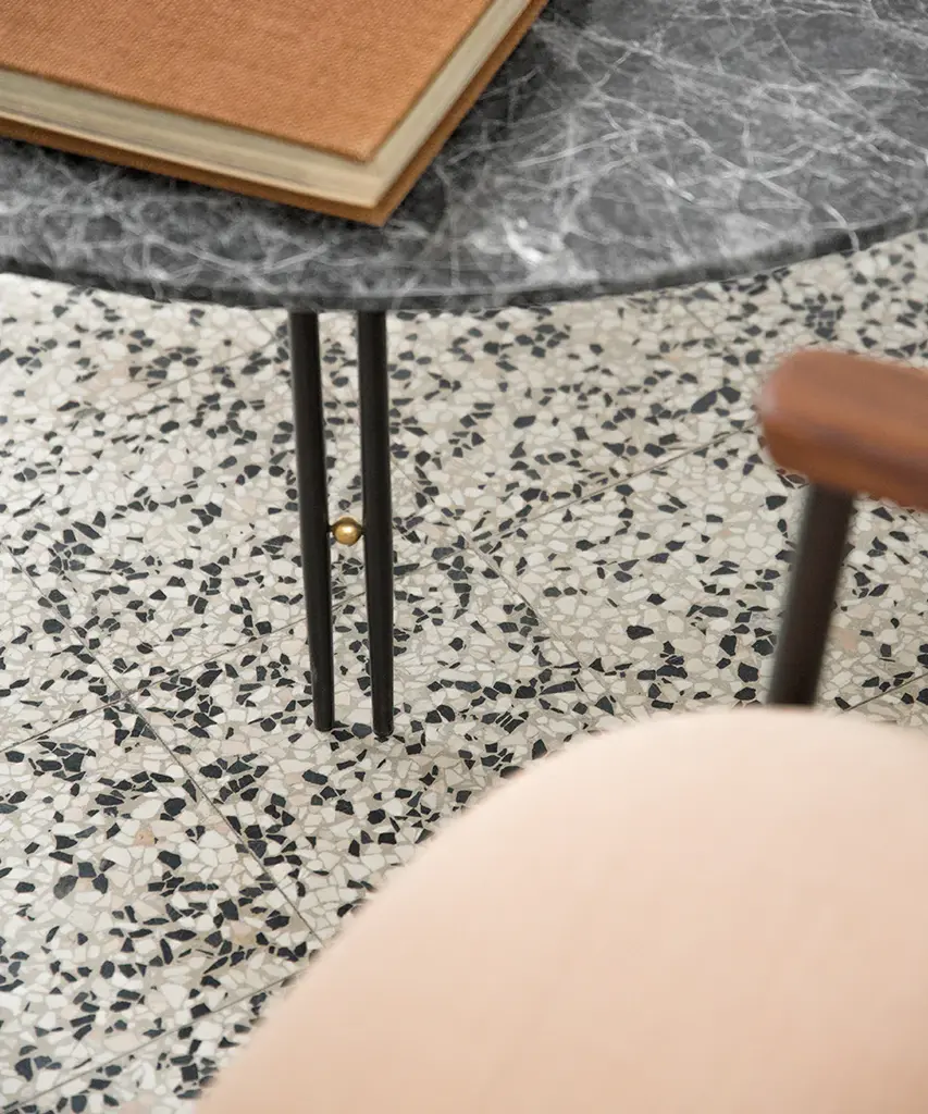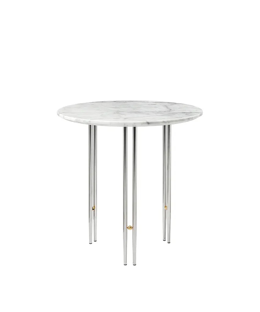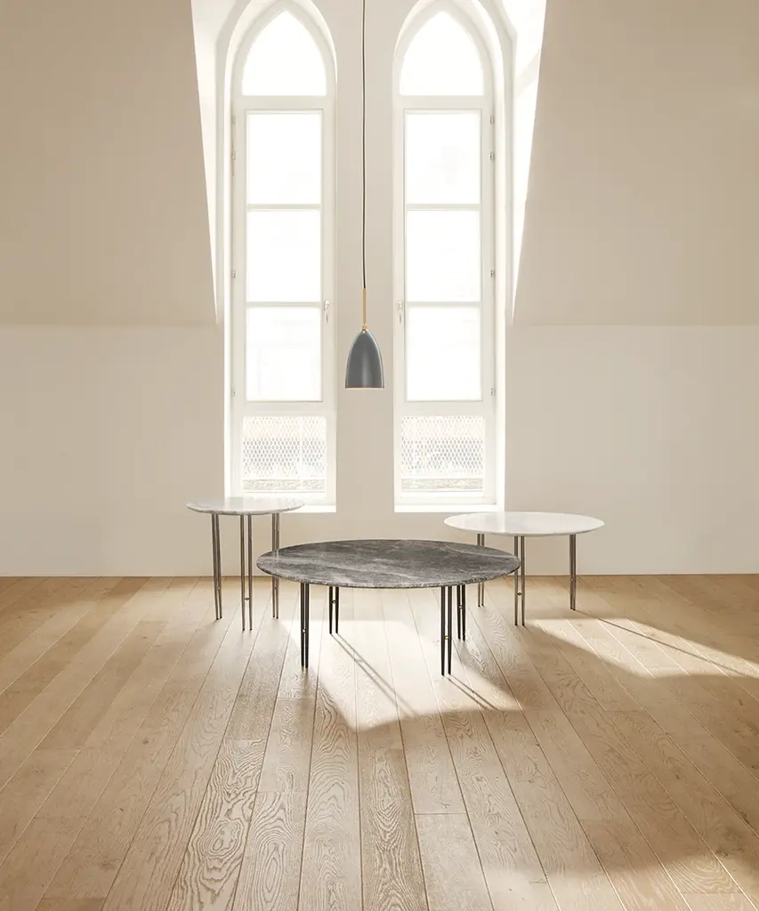 Drawing on geometric Art Deco references with a contemporary design language, the IOI collection explores the empty space between the physical form as much as the form itself. The tables share a common ‘sticks and sphere’ motif, reflected in the shape of the letters that form their name, pronounced ‘i-o-i.’ Designed by GamFratesi, the IOI tables are a celebration of Italian materiality, featuring solid brass and gray Emperador and white Carrara marble. The use of marble anticipates a growing desire for the honesty and authenticity of organic materials. The careful selection of colors and textures keeps its materiality alive in the final design and individual stones are chosen for their veining and striations, giving each table a unique expression of its own. The table’s twin legs are linked by a small solid brass sphere, that works as both a functional ‘spacer’ to strengthen the dual pipe-like legs, and as an intimately considered signature detail or ‘pause’ that emphasizes both its own materiality and the careful attention paid to the spaces between the elements of each piece. At three different heights and diameters, the IOI Coffee Tables work well in pairs, clusters, or alone as a single table. Produced by Danish design publisher, Gubi.