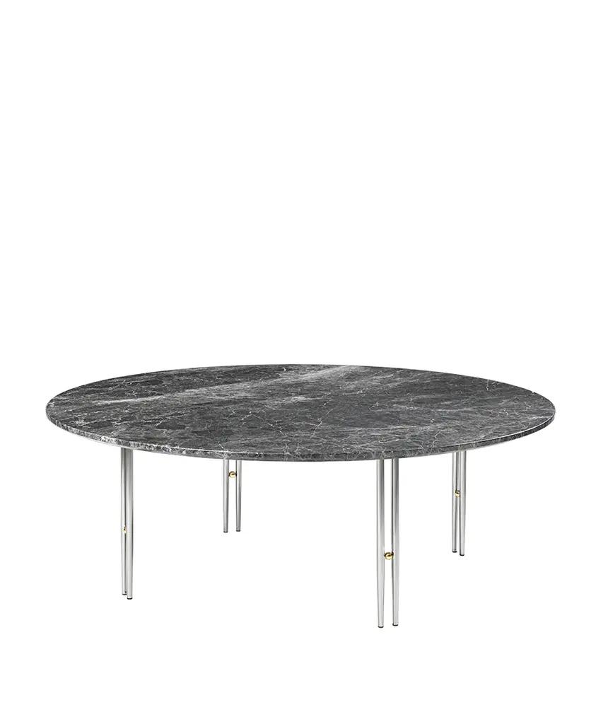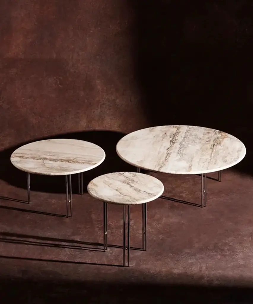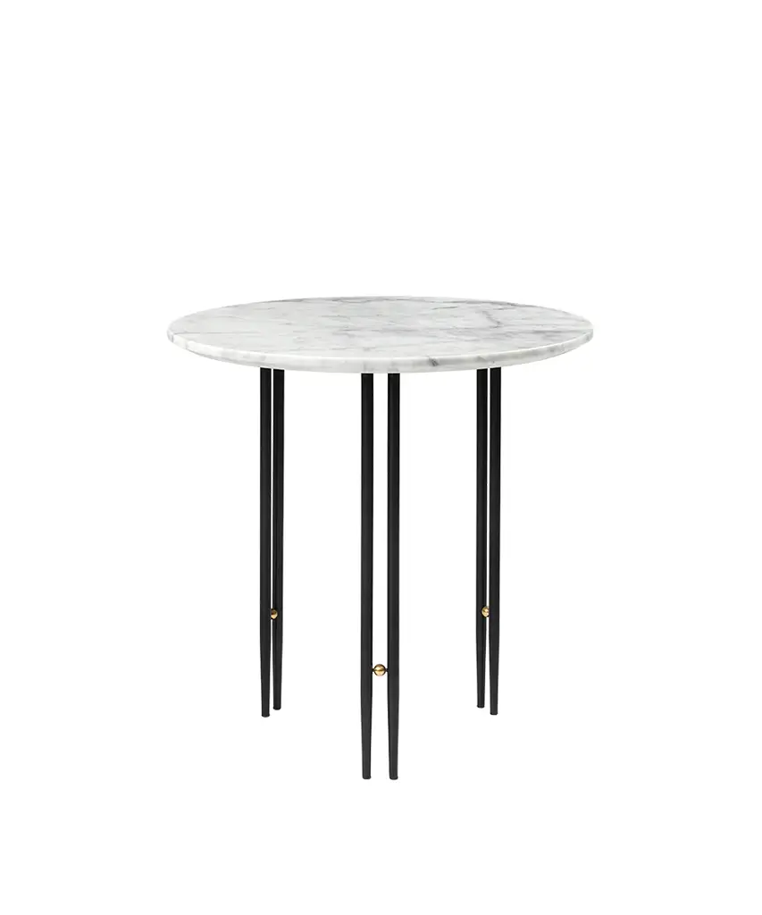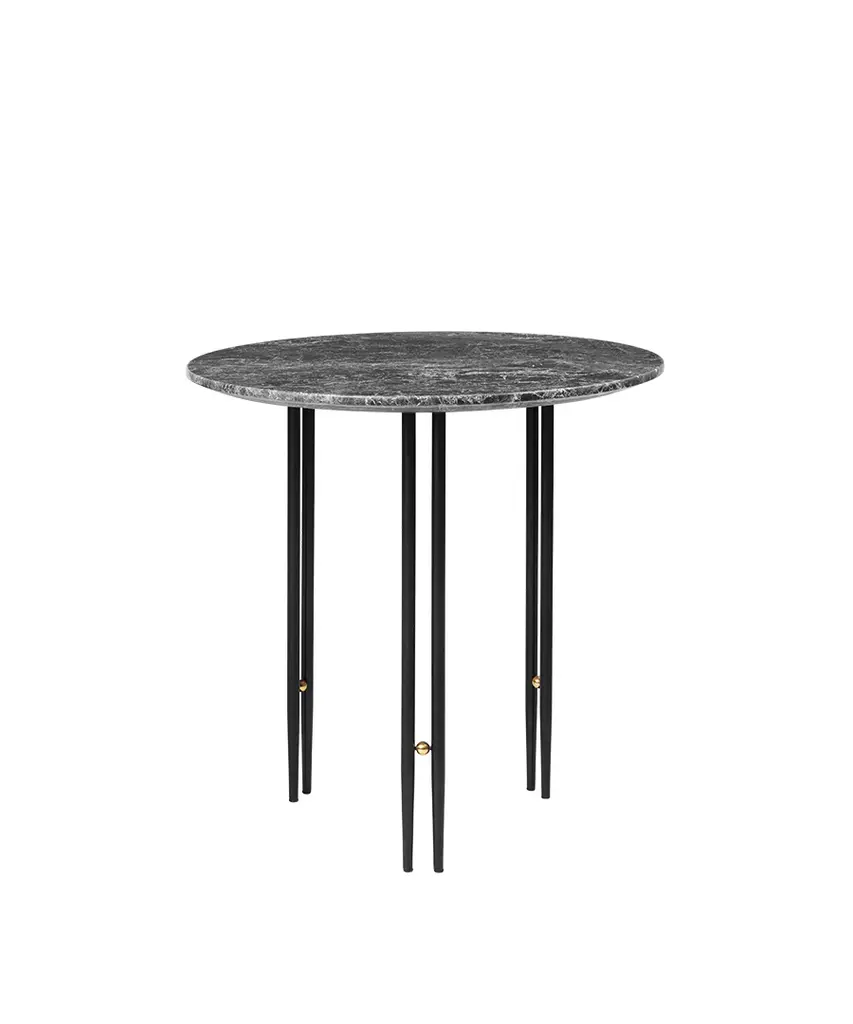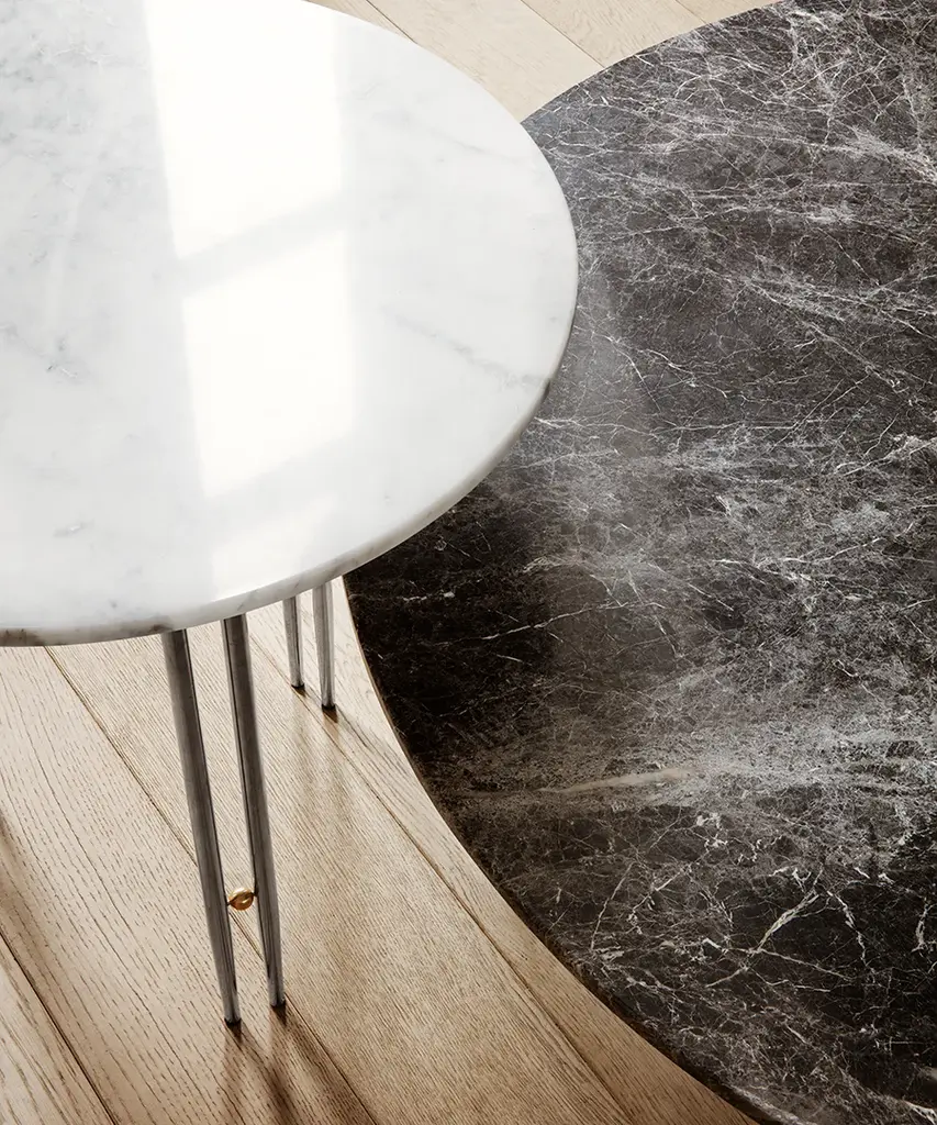 Drawing on geometric Art Deco references with a contemporary design language, the IOI collection explores the empty space between the physical form as much as the form itself. The tables share a common ‘sticks and sphere’ motif, reflected in the shape of the letters that form their name, pronounced ‘i-o-i.’ Designed by GamFratesi, the IOI tables are a celebration of Italian materiality, featuring solid brass and gray Emperador and white Carrara marble. The use of marble anticipates a growing desire for the honesty and authenticity of organic materials. The careful selection of colors and textures keeps its materiality alive in the final design and individual stones are chosen for their veining and striations, giving each table a unique expression of its own. The table’s twin legs are linked by a small solid brass sphere, that works as both a functional ‘spacer’ to strengthen the dual pipe-like legs, and as an intimately considered signature detail or ‘pause’ that emphasizes both its own materiality and the careful attention paid to the spaces between the elements of each piece. At three different heights and diameters, the IOI Coffee Tables work well in pairs, clusters, or alone as a single table. Produced by Danish design publisher, Gubi.