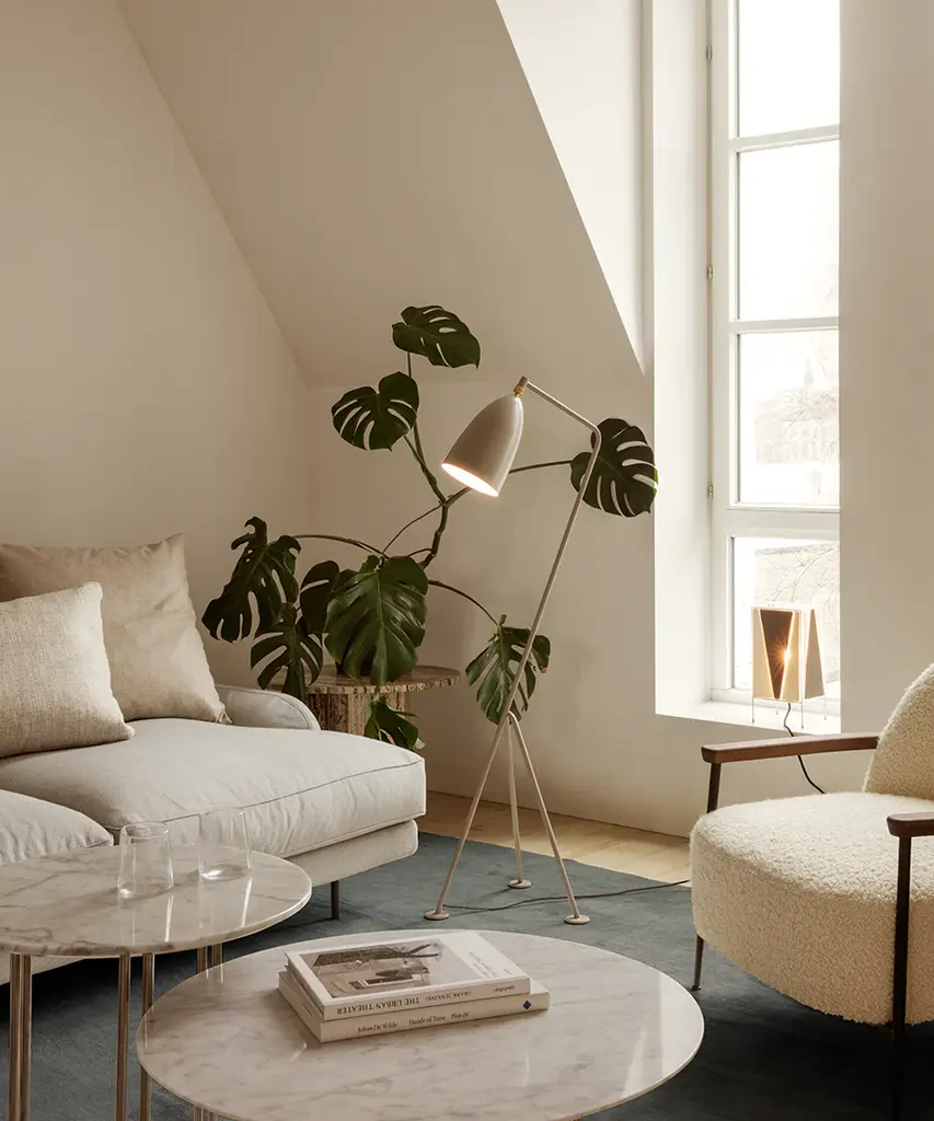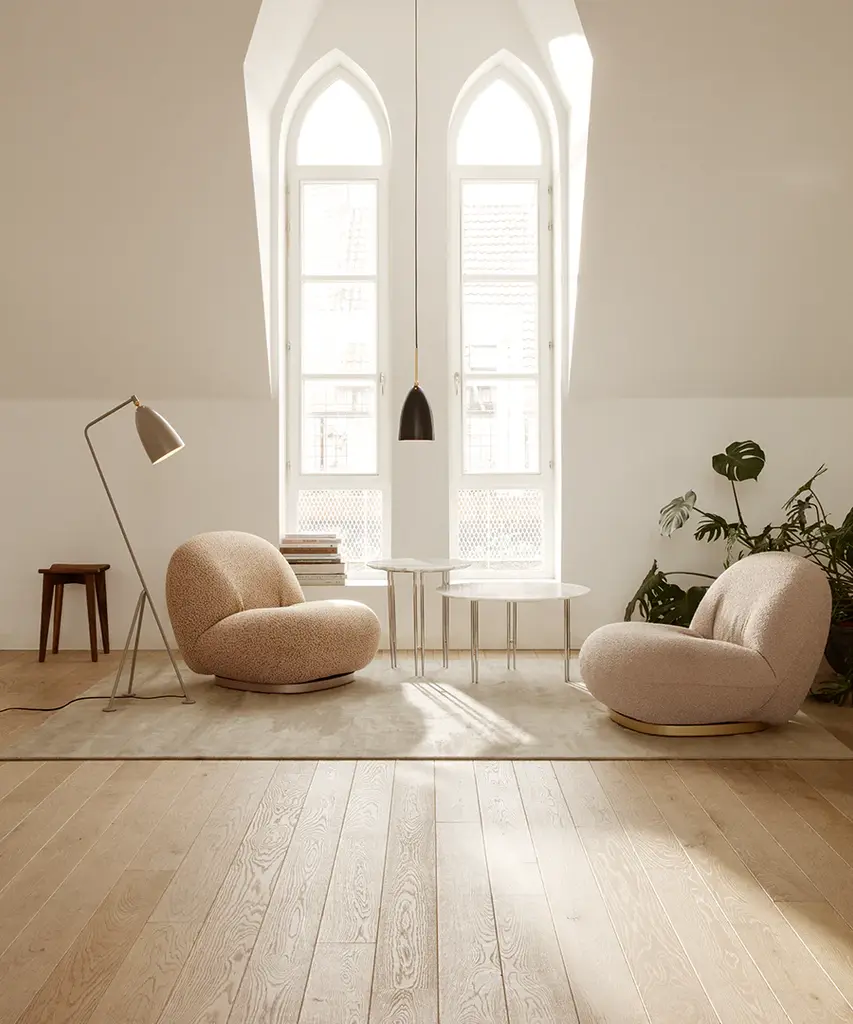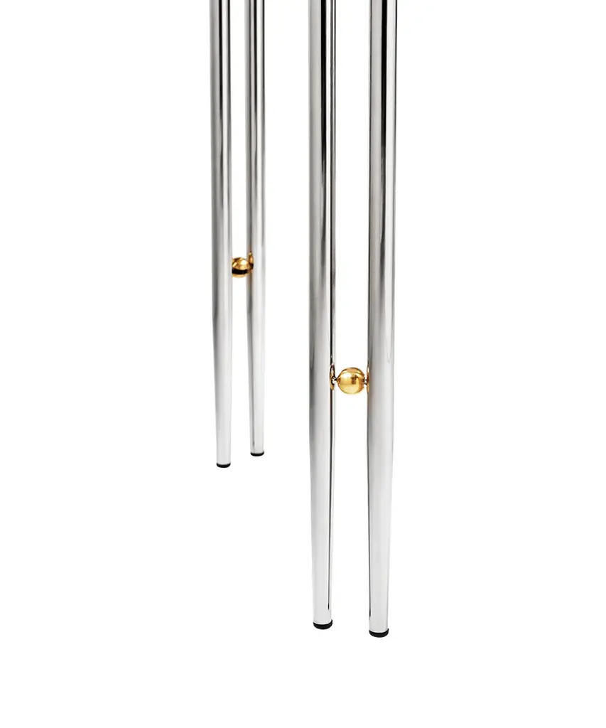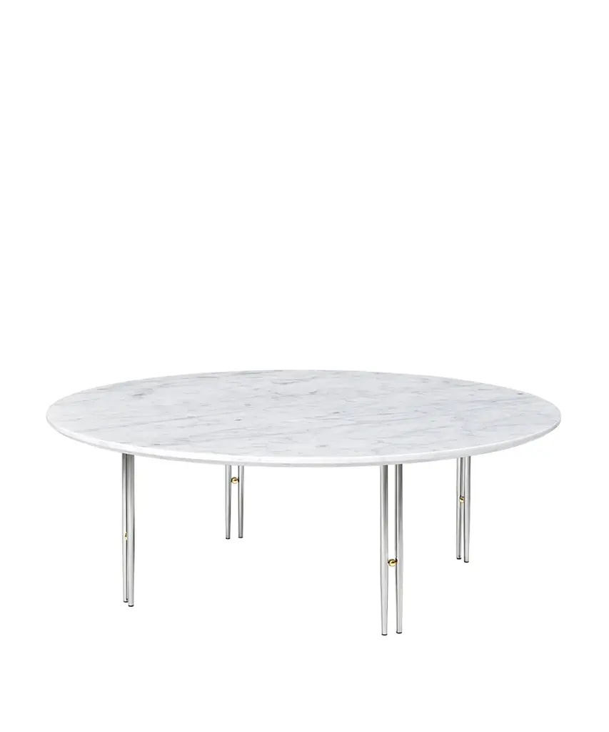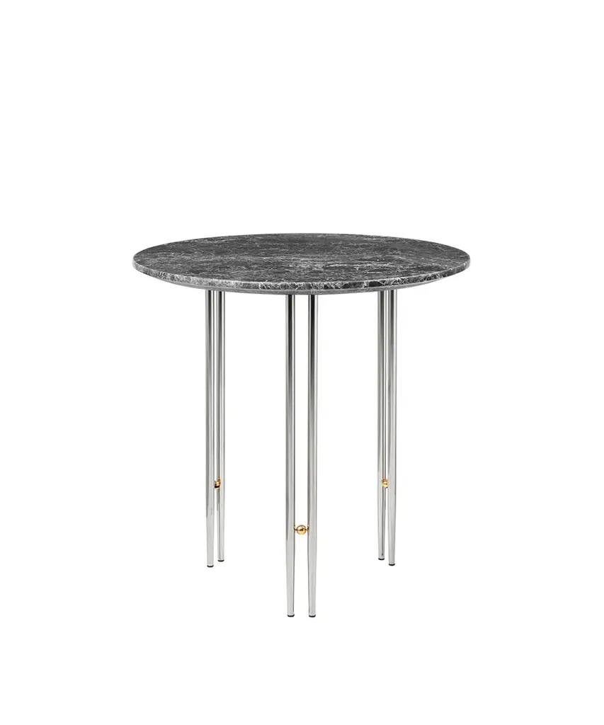 Drawing on geometric Art Deco references with a contemporary design language, the IOI collection explores the empty space between the physical form as much as the form itself. The tables share a common ‘sticks and sphere’ motif, reflected in the shape of the letters that form their name, pronounced ‘i-o-i.’ Designed by GamFratesi, the IOI tables are a celebration of Italian materiality, featuring solid brass and gray Emperador and white Carrara marble. The use of marble anticipates a growing desire for the honesty and authenticity of organic materials. The careful selection of colors and textures keeps its materiality alive in the final design and individual stones are chosen for their veining and striations, giving each table a unique expression of its own. The table’s twin legs are linked by a small solid brass sphere, that works as both a functional ‘spacer’ to strengthen the dual pipe-like legs, and as an intimately considered signature detail or ‘pause’ that emphasizes both its own materiality and the careful attention paid to the spaces between the elements of each piece. At three different heights and diameters, the IOI Coffee Tables work well in pairs, clusters, or alone as a single table. Produced by Danish design publisher, Gubi.