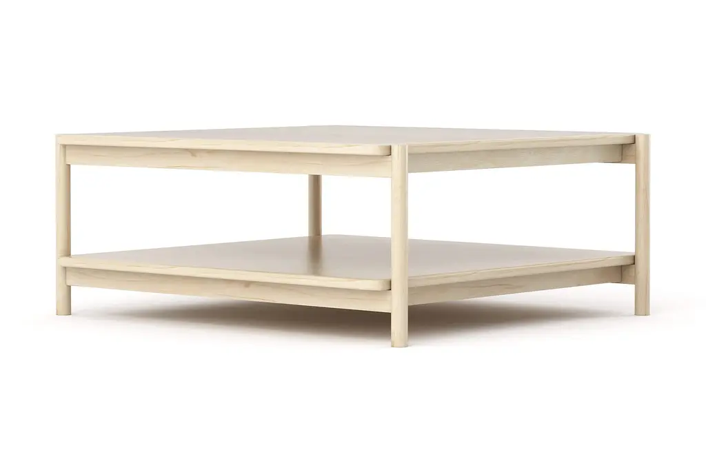 Iris Square Coffee Table's just-right size supports all your sips and snacks with simple, refined style and within easy reach between seats. Its open design and lower shelf let your favorite possessions shine: style with a stack of coffee table books, your favorite ceramic bowl, and voilà!Tops and sides crafted in your choice of beautiful, 100% solid hard White Maple or American Walnut. For additional strength and lightness, FSC-certified, low-VOC CARB 2 compliant Maple or Walnut hardwood plywood is used elsewhere.
