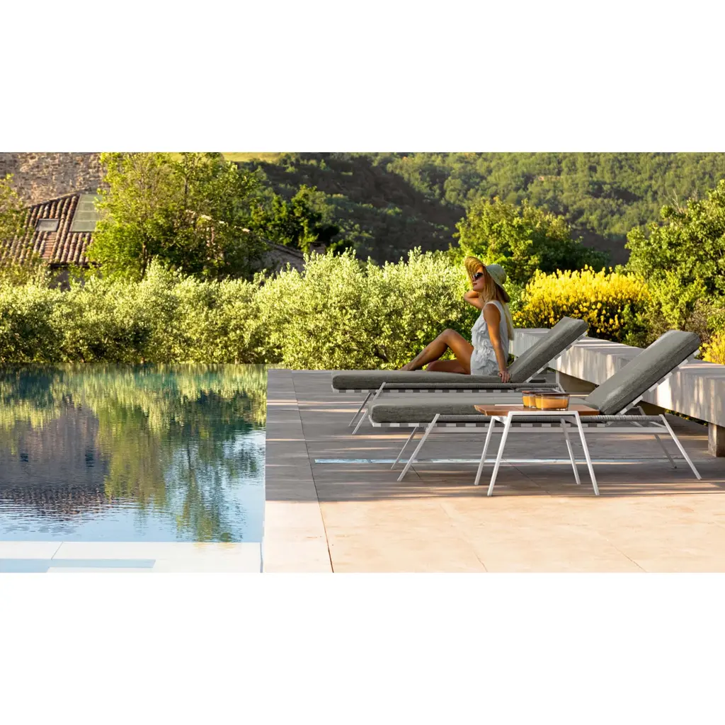 The table of the Cottage line is the only rectangular one. The aluminum frame is the same of the other elements such as the living armchairs, the sofa, the pouf and sunbed. The top is in iroko wood.