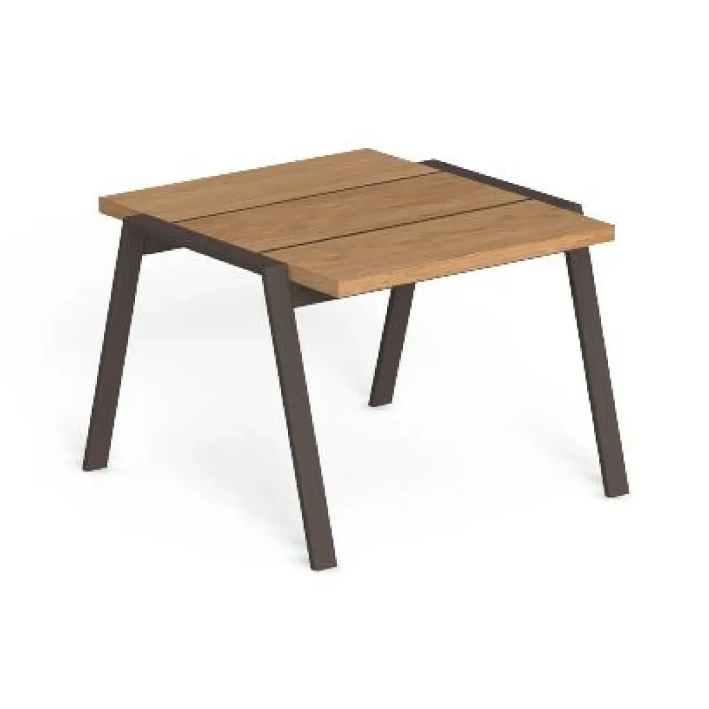 The table of the Cottage line is the only rectangular one. The aluminum frame is the same of the other elements such as the living armchairs, the sofa, the pouf and sunbed. The top is in iroko wood.