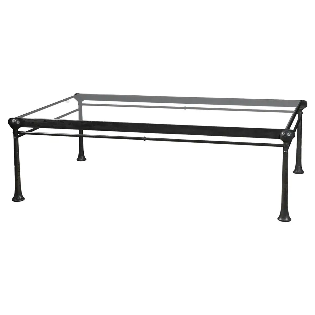 The Etienne cocktail table has an iron base with rustic detailing. It’s distinct look is achieved by placing the lateral and frontal crossbars at different heights and is covered by a sleek glass table top.