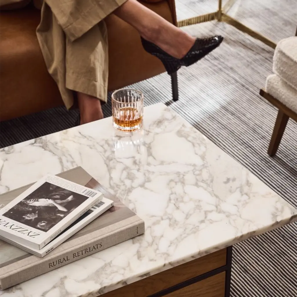 Coffee table by Paul McCobb displays the genius of his straightforward design philosophy. Designed in 1952 as part of his Irwin collection for Calvin furniture, this reintroduction retains the unadorned form and function of the original piece. The white oak frame, certified sustainable by the Forest Stewardship Council , holds two drawers and a fixed shelf, all supported by a slim bronze-finish base. A top of Arabescato marble, sourced from an Italian quarry and polished to a semi-gloss, weaves its dark grey veining across a background of white. Made to the highest standards of quality, this classic midcentury piece is a strong example of McCobb's enduring style. CB2 exclusive.