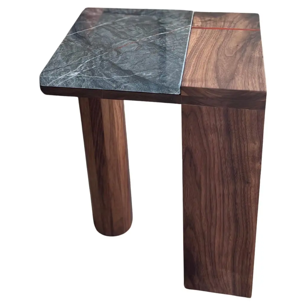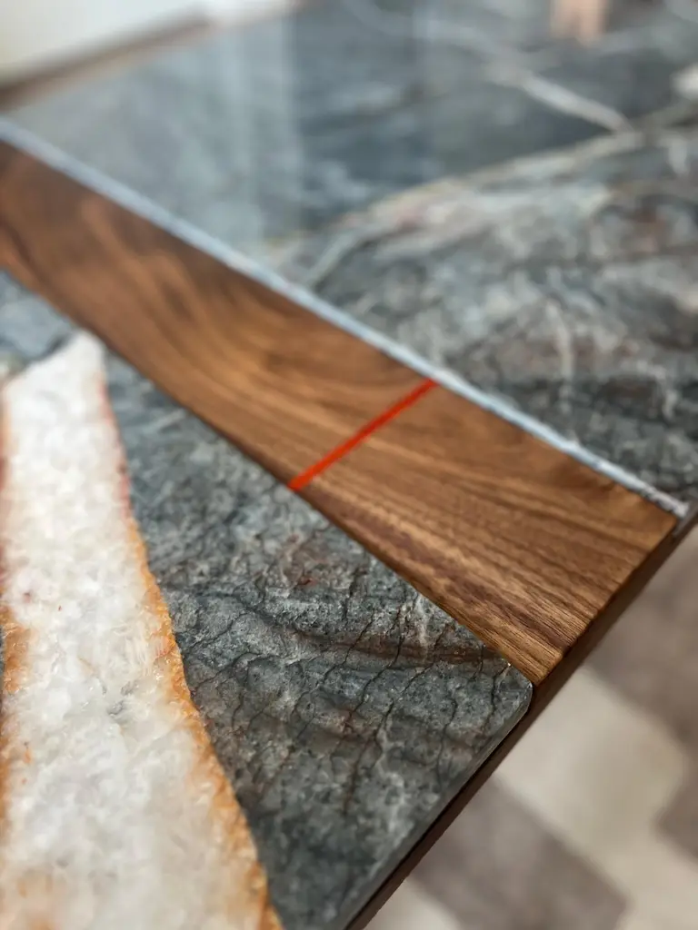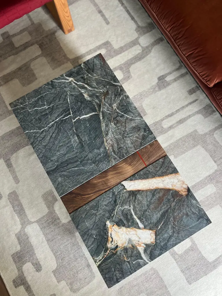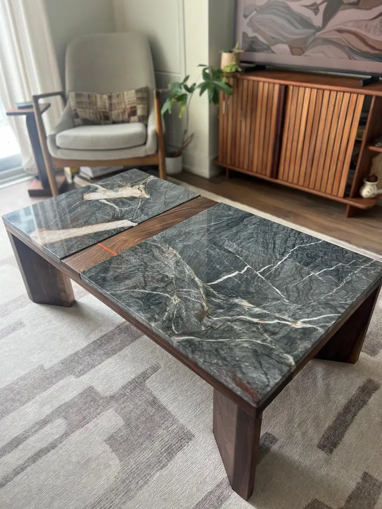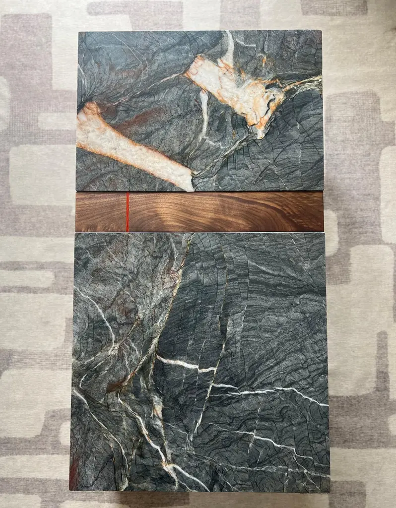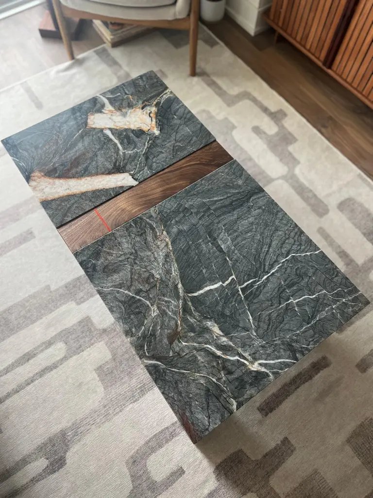 This handcrafted coffee table merges nature's raw beauty with modern design. Made with solid walnut and available in two stunning stone options—Green Avocatus Quartzite and Fusion Black Quartzite—it celebrates the harmony of materials. Each stone slab, with its unique veining and rich tones, seamlessly transitions into the walnut columns, creating a flowing connection that echoes nature’s artistry. The wood grain and stone veins align thoughtfully, offering a striking yet cohesive aesthetic. A signature redline of Padauk wood divides the stone, subtly drawing attention to the craftsmanship while reinforcing Redline Designs Collective’s distinctive mark. This one-of-a-kind piece serves as a conversation starter and a timeless addition to any living space, blending sophistication with organic elegance. Perfect for those who value design rooted in nature.