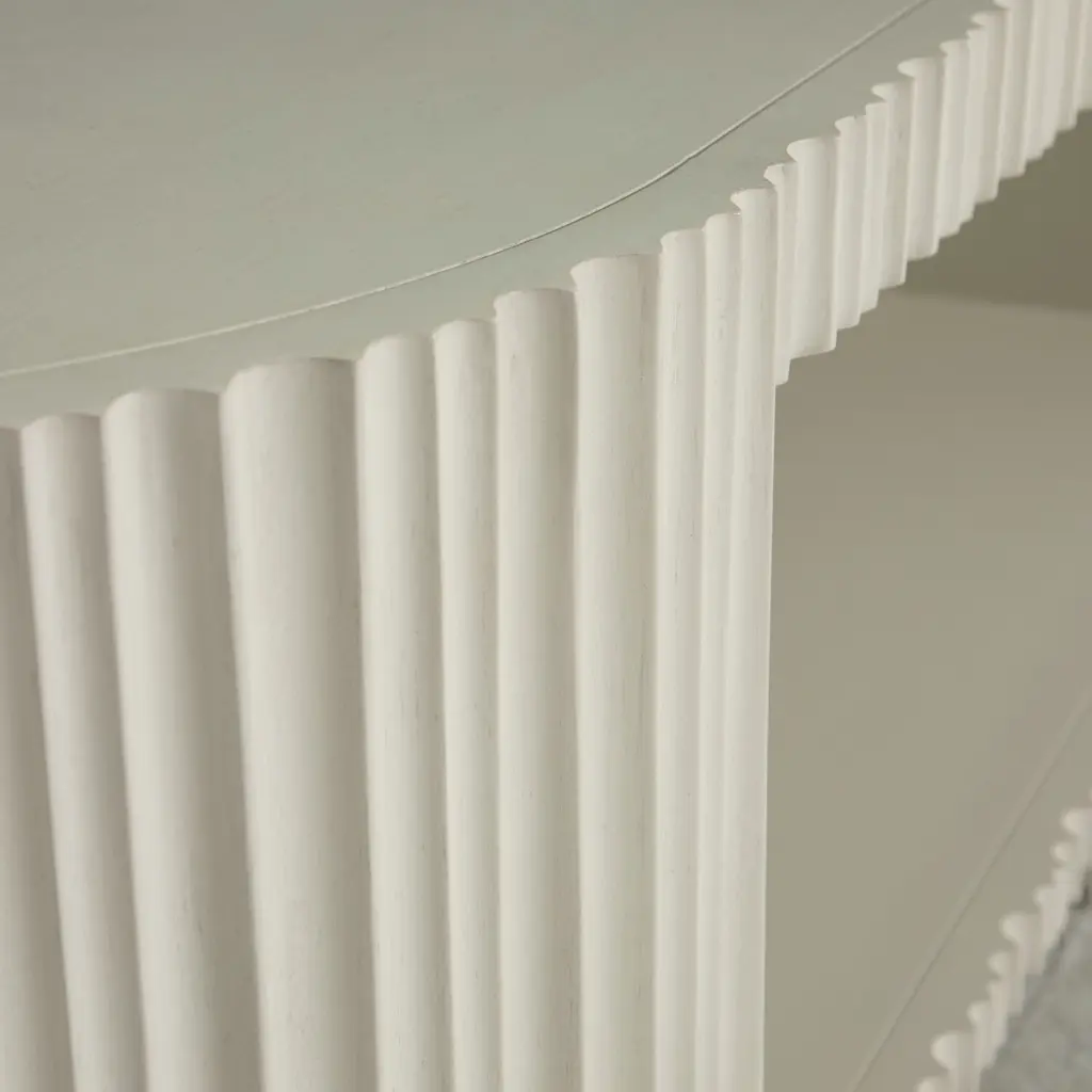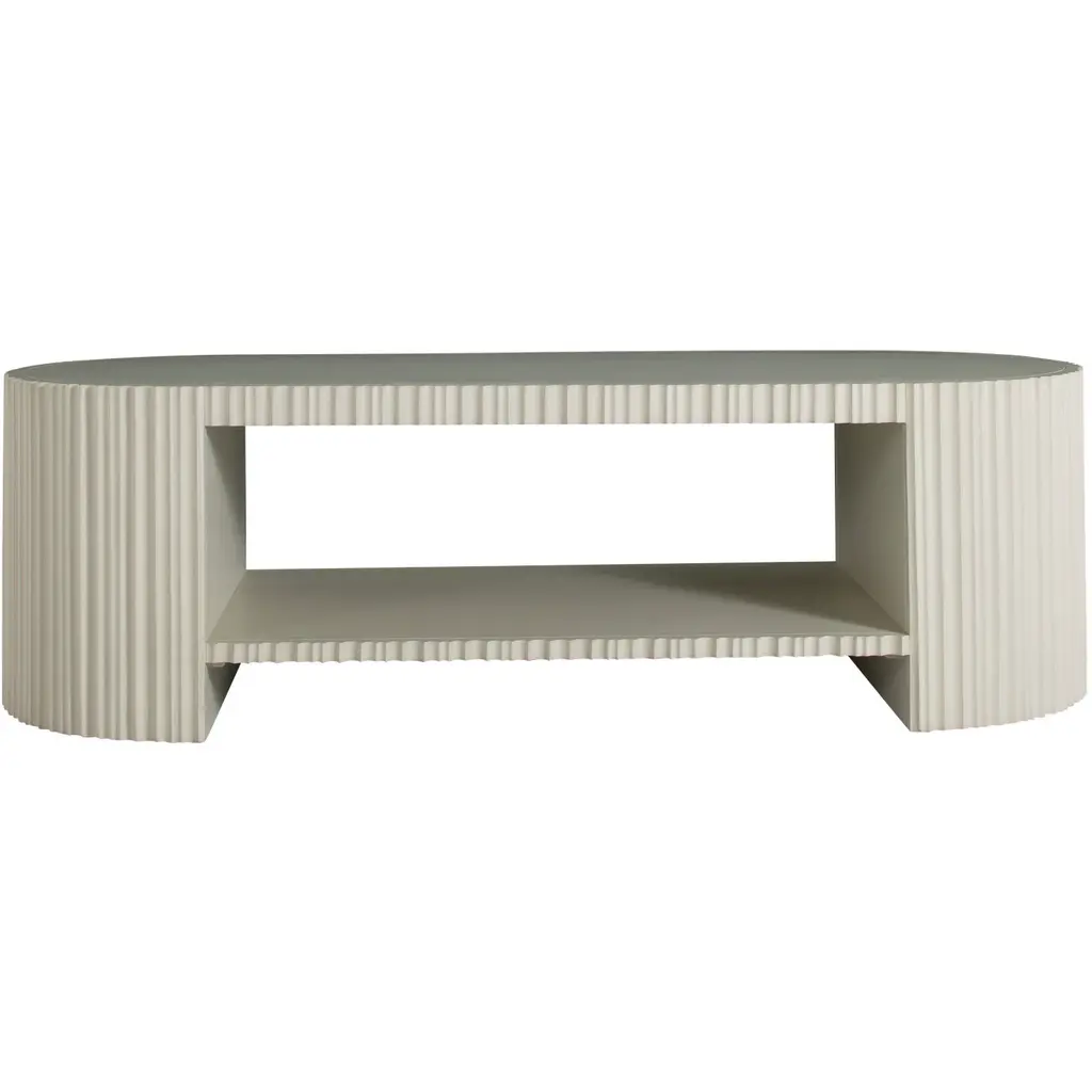 Embrace the contemporary allure of the Isadora Coffee Table, a minimalist marvel with a twist. Its smooth oval top is perfectly complemented by a rhythmic array of vertical ribbing along its sides, delivering texture and visual interest to its understated silhouette. Crafted for versatility, it features a second tier, ideal for organizing your favorite reads or showcasing decor. The table's crisp sesame white hue allows for seamless integration into any interior design scheme, providing a modern touch while offering practical space solutions for your living area. The Isadora is not just furniture, but a piece of modern art that combines everyday functionality with the purity of sculptural form.