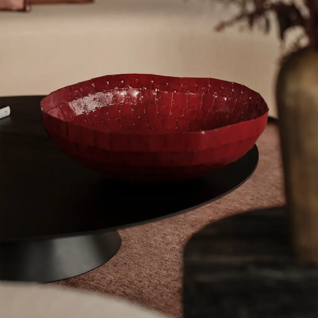 This elegant round coffee table brings an element of subtle minimalism into the home. A short round base tapering towards the top supports the round flat top bearing a striking brushed texture across its surface. The entire piece is crafted in larch wood that has been painted with a matte black lacquer. This table adds a touch of simple sophistication in any room. It is ideal in a living room setting as a functional object, but is striking enough to be used for decorative purposes like the display of sculptures or other decorative objects.