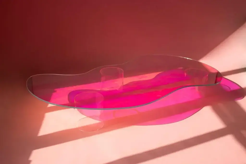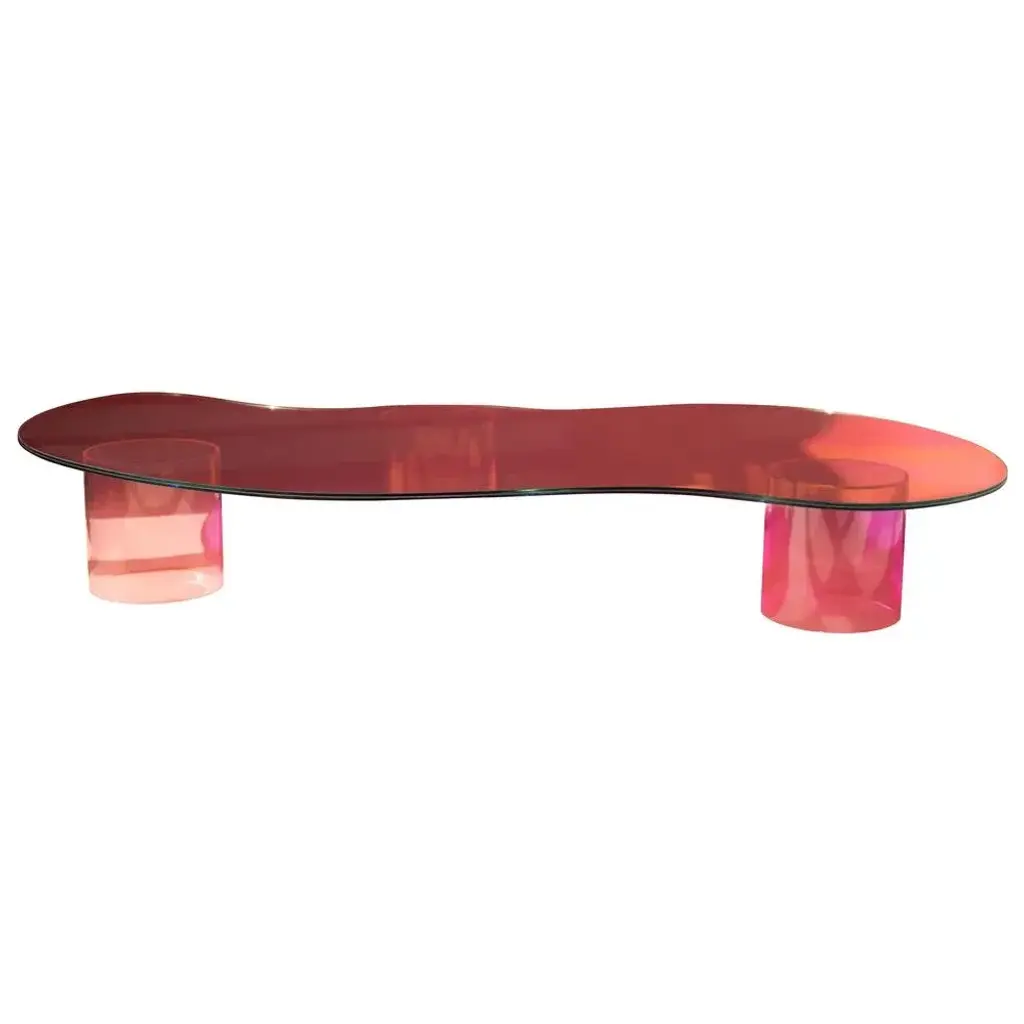 Isola coffee table by brajak vitberg. Dimensions: d 195 x w 100 x h 27 cm. Materials: laminated dichroic glass + plexi glass. The table is made out of glass with satin finish and dichroic insert. The colors in this kind of satin finish are more subtle but still change depending on point of view. Due to the size of this particular table, on site assembly is required. this piece is attributed to the mentioned designer/maker. It has no attribution mark and no official proof of authenticity, however it is well documented in design history. I take full responsibility for any authenticity issues arising from misattribution