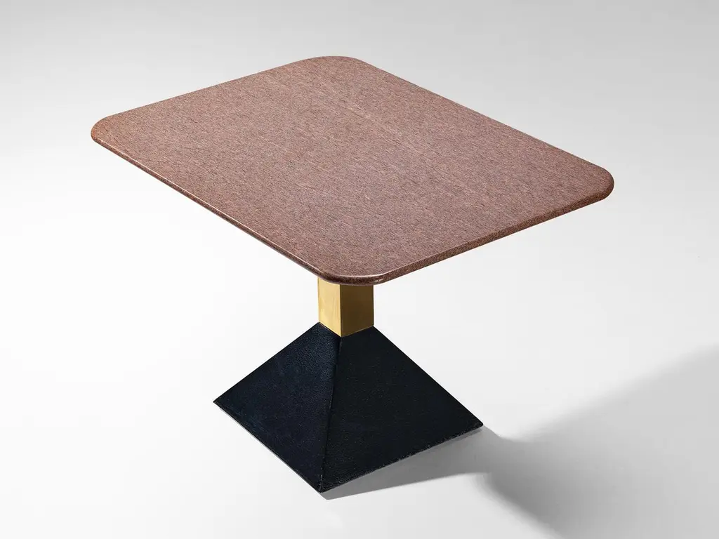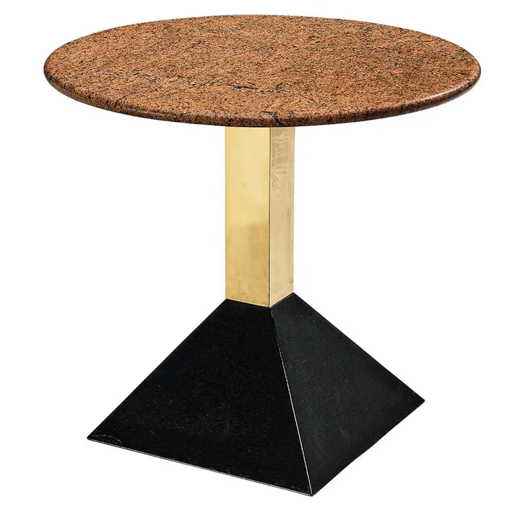 Coffee tables, granite, brass, black lacquered steel, Italy, 1980sThese Italian side tables showcase a rectangular brown granite tabletop with a striking, vivid surface. The granite rests on a brass pedestal, which finishes with a black trapezoidal base. The combination of contrasting textures and shapes creates a visually captivating piece, perfectly reflecting the essence of Italian postmodern design.Kindly note that these pieces are in good, used condition. The price listed is per item.