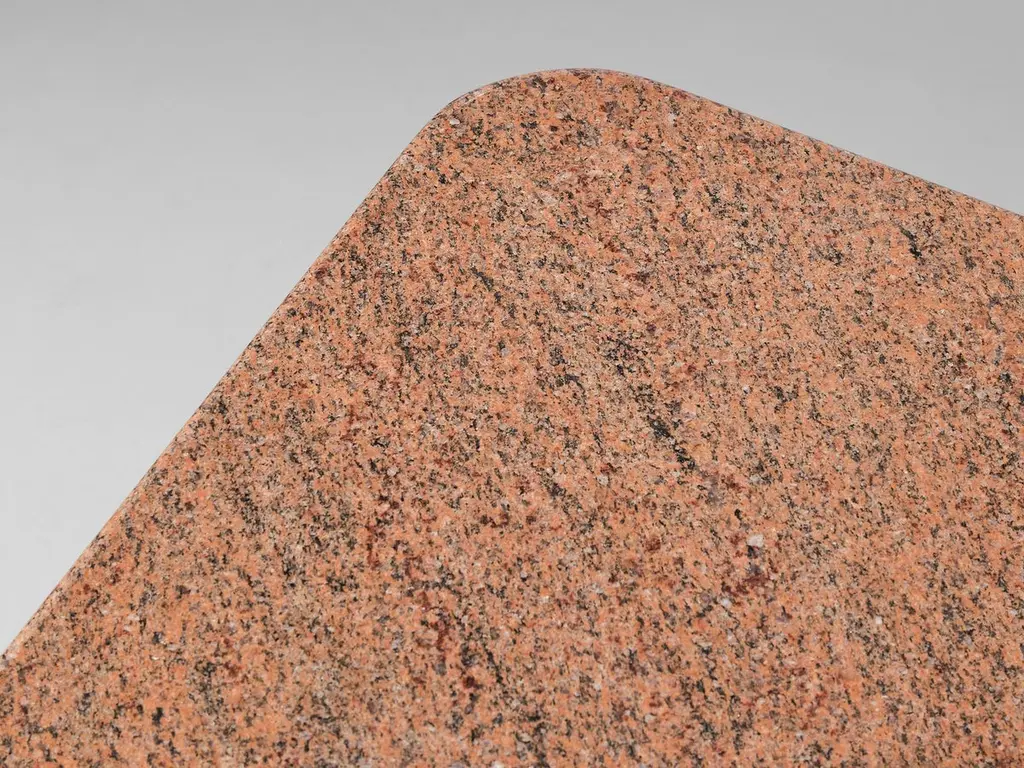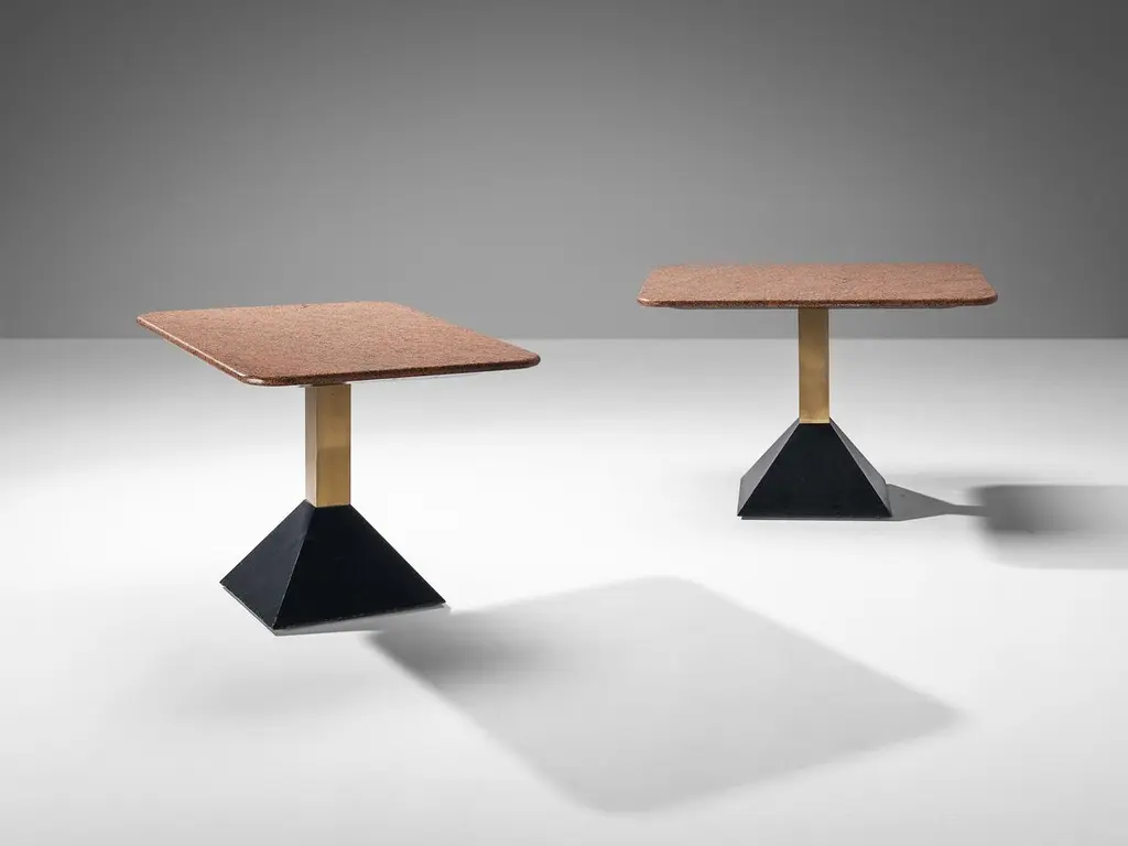 Coffee tables, granite, brass, black lacquered steel, Italy, 1980sThese Italian side tables showcase a rectangular brown granite tabletop with a striking, vivid surface. The granite rests on a brass pedestal, which finishes with a black trapezoidal base. The combination of contrasting textures and shapes creates a visually captivating piece, perfectly reflecting the essence of Italian postmodern design.Kindly note that these pieces are in good, used condition. The price listed is per item.