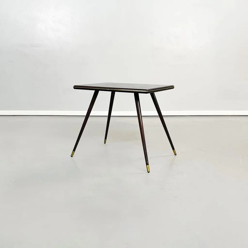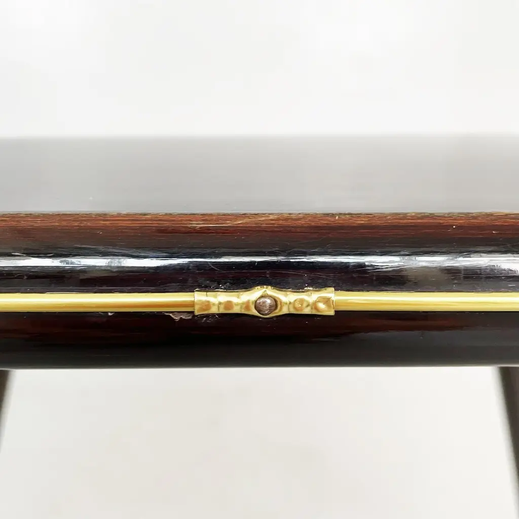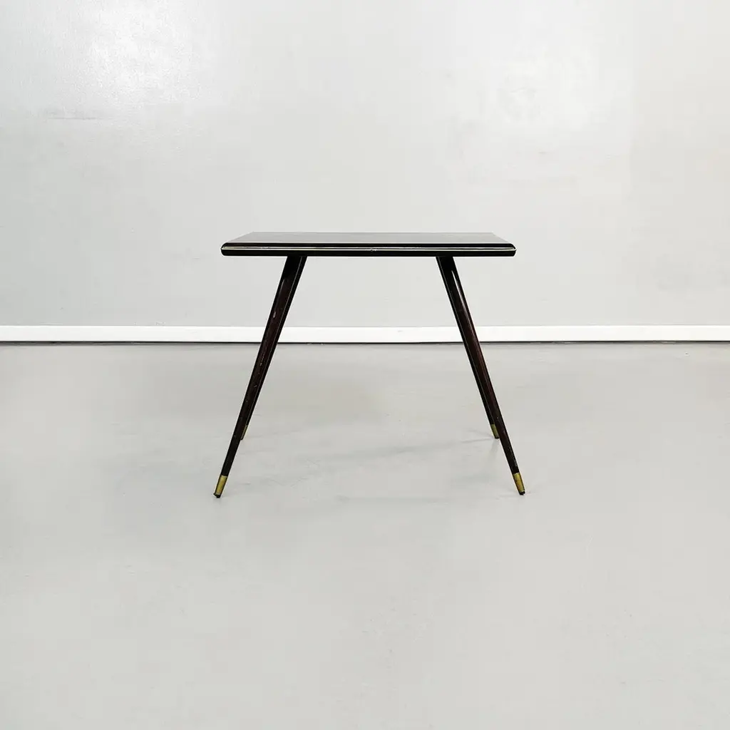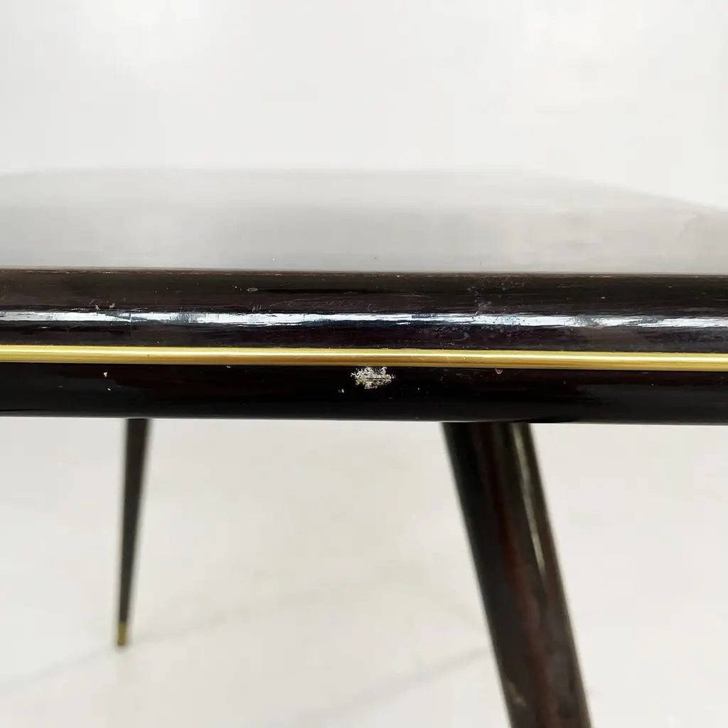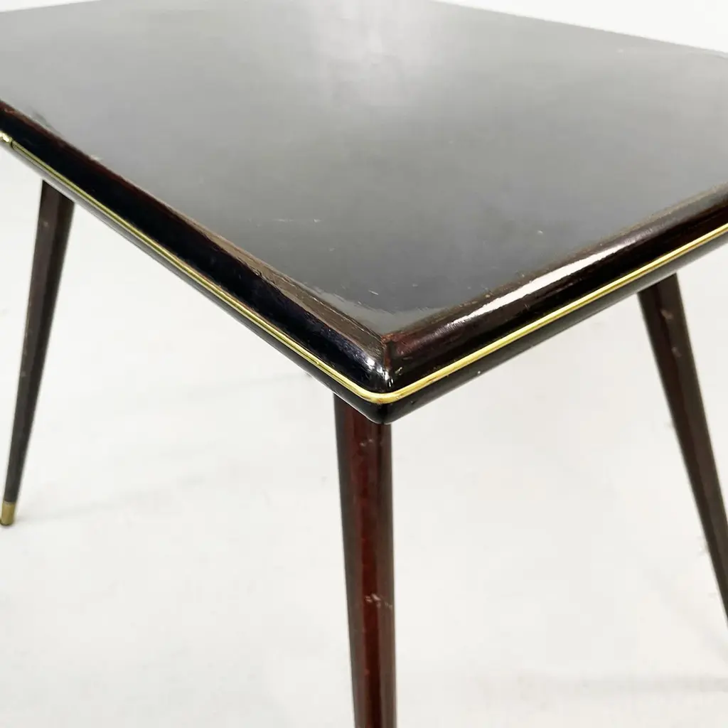 Italian Mid-Century Modern Rectangular coffee table in wood and brass, 1950sRectangular coffee table in glossy dark wood. The top is rectangular with rounded edges, profiled by a thin brass line. The cylindrical legs are made of wood with brass ferrules.1950sGood condition, it has several marks on the wooden top. Signs of time on the tips.Measurements in cm 70x47x55h.
