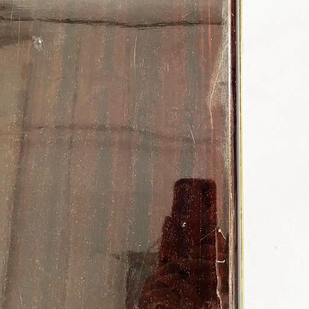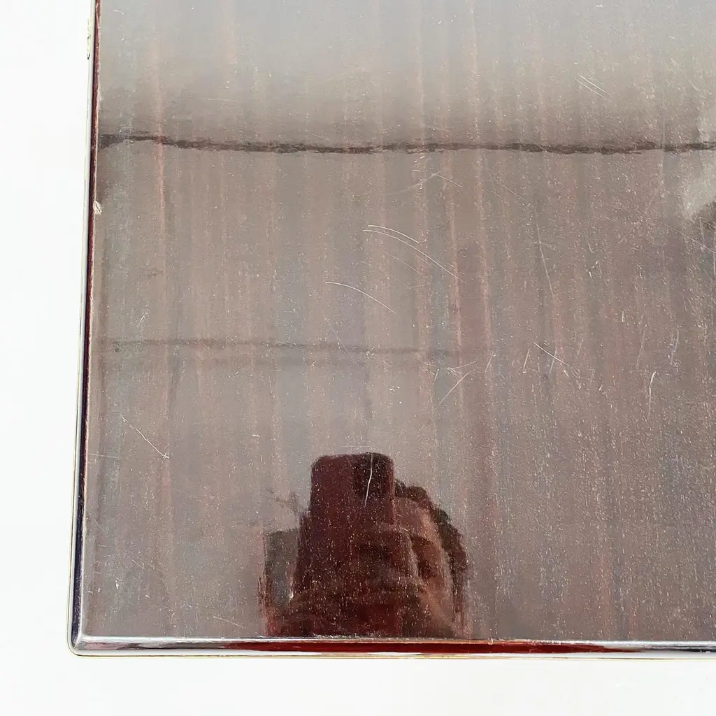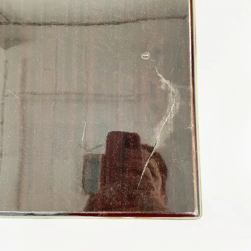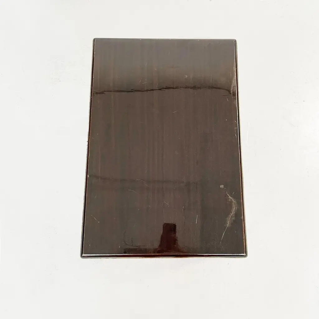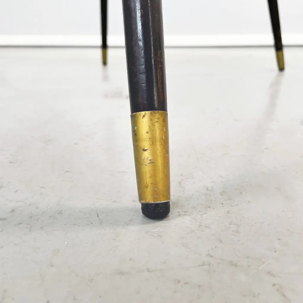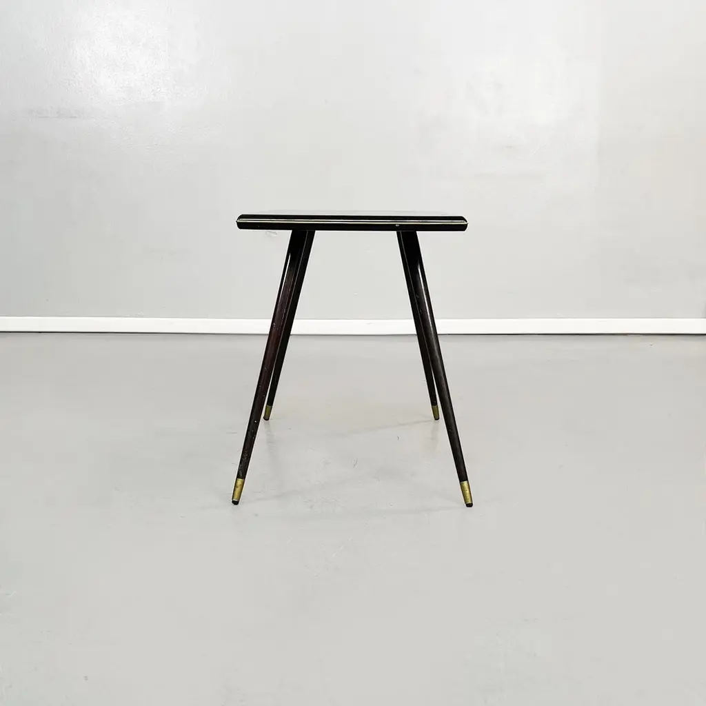 Italian Mid-Century Modern Rectangular coffee table in wood and brass, 1950sRectangular coffee table in glossy dark wood. The top is rectangular with rounded edges, profiled by a thin brass line. The cylindrical legs are made of wood with brass ferrules.1950sGood condition, it has several marks on the wooden top. Signs of time on the tips.Measurements in cm 70x47x55h.