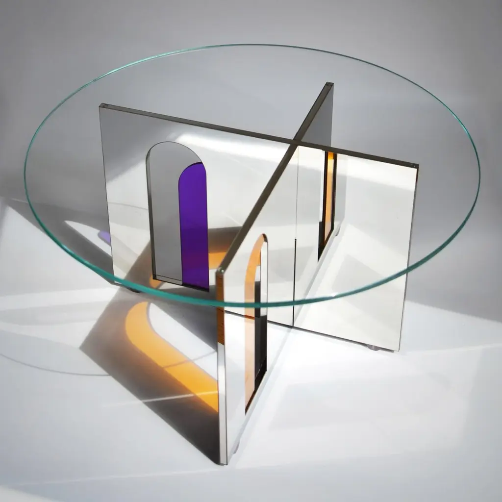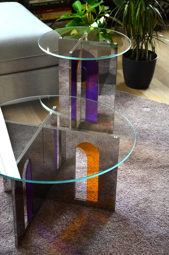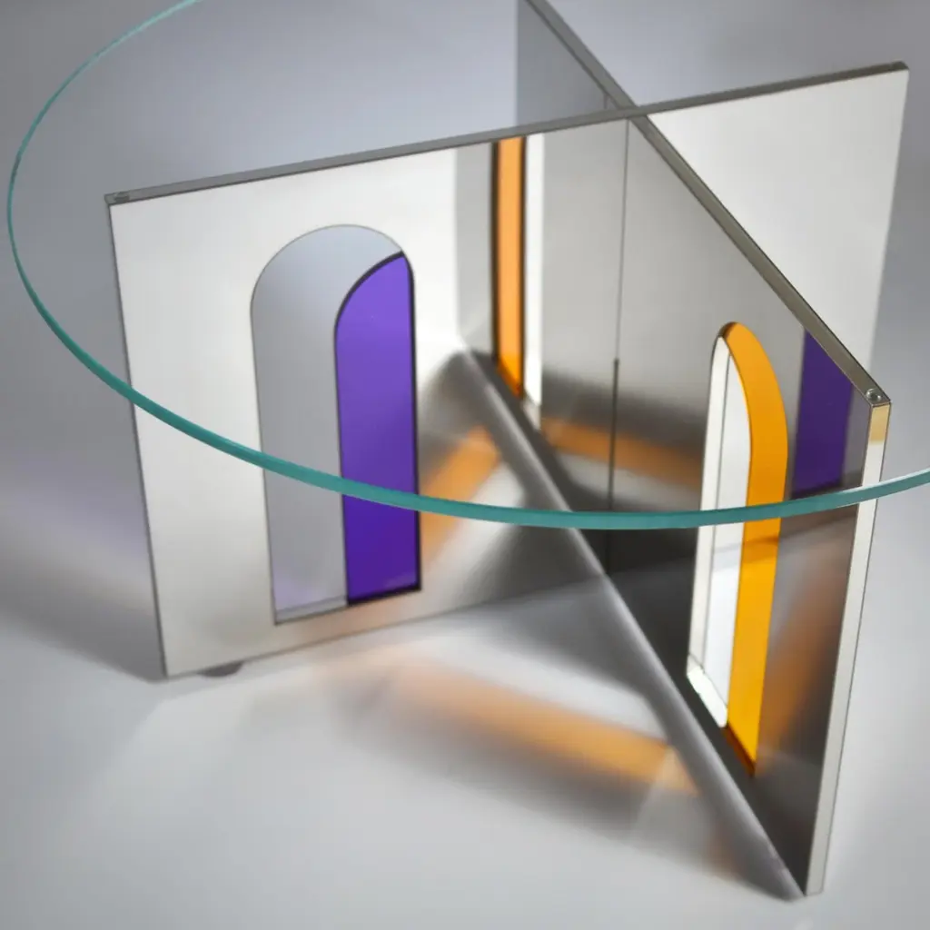 A door that leads to infinite others.The geometries of the Itaca coffee tables invite you to a journey without a destination, or rather where encounters, experiences and adventures are themselves the destination. The combination of the mirror steel surfaces and the colored glass inserts succeeds in blending styling with essentiality, elegance and contemporaneity for a piece able to suggest the pleasure to discover new things or just new forms of things already known.