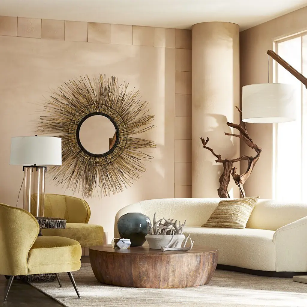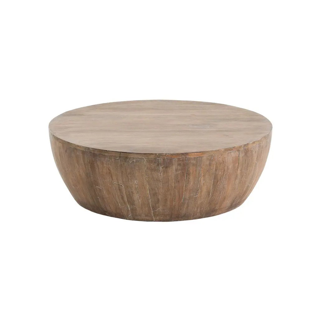 Narrow wood slats wrap up the sides of this gently curved round cocktail table. The top is solid wood and the entire table is finished in a new tobacco wash we developed specifically for this season. Combine with the Kai Bookshelf (4306) for a cohesive look.