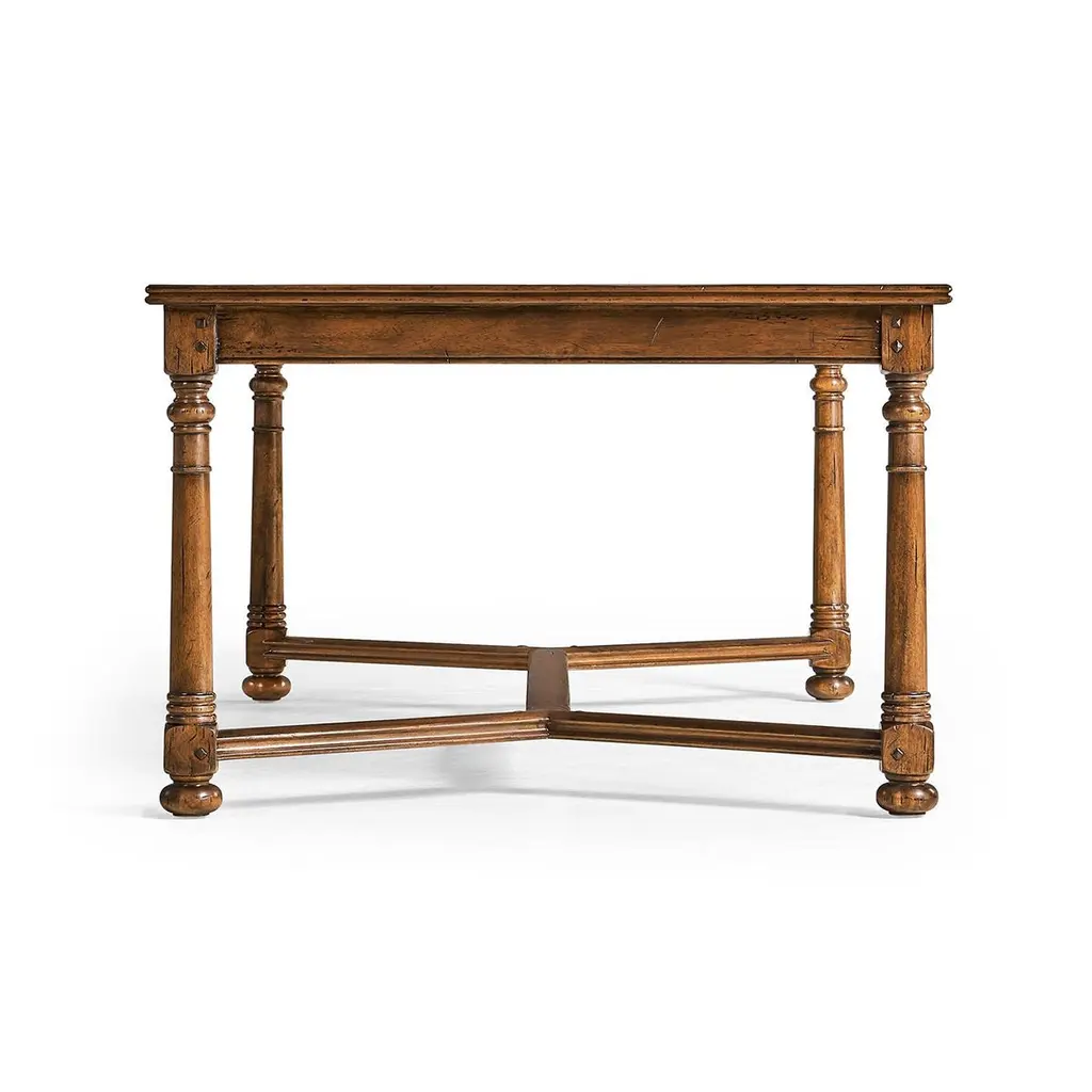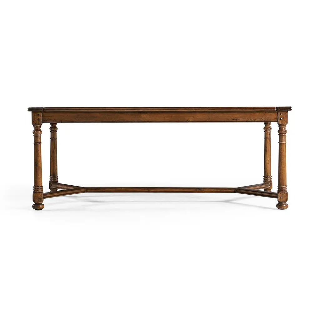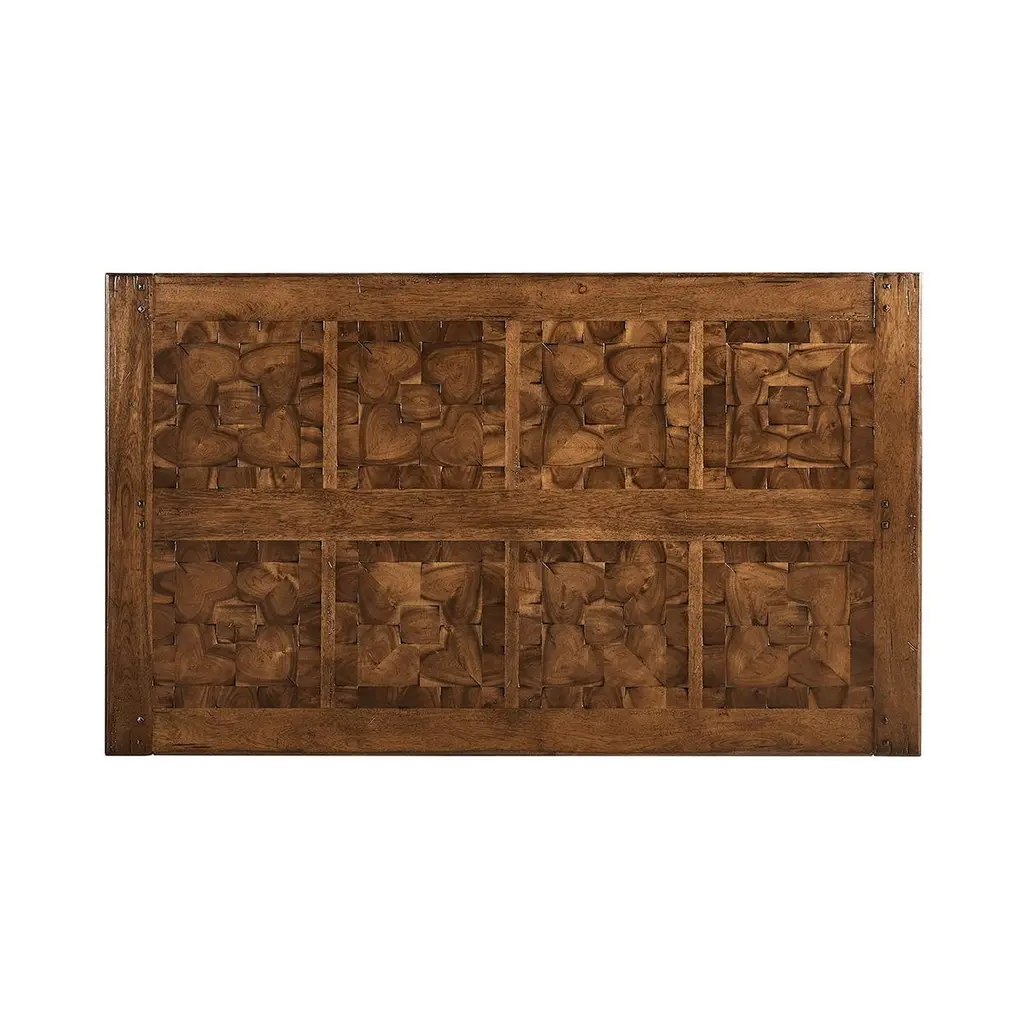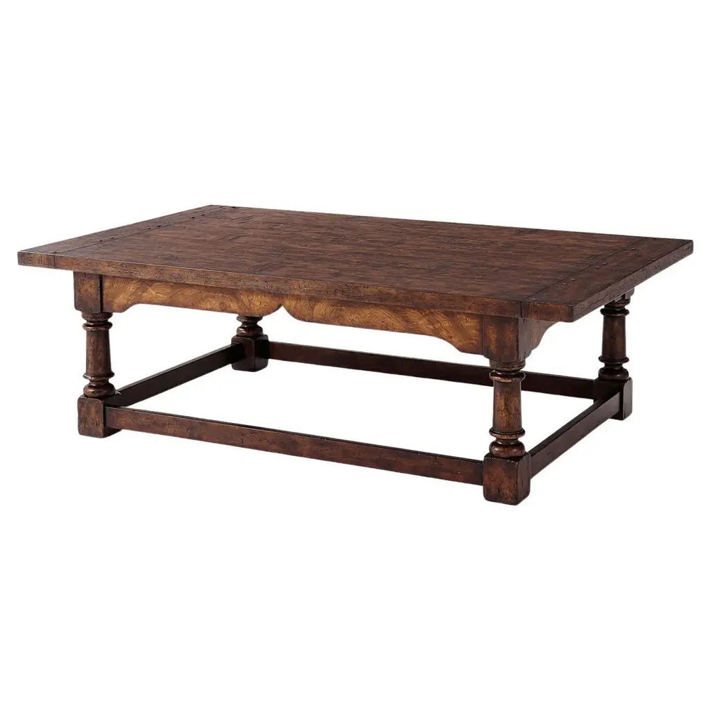 Crafted from rich acacia wood and finished in an elegant country walnut stain, this exquisite piece exudes sophistication. The inlaid parquet oyster veneer top adds a refined touch, showcasing intricate craftsmanship that speaks to its historical inspiration. Fully turned wood legs and a Y-style stretcher provide both aesthetic appeal and structural integrity, ensuring durability and longevity.Designed for those who appreciate classic elegance, this coffee table seamlessly blends into traditional and early English interiors. Whether placed in a grand sitting room or a cozy den, this stunning table brings an air of heritage and refinement to any setting.Dimensions: 54" W x 32" D x 21.125" H
