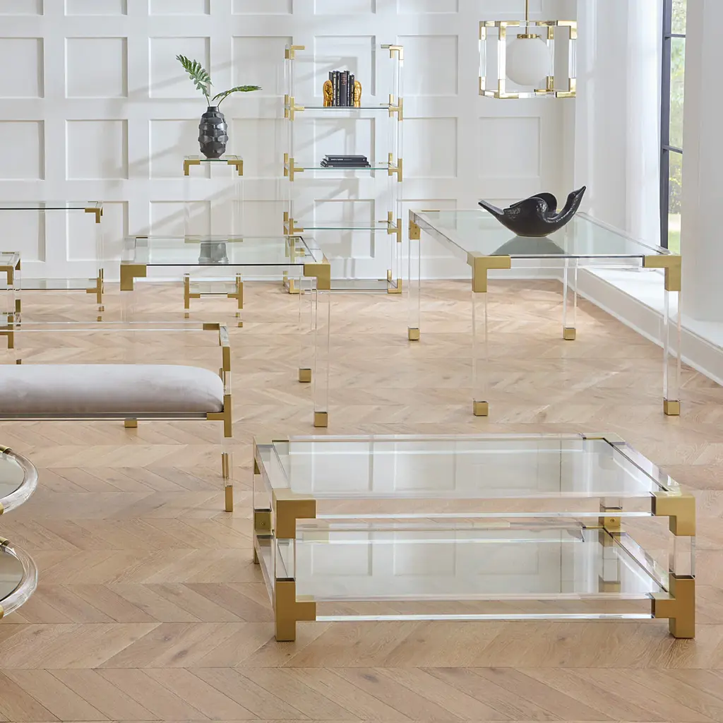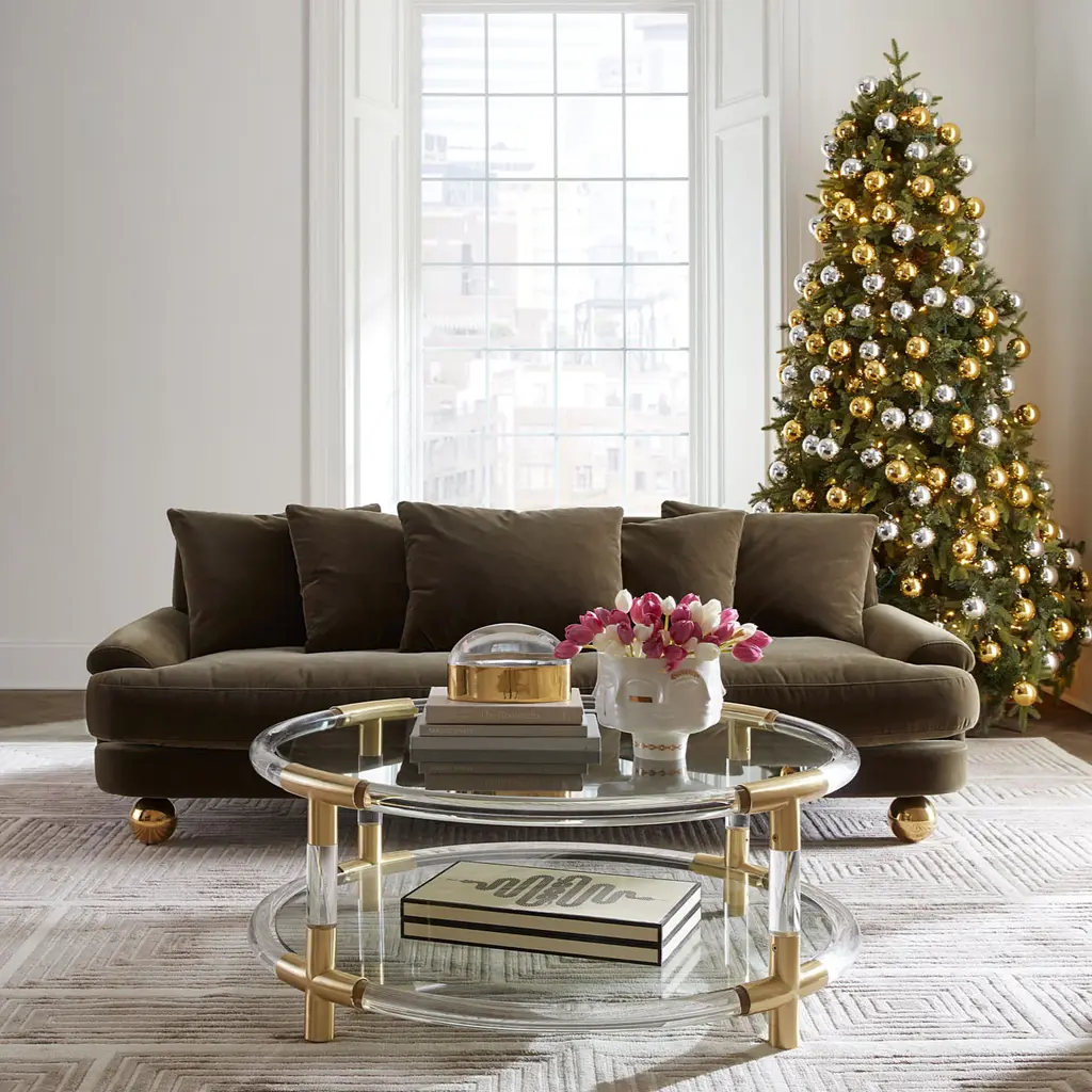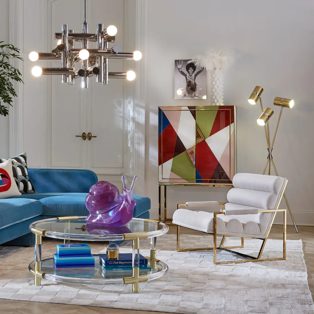 Clearly Cool. The perfect blend of simplicity and glamour, modern and traditional. In luxe clear acrylic with brushed brass accents, our Jacques Round Cocktail Table is our low and loungey bestseller with a new rounded edge—the perfect companion for a curved sofa. Its second shelf creates plenty of space for storing and styling your favorite books and baubles. Big presence, weightlessly transparent.