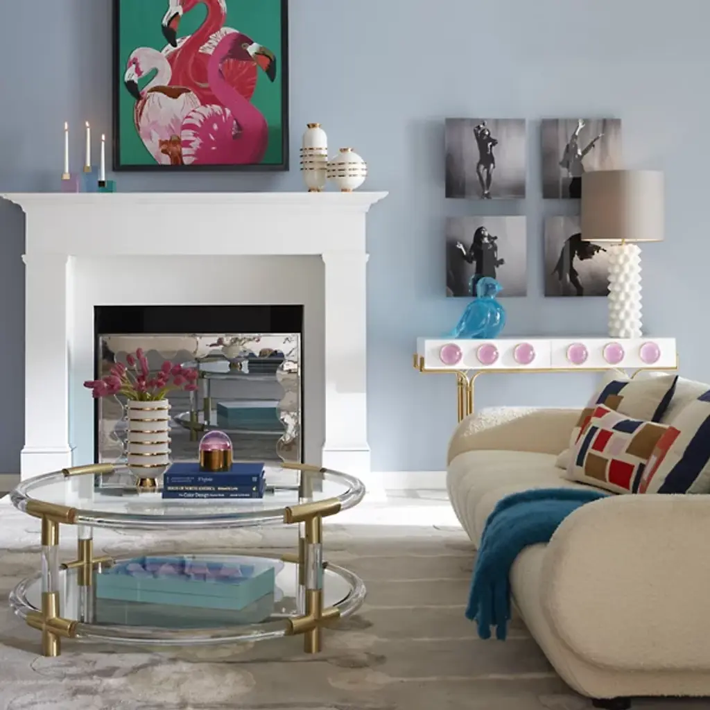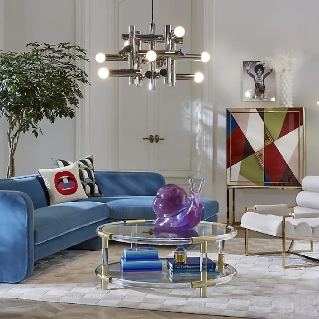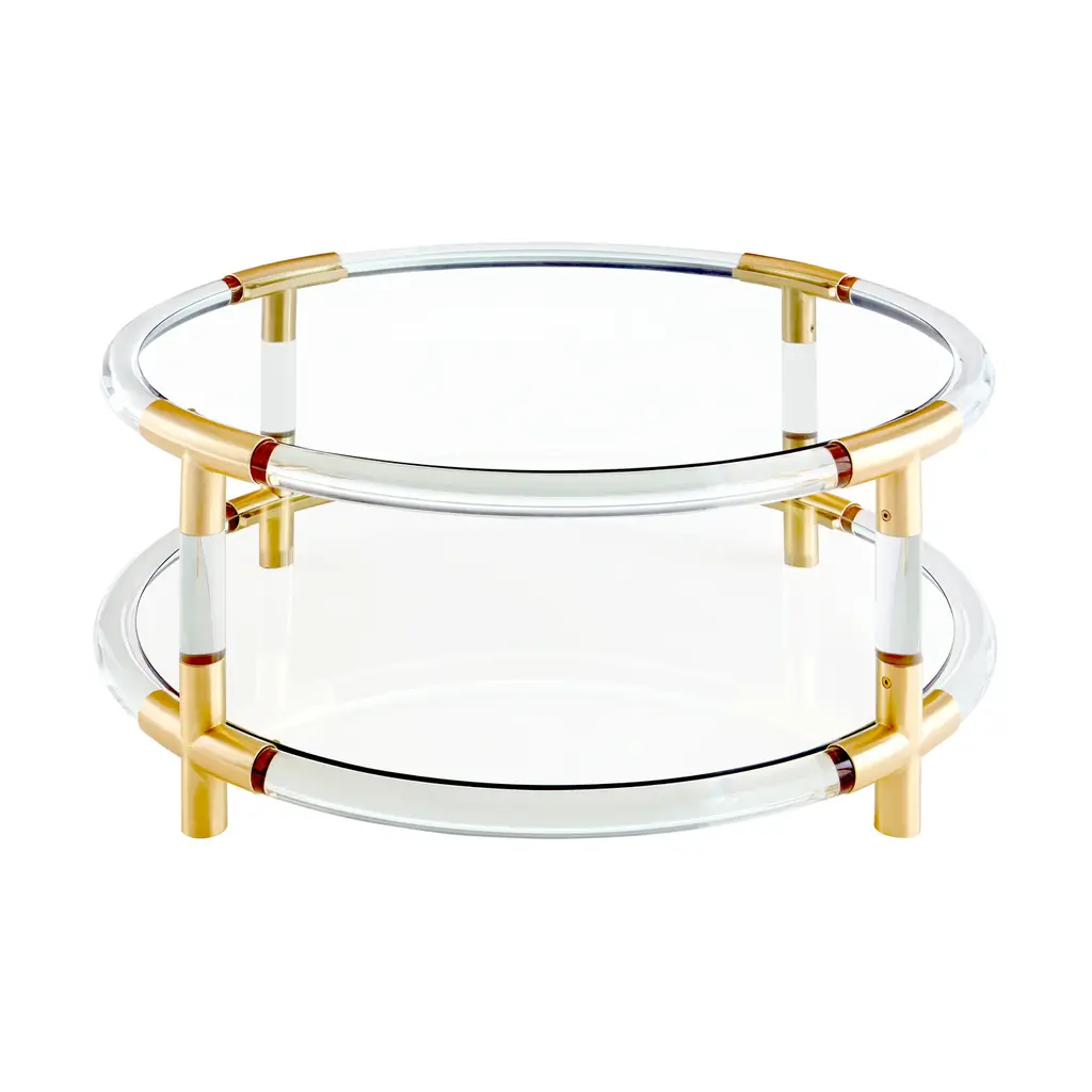 The Jacques Round Cocktail Table by Jonathan Adler gives your living space a touch of mid-century modern style. Your table’s frame takes on a ring-like formation which gives this piece a silhouetted quality. The finely cut glass surfaces which line the table’s tiered framework draw in your eye while facilitating the placement of your cocktail glasses. The Jacques Round Coffee Table is a beautiful focal point for your living room when placed in between your sofa and indoor chair.