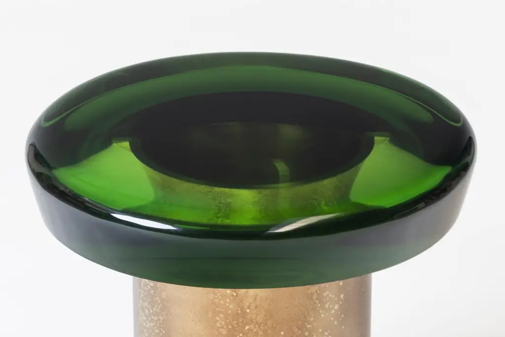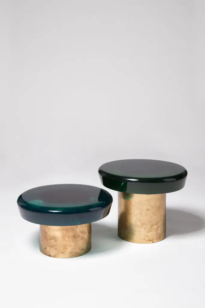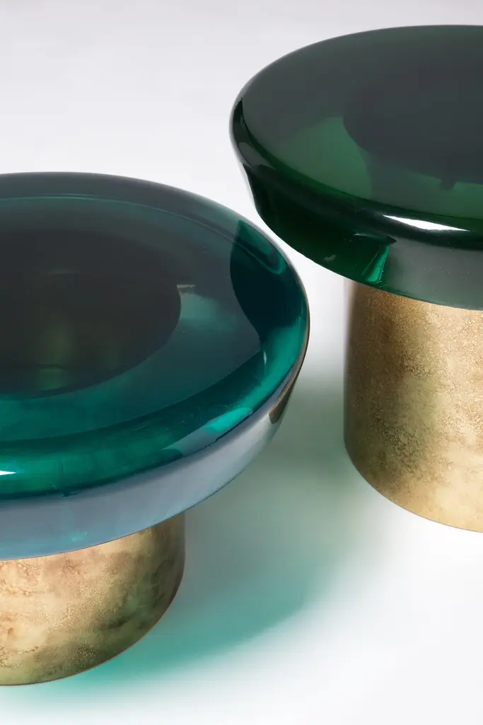 Jade coffee table features ethereal transparency and a reflective surface that plays naturally with light. The brightly colored table top rests on a cylindrical brass base, whose distinctive veining is achieved through a skillful etching treatment. The juxtaposition of the ever-unique shades — meticulously blended in our atelier — and the golden accents makes it a precious piece. All of the epoxy resin tops belonging to this series are designed to be interchangeable.SIZE: L 50, W 50, H 46, Ø 50 cmDraga&Aurel resin colors are absolutely unique as they are handmade using a combination of different shades.