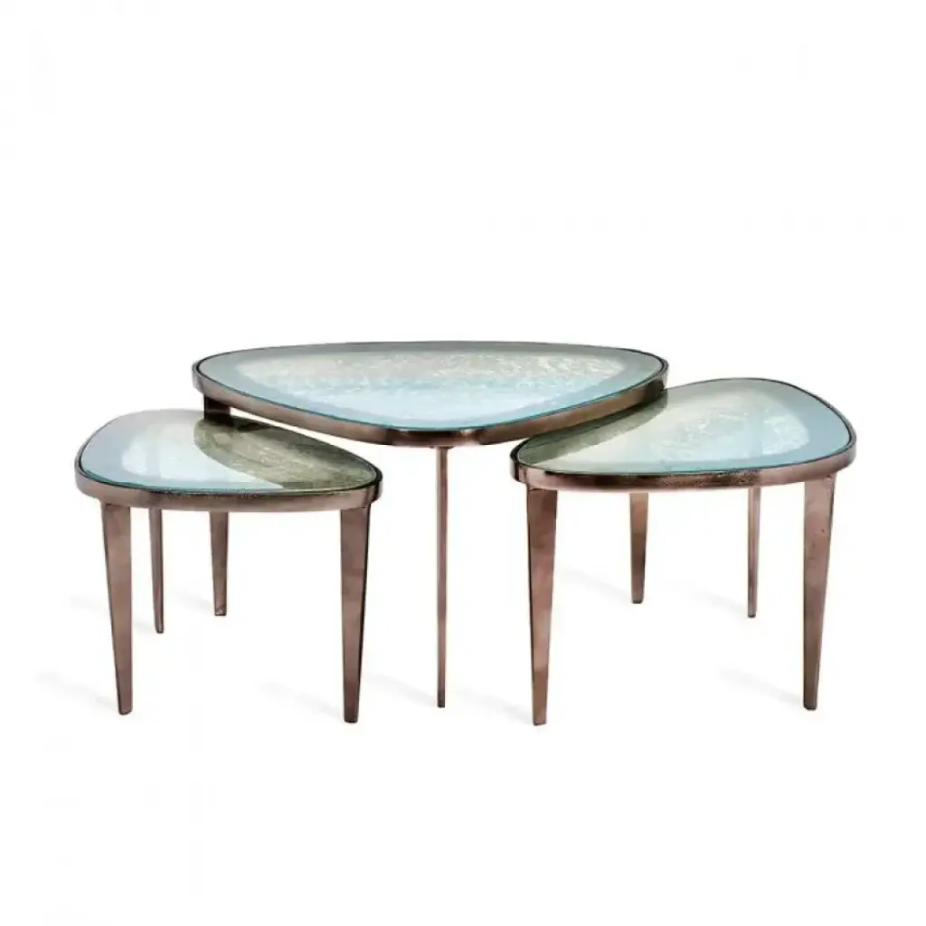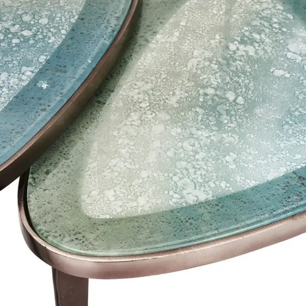 Blue/grey reactive glass and an aluminum base in an antique nickel finish turn the eye-catching Jan Bunching Cocktail Tables into a dramatic trio.