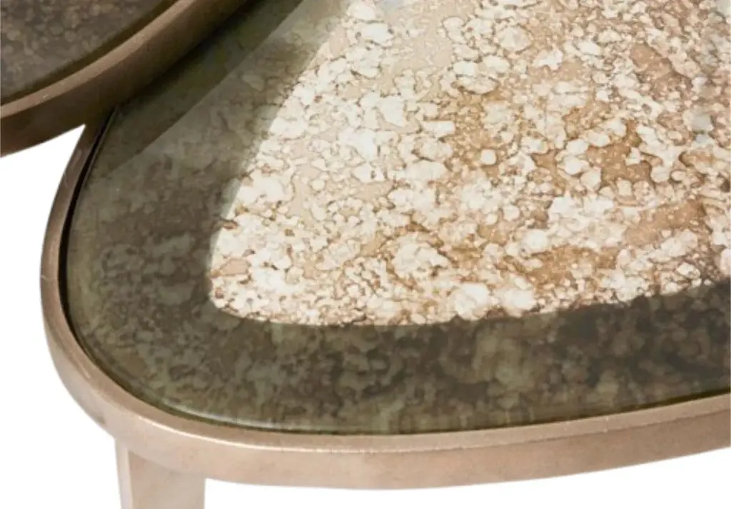 A striking addition, this trio of cocktail tables gives an elegant look with its thin base and reactive glass tops. In an eye-catching twilight bronze, it adds a rich color, styling well into living rooms.