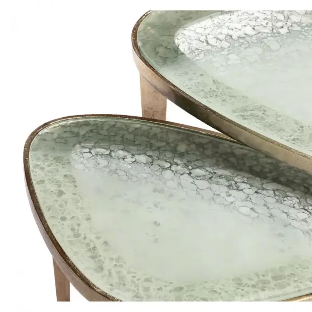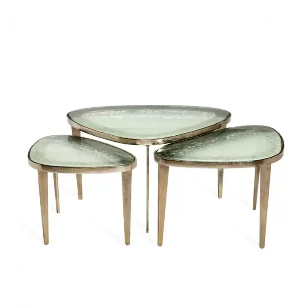 Tinted grey sky glass and an aluminum base in a champagne brass finish turn the eye-catching Jan Bunching Cocktail Tables into a dramatic trio.