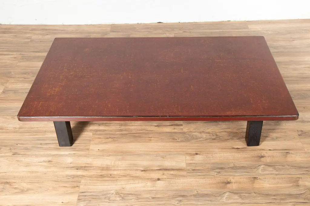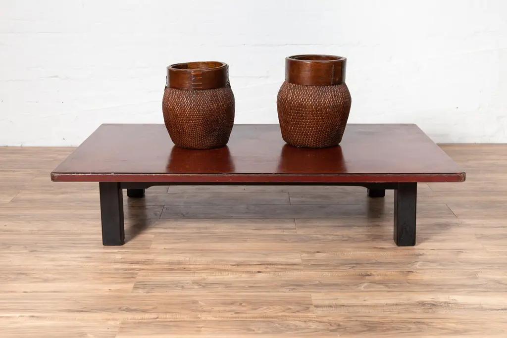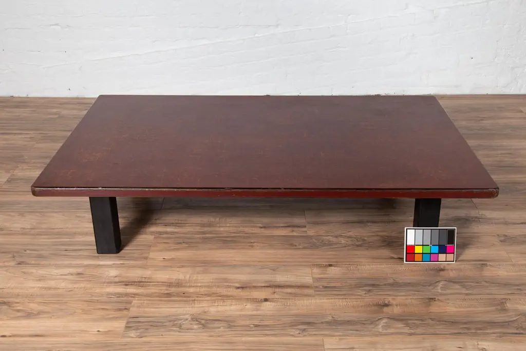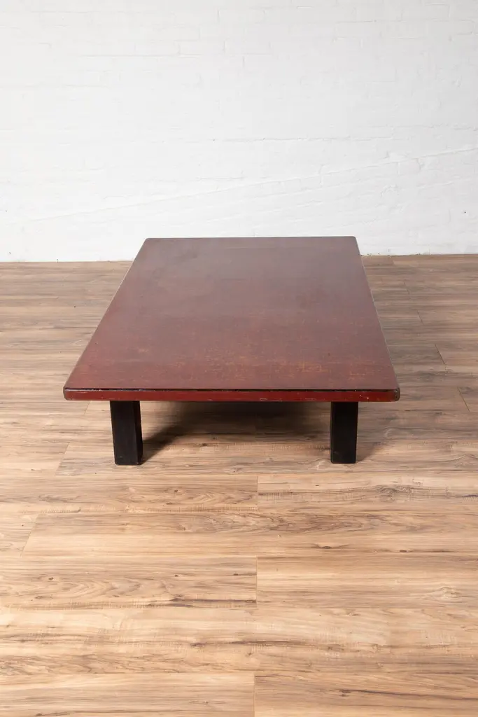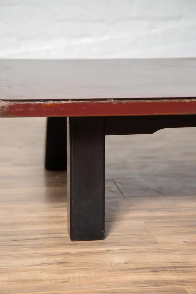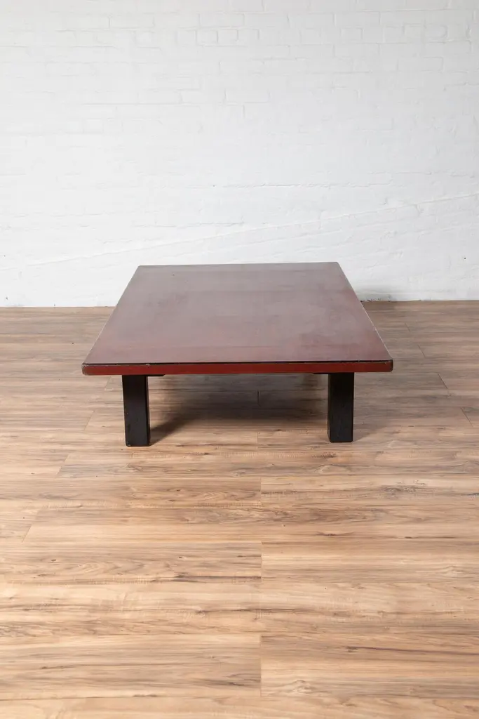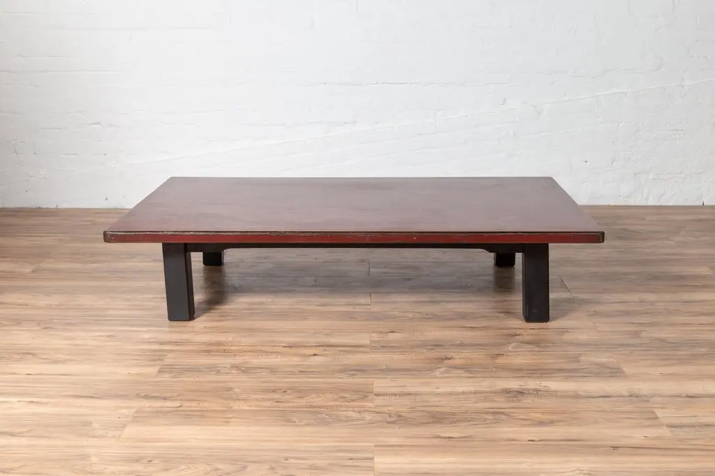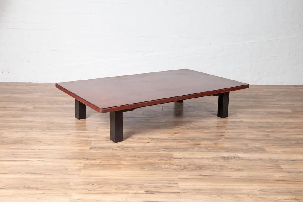A Japanese Taisho period coffee table from the early 20th century, with Negora lacquer and black legs. Born in Japan during the first quarter of the 20th century, this charming coffee table was originally found in a coffee shop (you will indeed notice some glass marks on the top). This rectangular top, adorned with Negora lacquer, is resting on four straight black legs. With its clean lines and lovely contrasting colors, this antique Japanese Taisho period coffee table will bring an elegant touch to any living room, sunroom or family room.