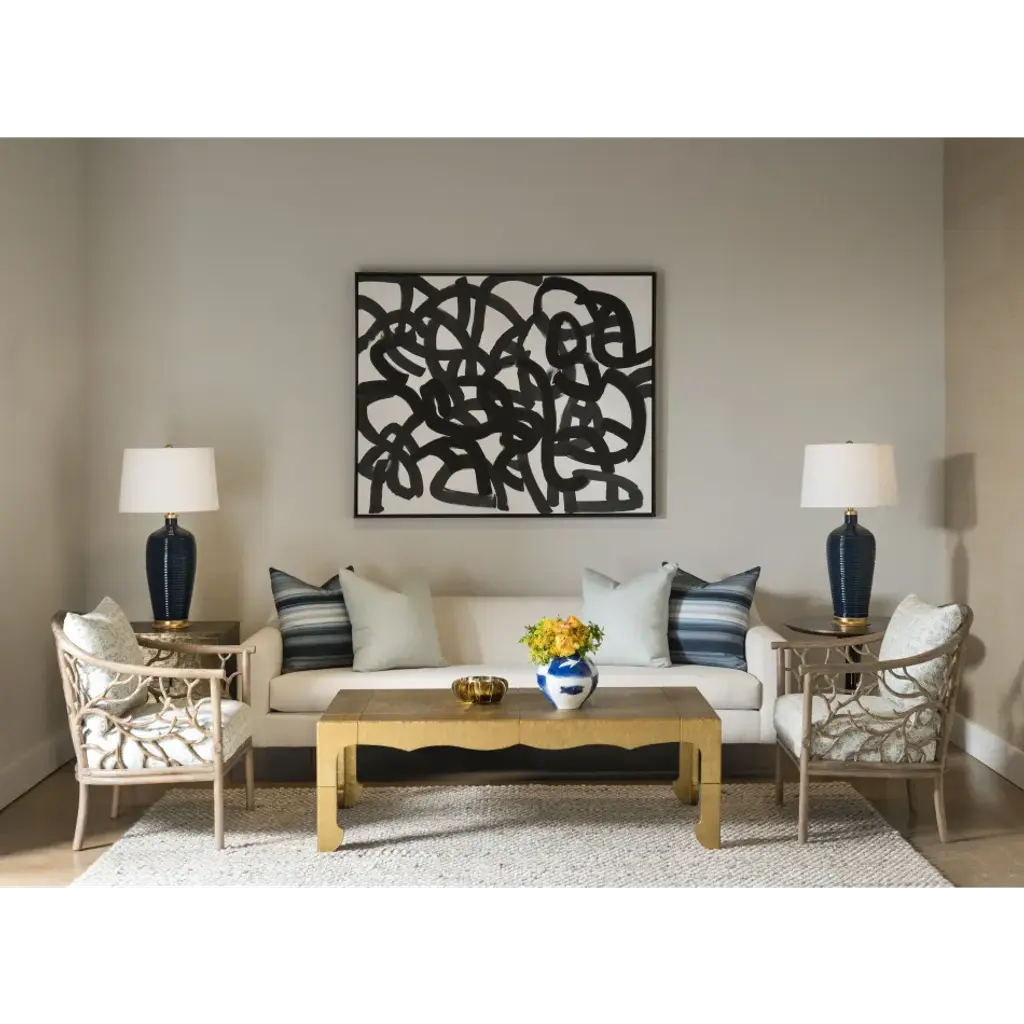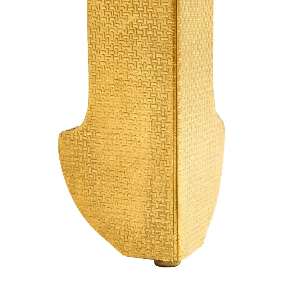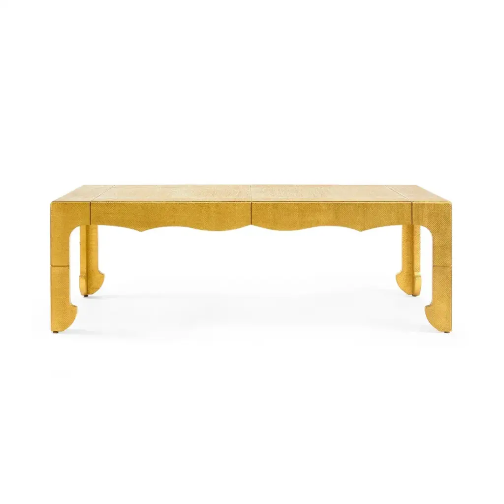 The Jaques Coffee Table radiates regal antiquity with a wink of old school glamour. Inspired by the opulence of Hollywood Regency design, the glitzy furnishing can add understated swank to even the most buttoned-up decor schemes or play up its grand impression where more is more. Its silhouette is marked by the elegant curvature of its table apron and gracefully formed Chow-style feet. A series of seams create a geometric effect on its surface, which has been richly finished in a repoussé pattern of hand-worked brass, topped with a sheen of lacquer. Like a silver screen star, the Jaques can play a range of roles.