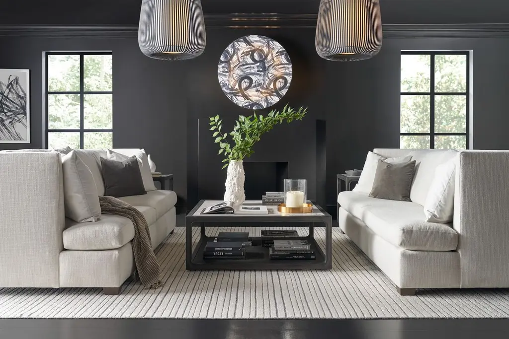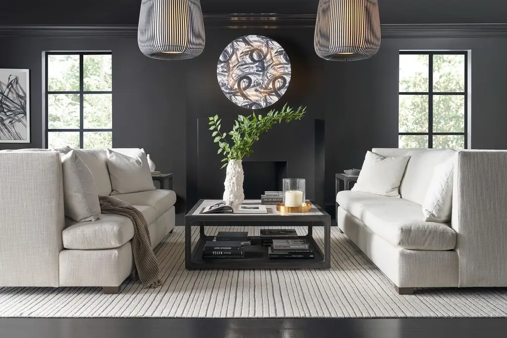 The Jemma Cocktail Table showcases chic refinement with an inset stone top, offering a slender, yet impactful silhouette that anchors the living space with contemporary grace.