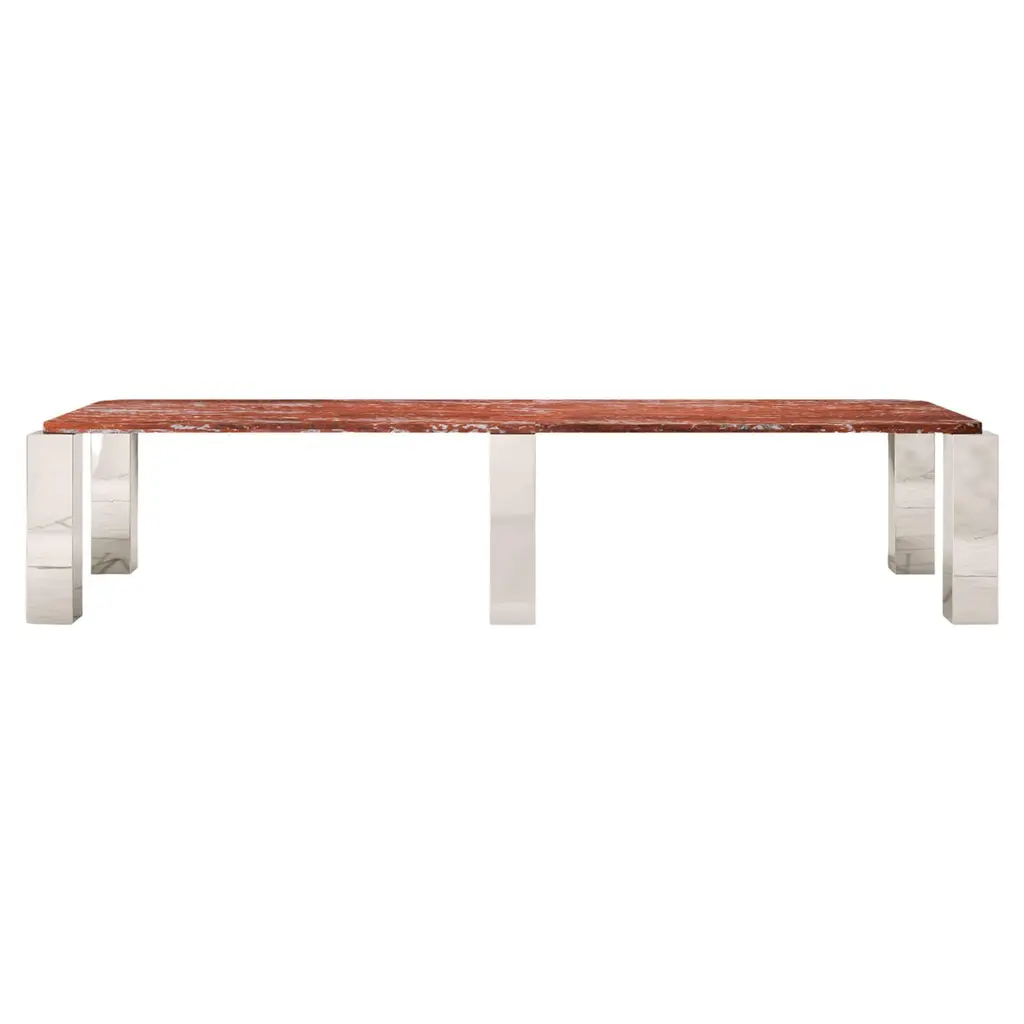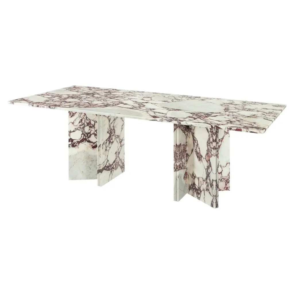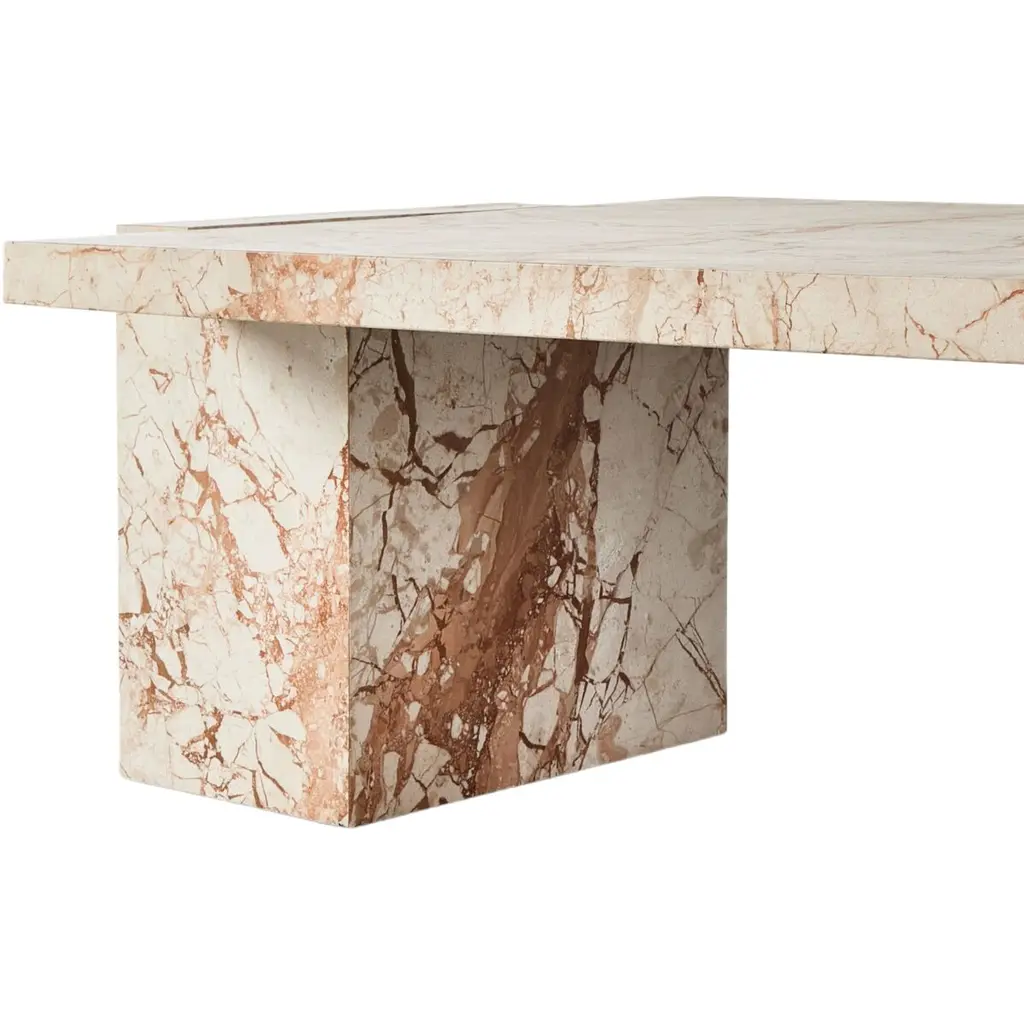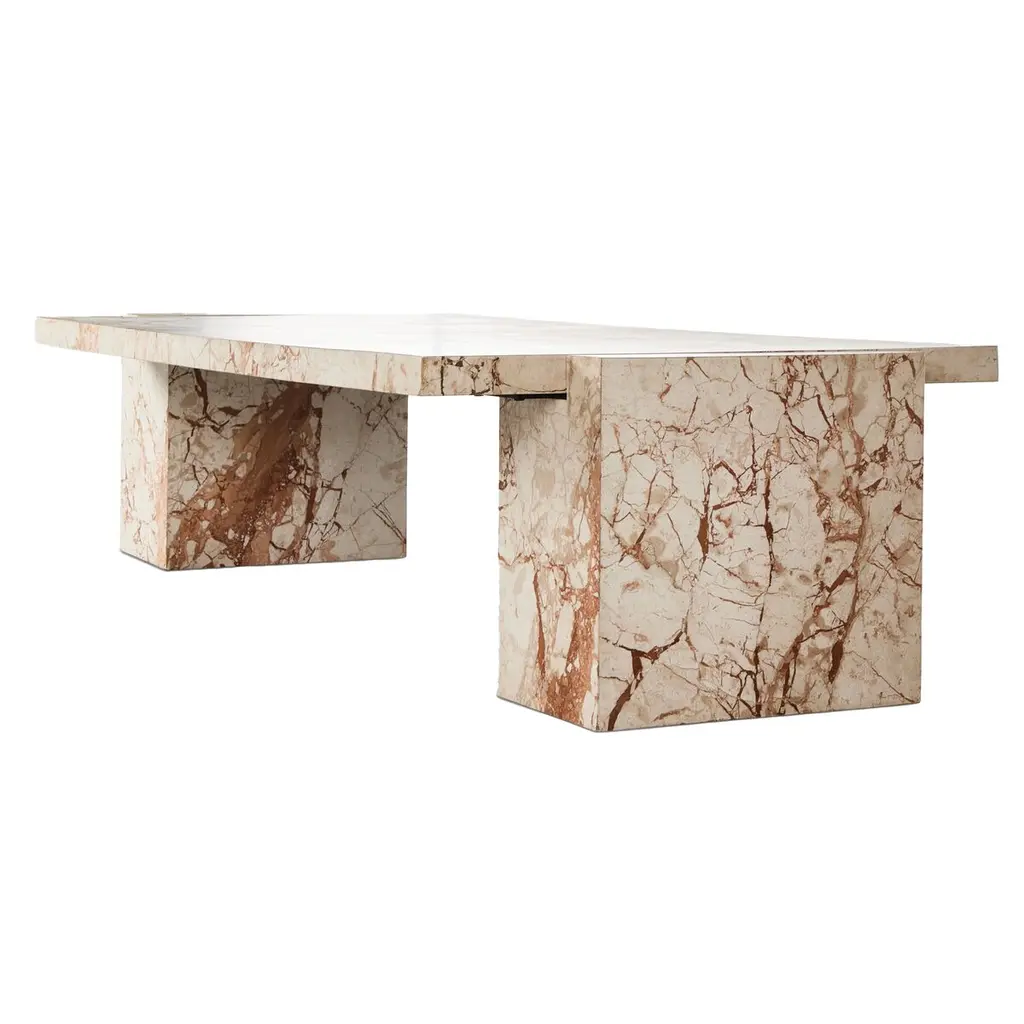Solid marble sheets are laminated to create cubed cradle bases for a thick-cut tabletop. Heavy veining and natural swirls speak to the nature of marble, with each piece being entirely unique.
