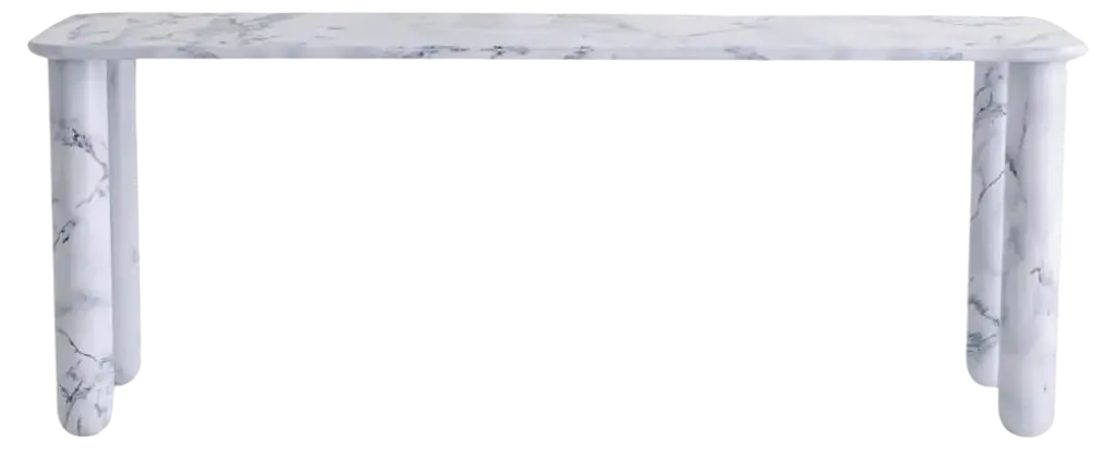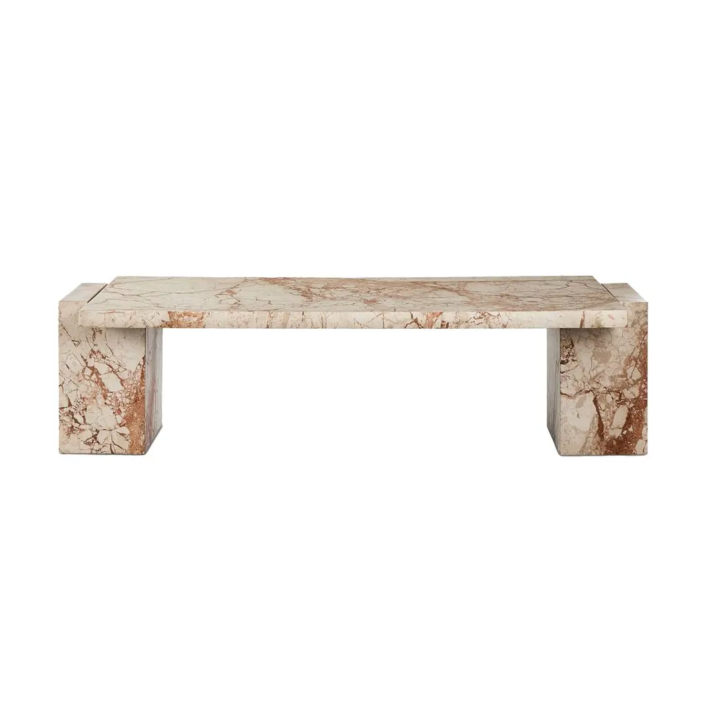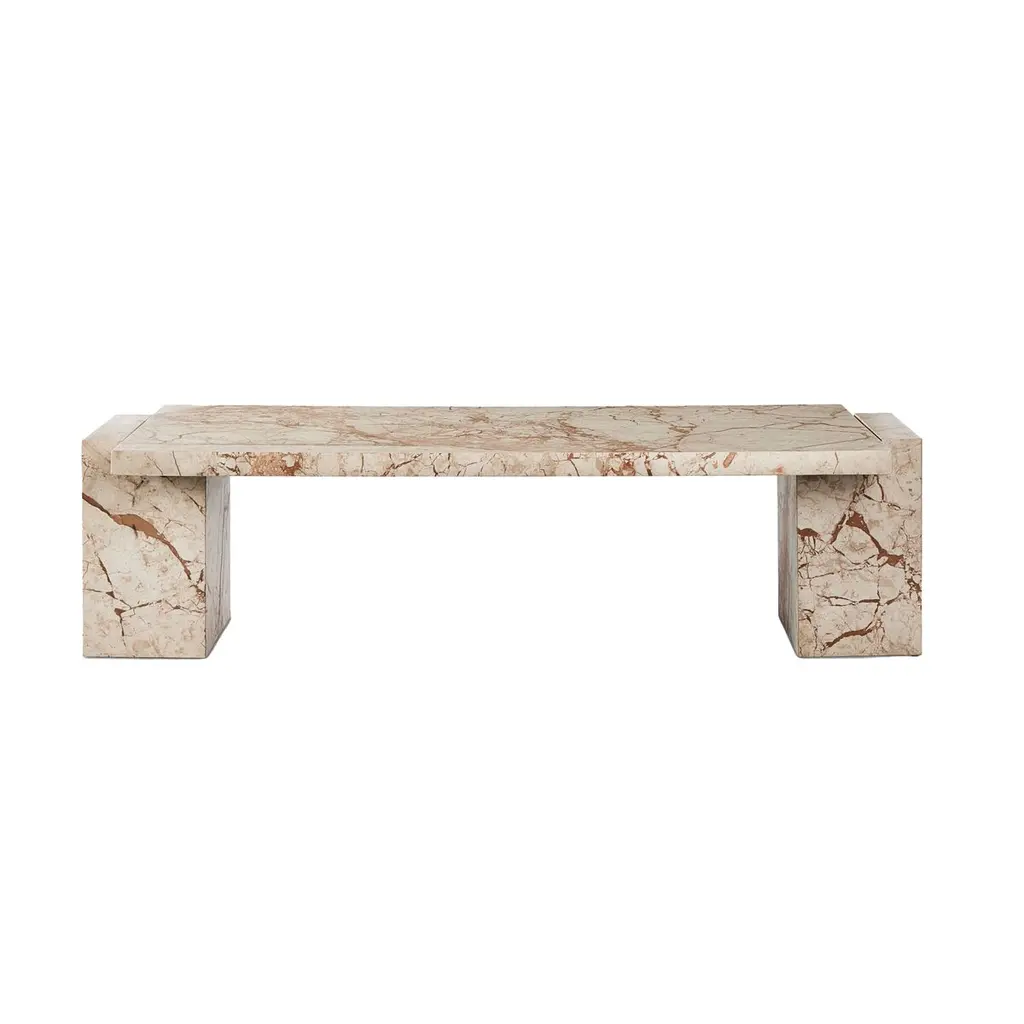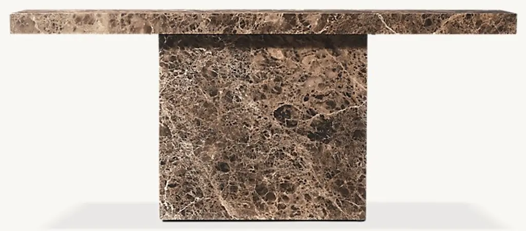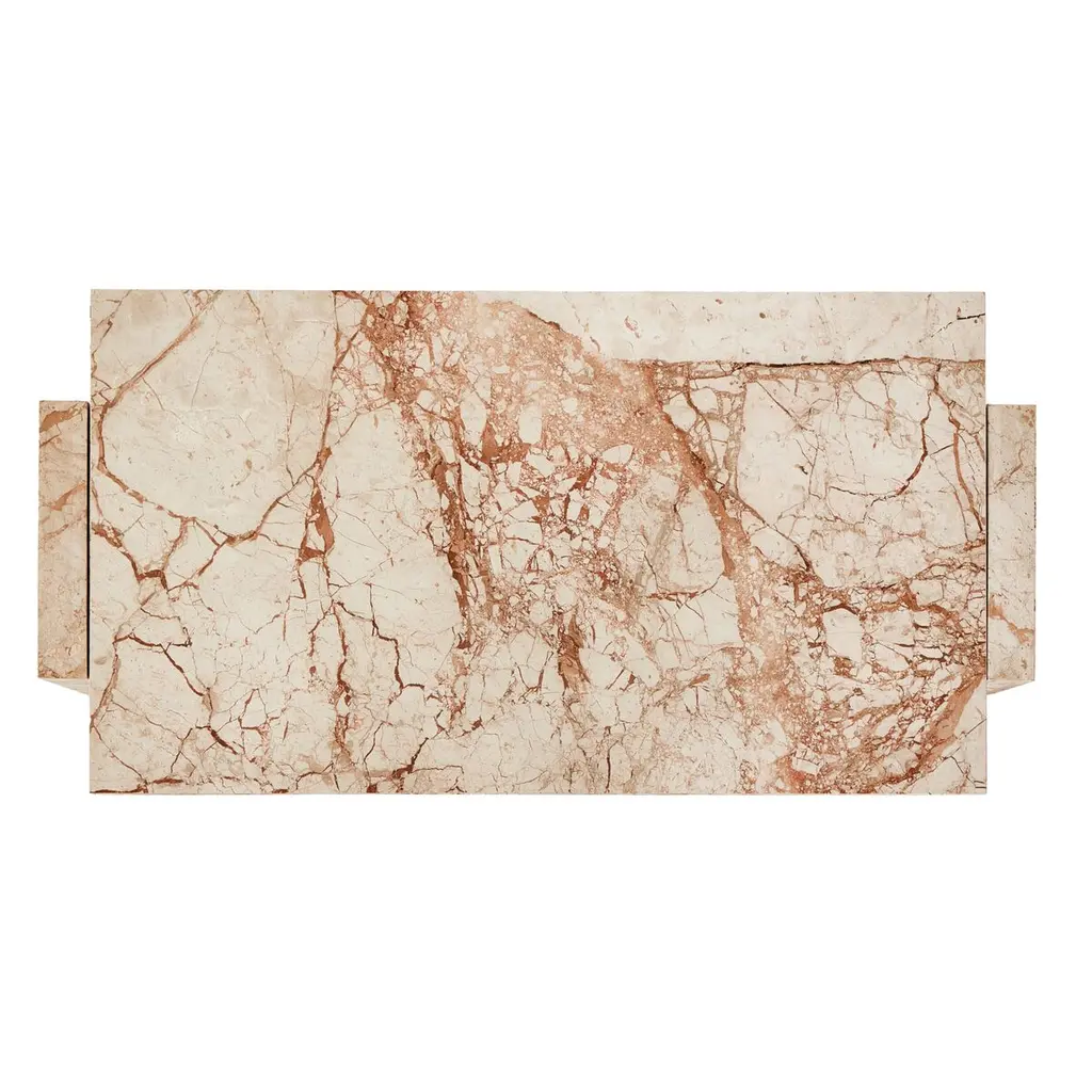 Solid marble sheets are laminated to create cubed cradle bases for a thick-cut tabletop. Heavy veining and natural swirls speak to the nature of marble, with each piece being entirely unique.