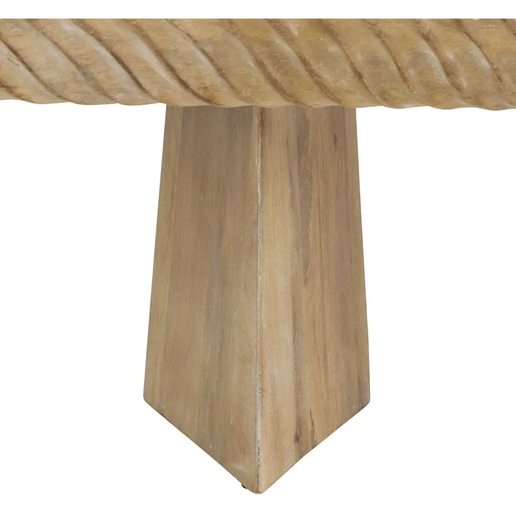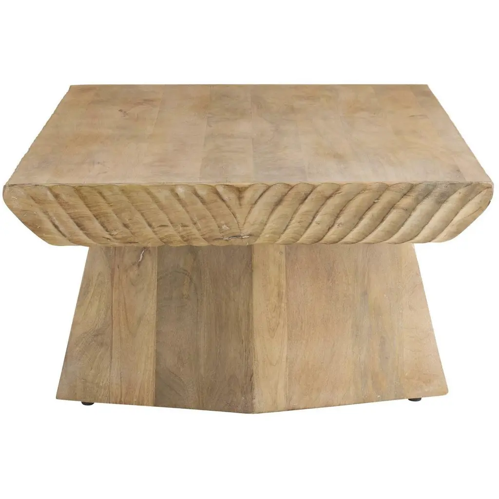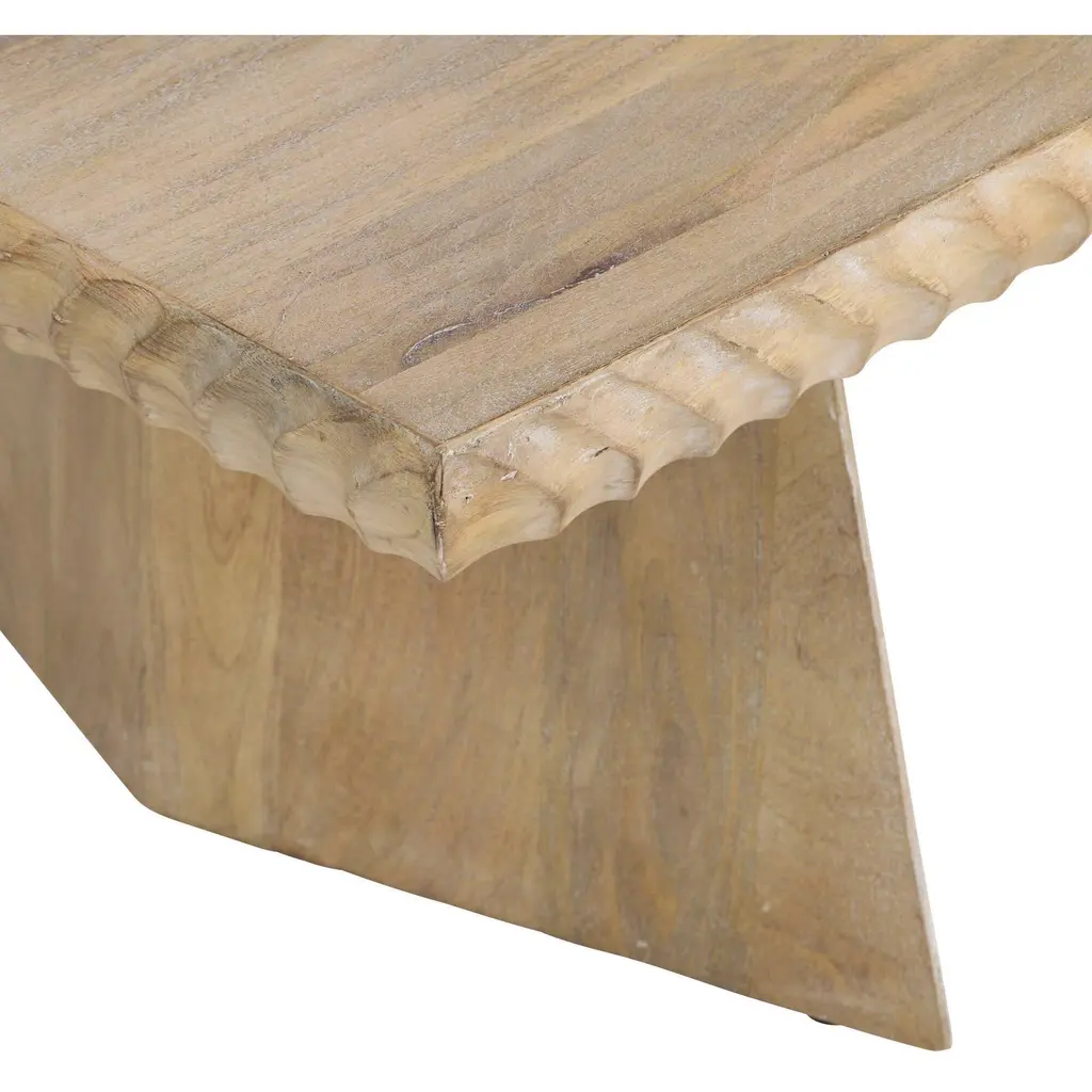 The details of Spanish wood carvings influenced the ridged edges of our substantial handcrafted cocktail table. Crafted of mango wood in a washed tobacco shade, it is accented with sturdy legs in a triangular shape. Finish will vary.