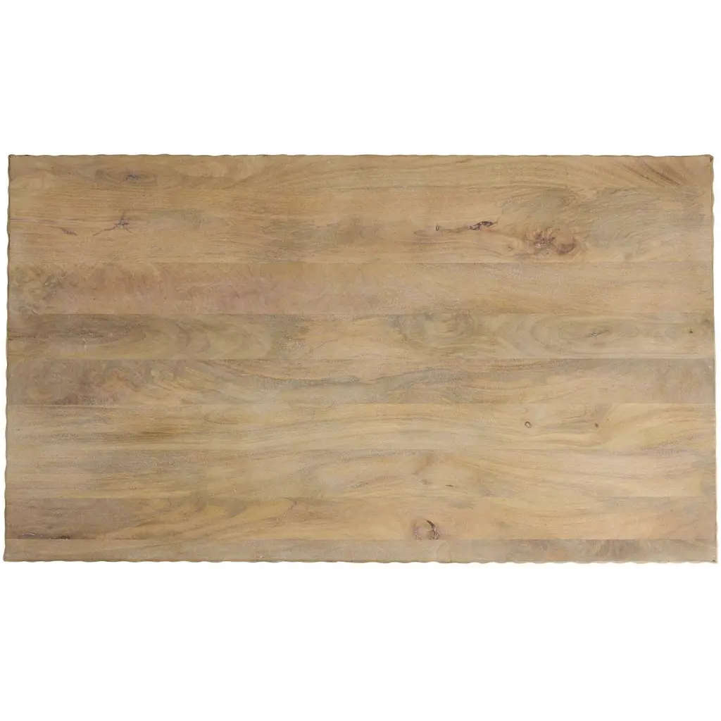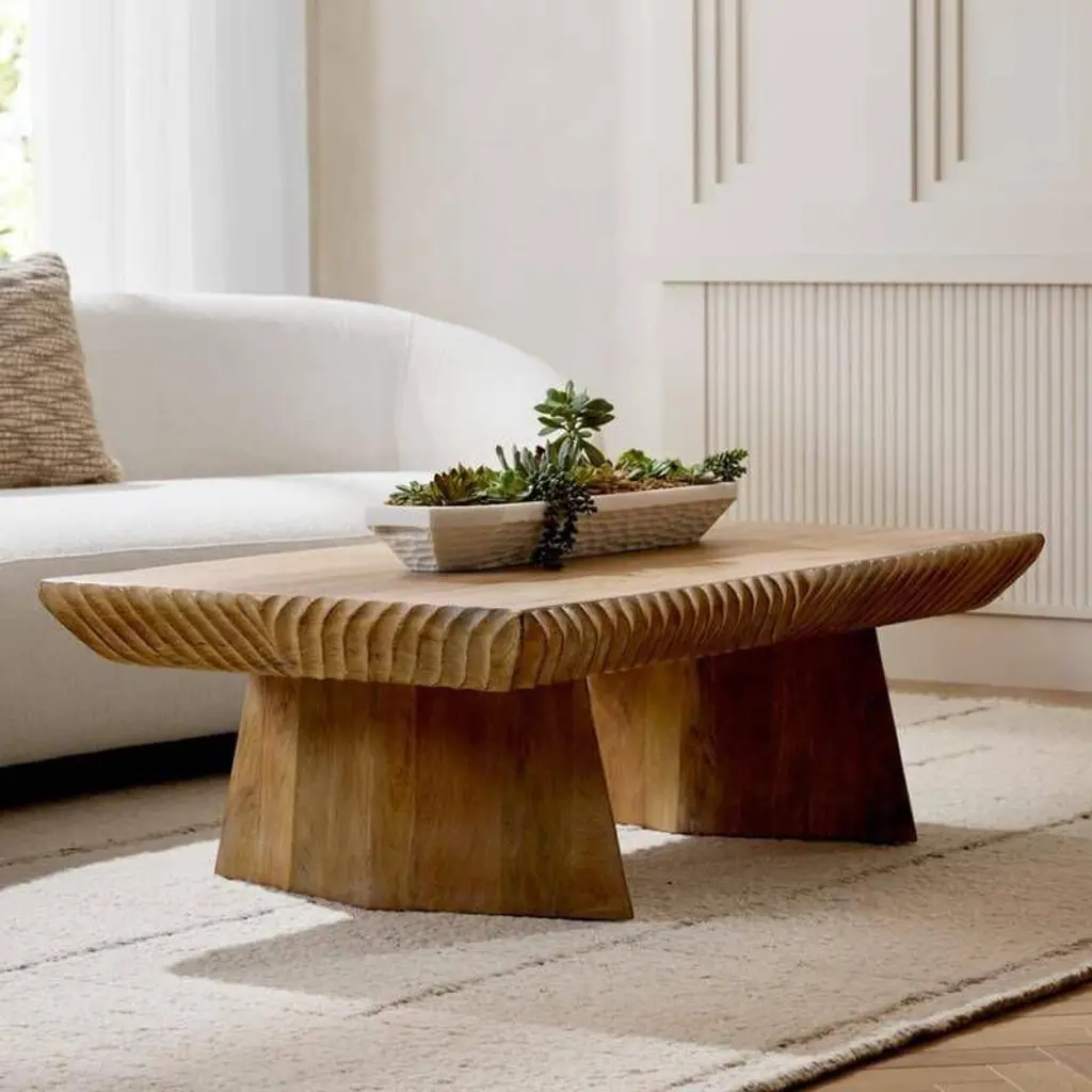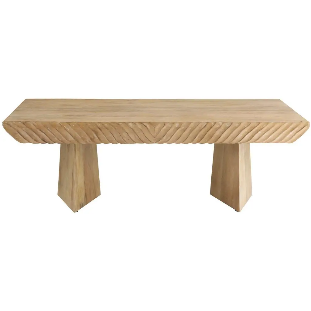 The details of Spanish wood carvings influenced the ridged edges of our substantial handcrafted cocktail table. Crafted of mango wood in a washed tobacco shade, it is accented with sturdy legs in a triangular shape. Finish will vary.