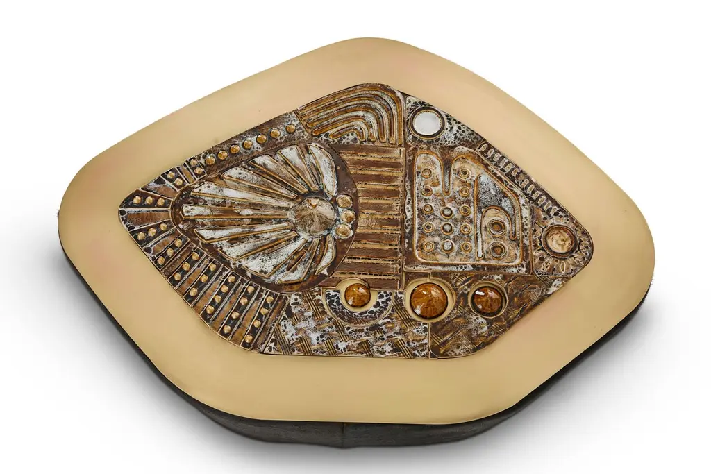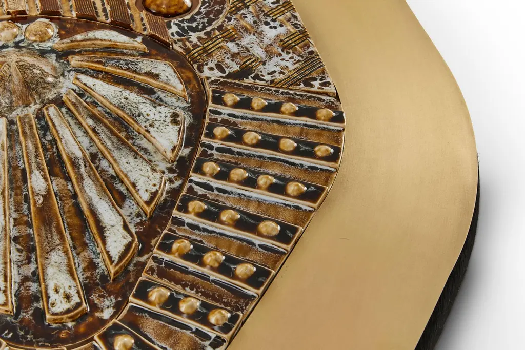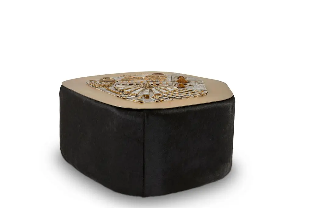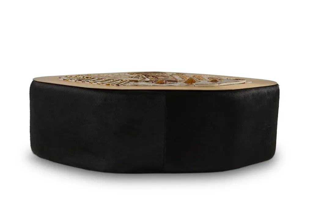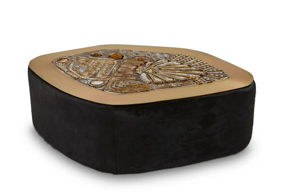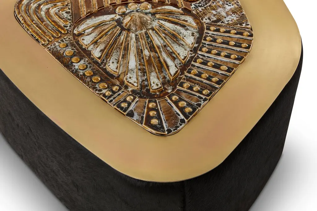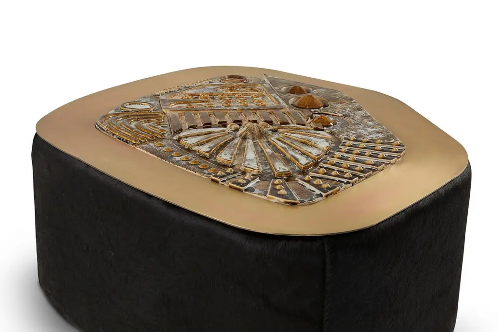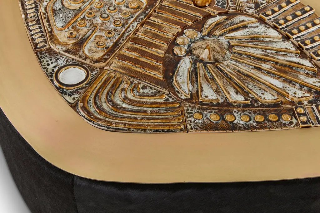 Jive coffee table by Egg DesignsDimensions: 122 L X 85 D X 49 H cmMaterials: Handmade Ceramic Mural, Bronze Plated Steel, Black Hair On HideFounded by South Africans and life partners, Greg and Roche Dry - Egg is a unique perspective in contemporary furniture inspired with a soul that’s deeply rooted in the African continent.We believe Egg has a distinctive African design dialect.We dream that our products will not only be judged by their function and form, but by the beauty of their eternal narrative.In everything we create we must answer the question, “Is it Egg enough?”Egg, is a spirited blend of heritage, passion, meaning and African soul. It stands the test of time. It’s curiosities that make you smile. It’s love and truth that can be seen from afar and equally found in the minutest details. That’s why every piece we craft comes from Africa and carries within it a part of the African soul. We’re a melting pot of tribal craft, African heritage and modern luxurious expression.“If it’s not Egg enough, it’s not worth doing!”We have widened the prism of contemporary African design in Modern Antiques, high-end Furniture, lighting and custom interiors inspired by an African provenance for a modern, international customer.