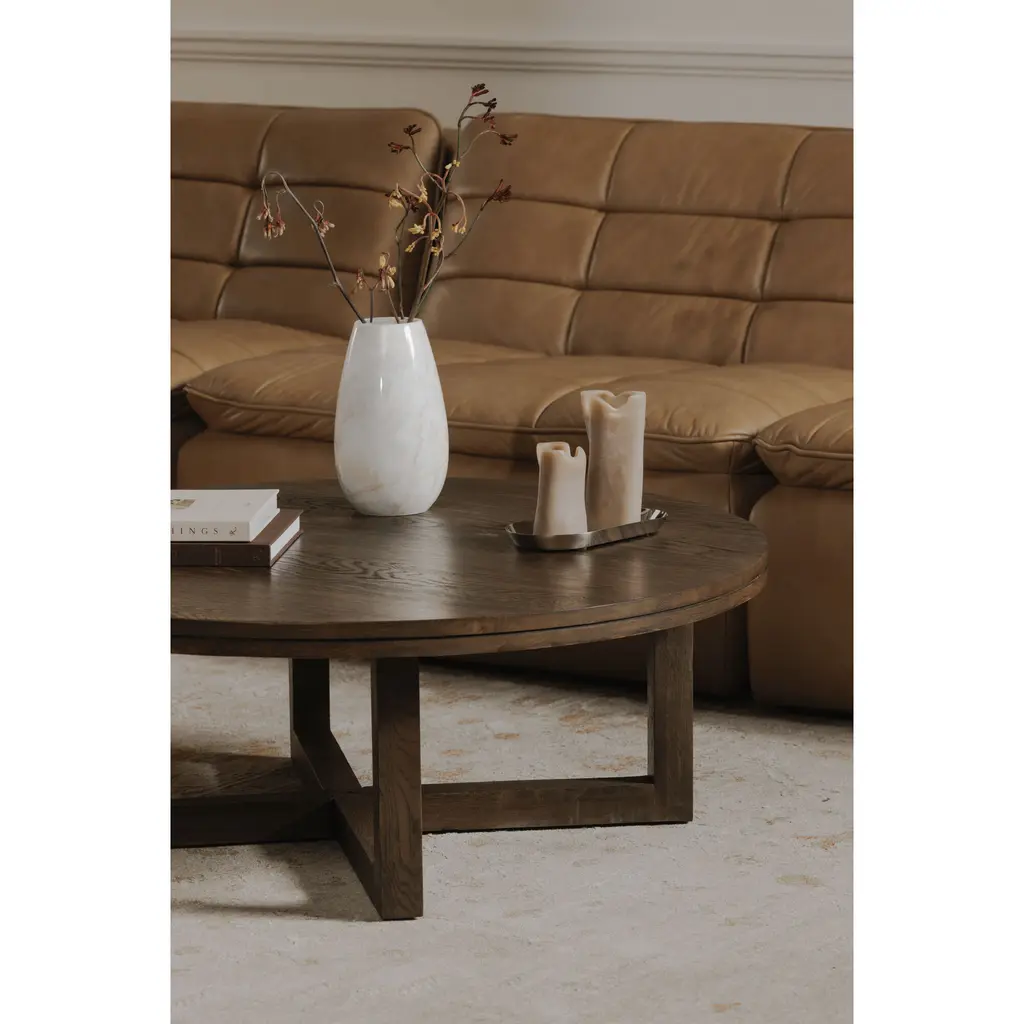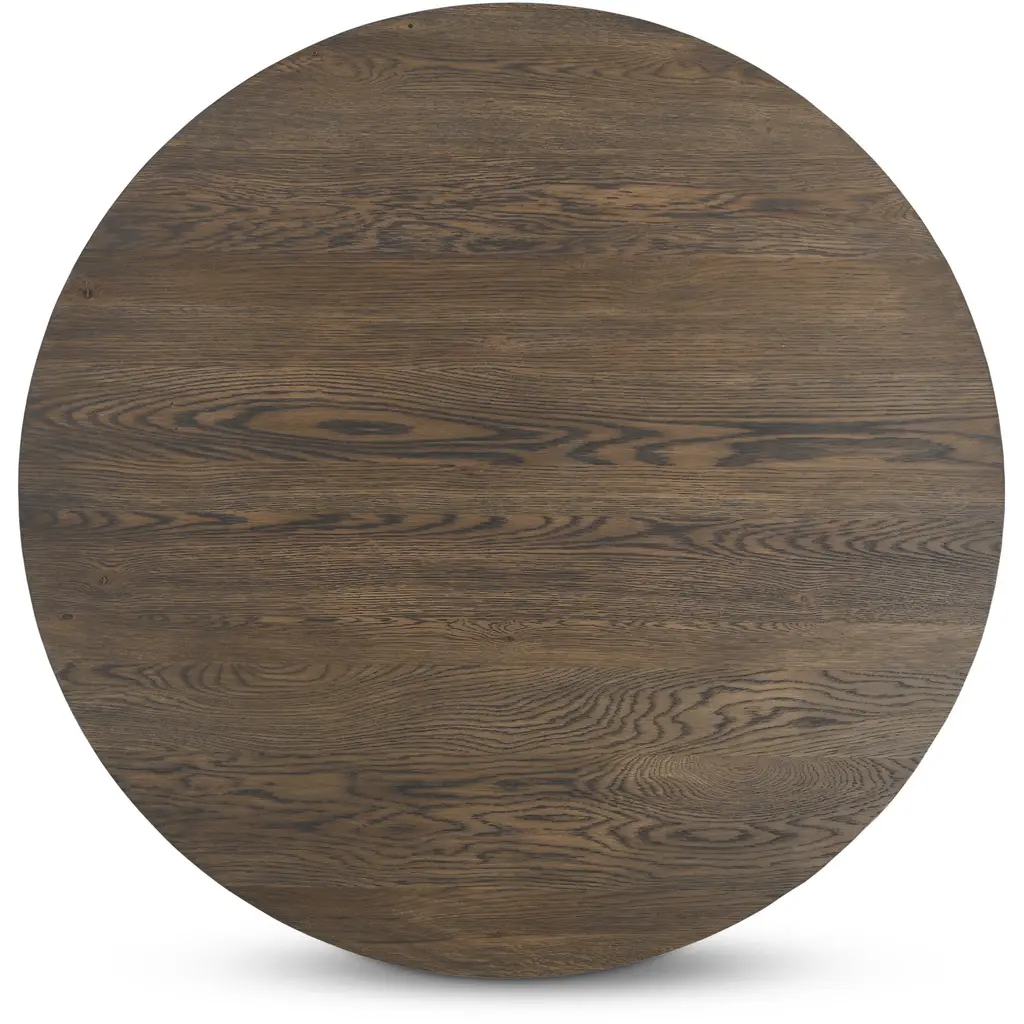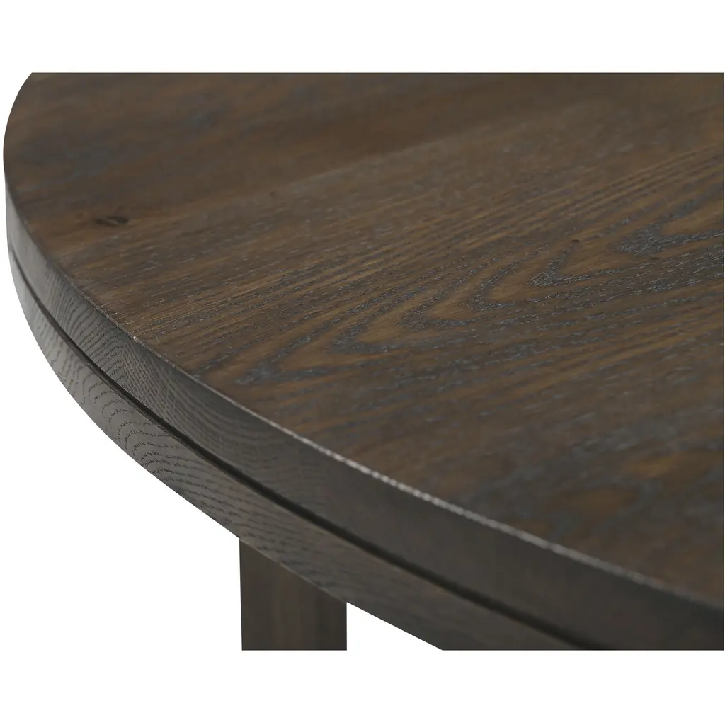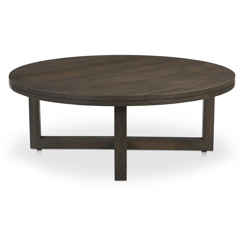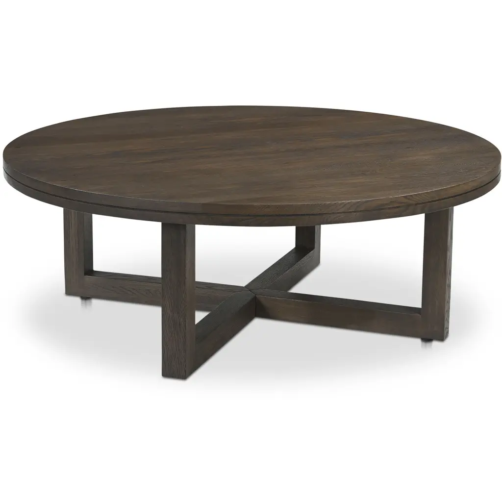 Crafted from solid oak, the Joel coffee table's thick round top features a thoughtfully crafted V-groove, adding a visual lightness to the substantial surface. The geometric base, with crisscrossing stretchers, grounds the piece with quiet confidence. A dark brown, wire-brushed finish enhances the oak's natural beauty, creating a focal point of understated elegance.