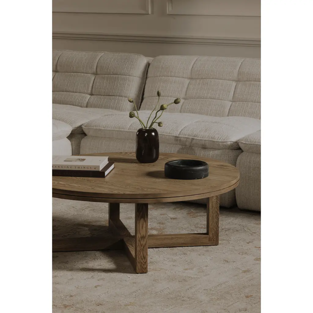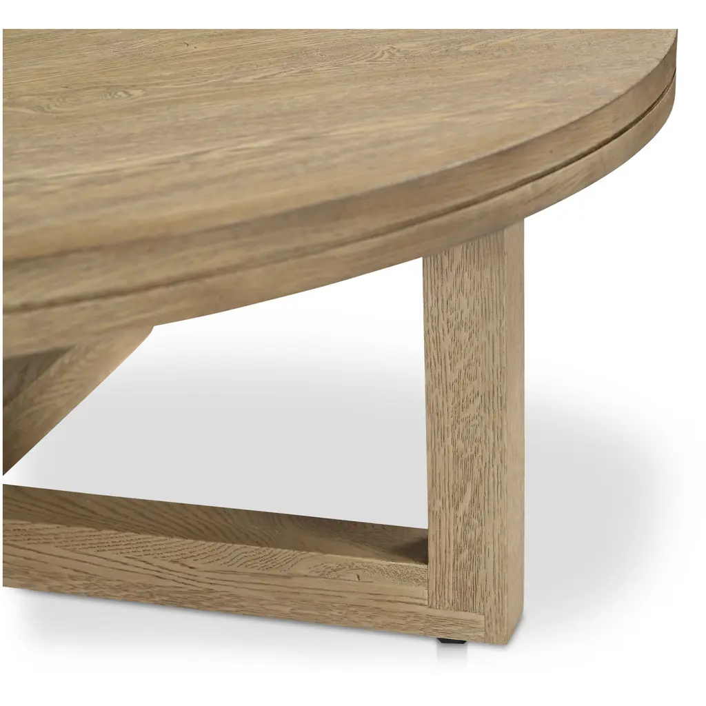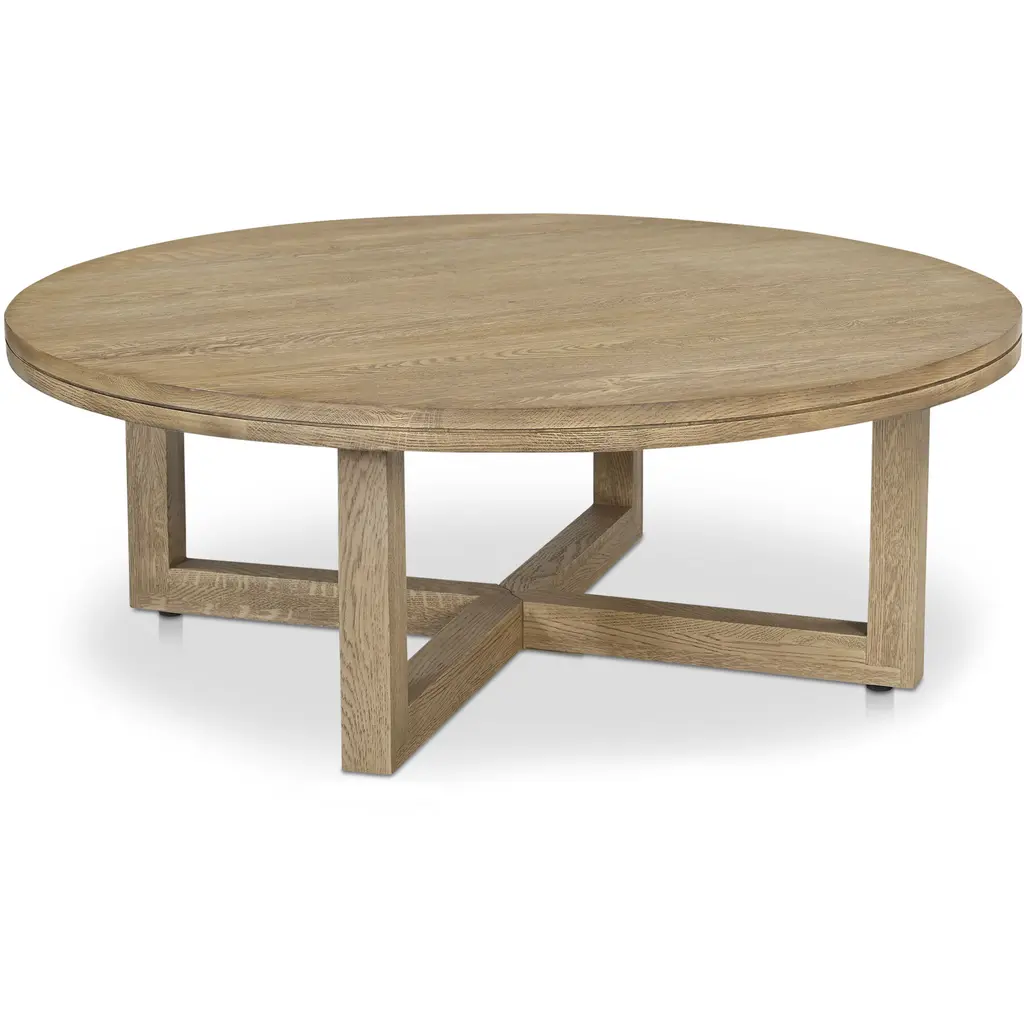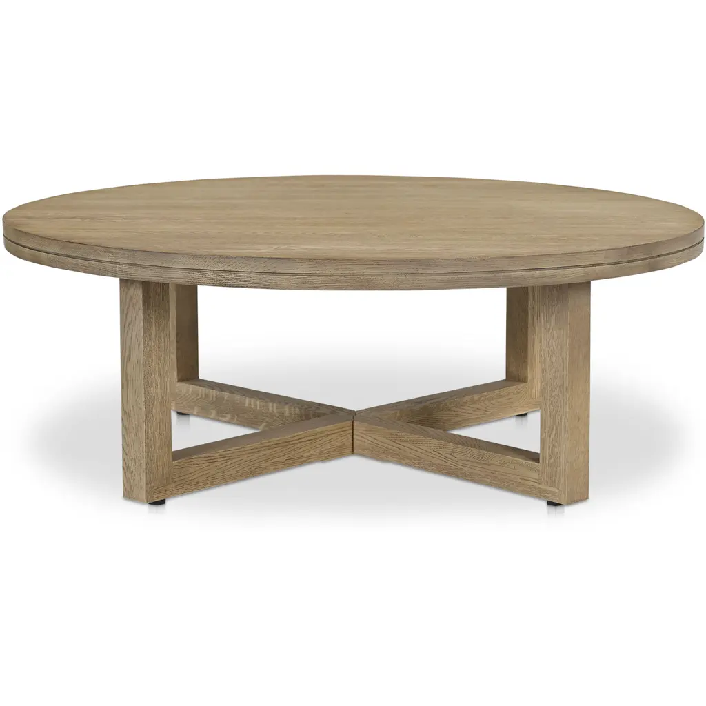 Crafted from solid oak, the Joel coffee table's thick round top features a thoughtfully crafted V-groove, adding a visual lightness to the substantial surface. The geometric base, with crisscrossing stretchers, grounds the piece with quiet confidence. A natural, wire-brushed finish enhances the oak's organic beauty, creating a focal point of understated elegance.