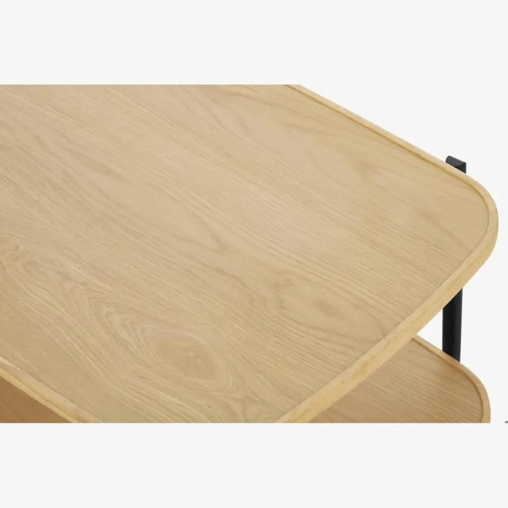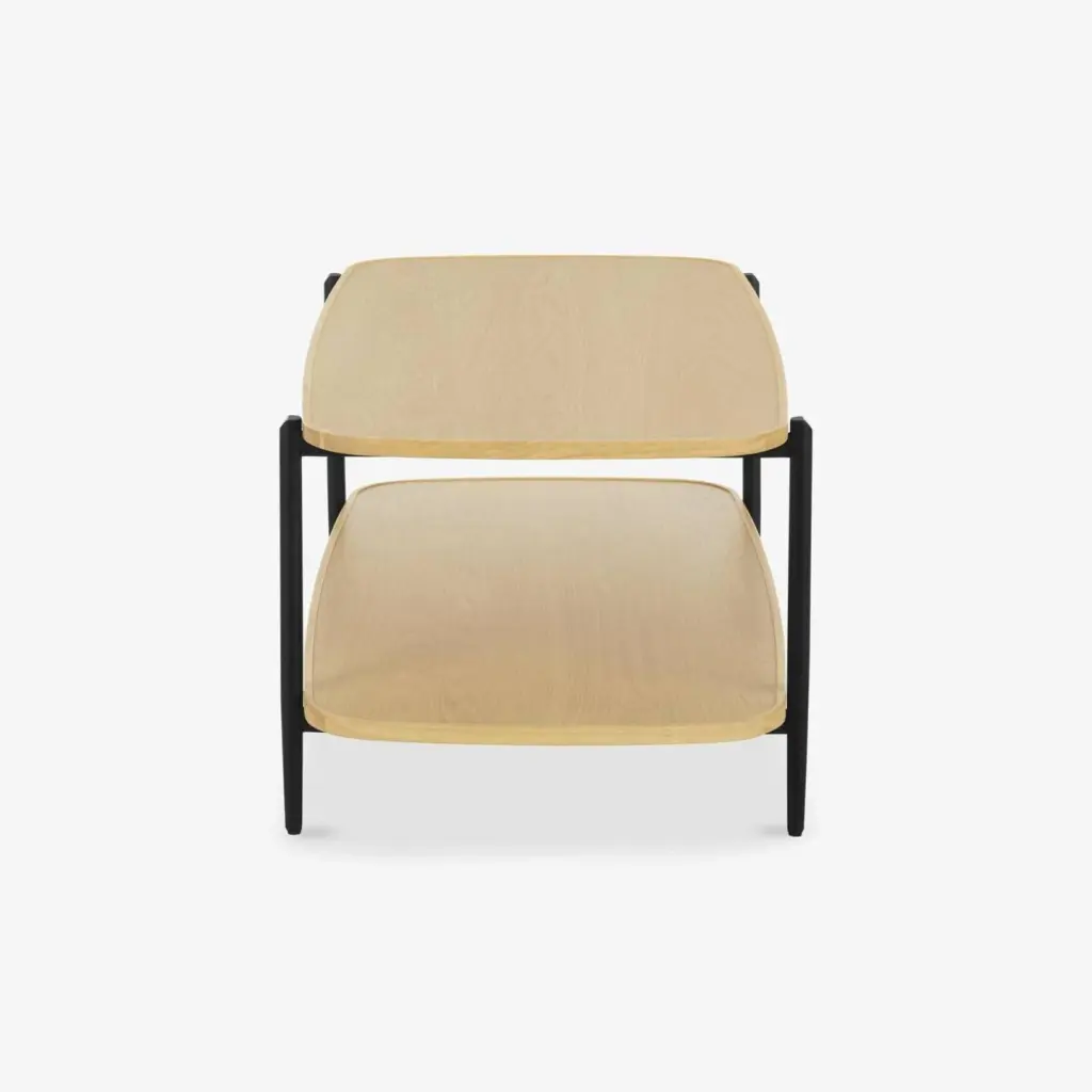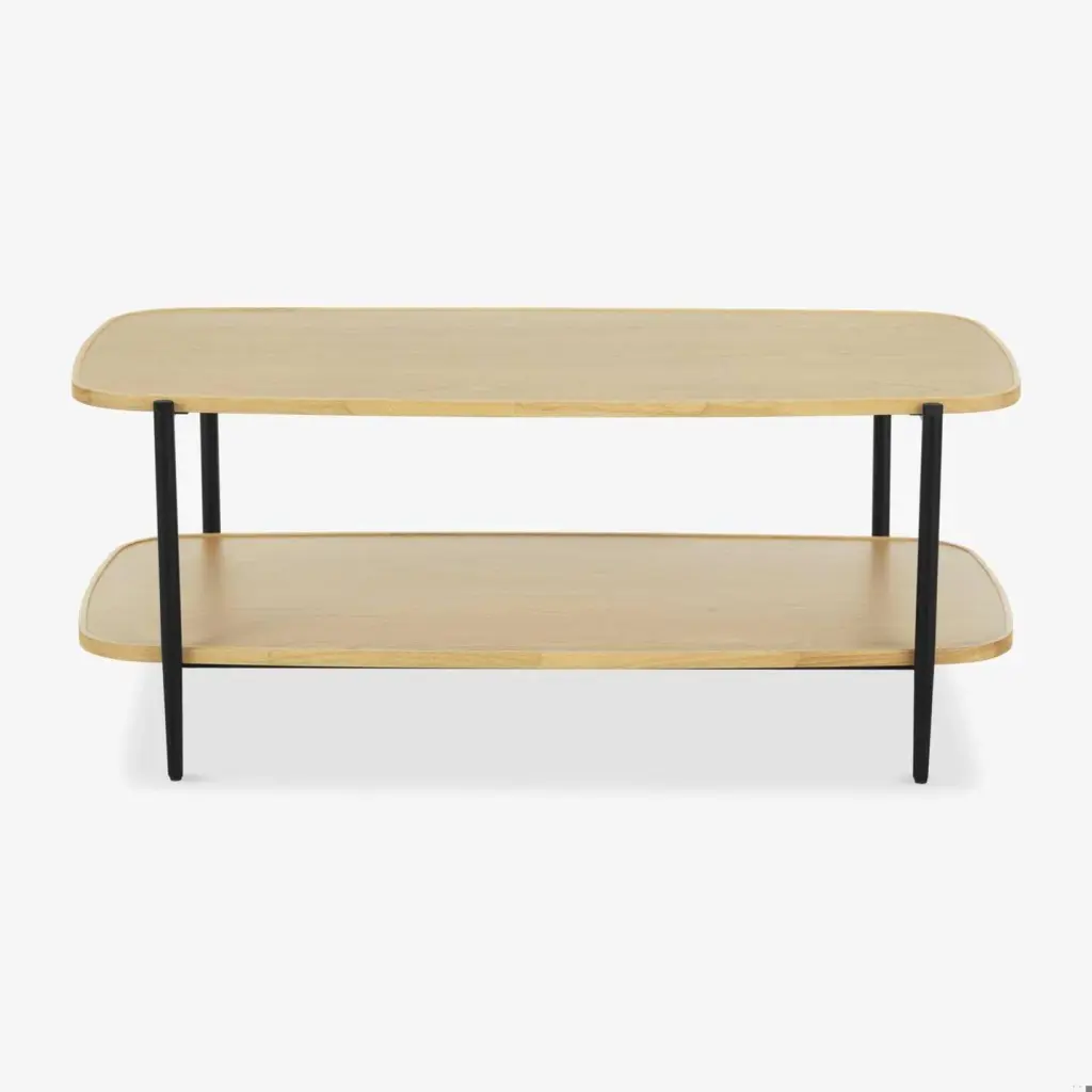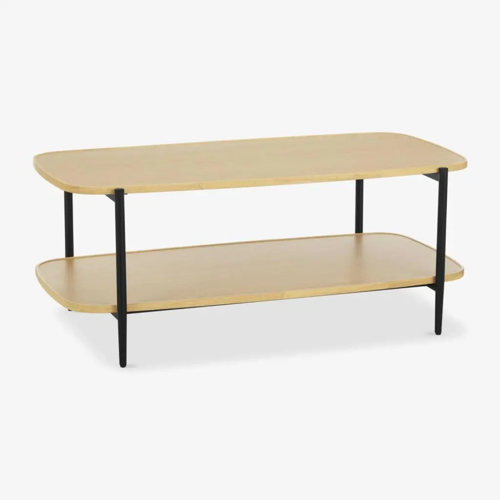 Center your living room with this versatile double-decker coffee table. Soft corners are complemented by strong lines of the metal frame. Open lower shelf offers extra storage for books and magazines.