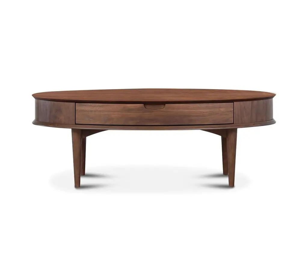 Our Juneau coffee table has a light, mid-century look with splayed tapered legs. Constructed from solid wood, this classic design features a single large drawer