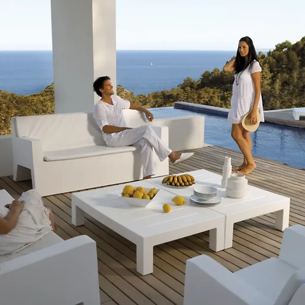 Showcasing artistic contrast, bold rectilinear shapes make up the minimalistic design of this large Jut Table 120. Clean, sharp lines and angles give the piece a chic contemporary charm, perfect for living and entertaining areas. The coffee table's low profile brings a more relaxed feel to the ambiance and an unobtrusive view of family and friends, encouraging conversations to flow freely. In addition, it's low enough to slip under higher coffee tables too. The impact-resistant polyethylene material composition is weatherproof and suitable for commercial use as well. While contributing to style, long perforations across the tabletop facilitate the spontaneous seepage of rainwater to keep the furniture dry. The Jut Table 120 is available in a range of vibrant colors and two finishes.
