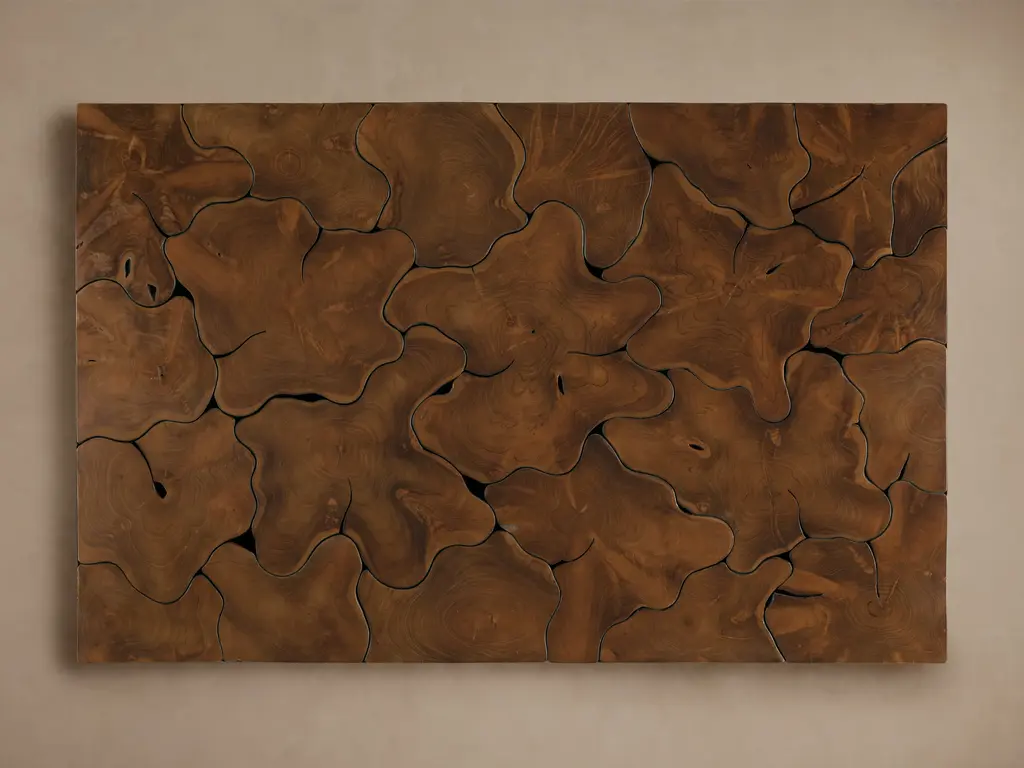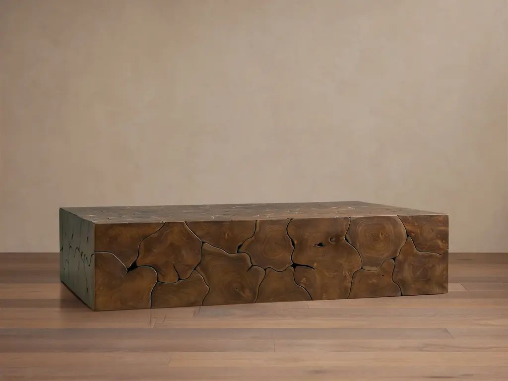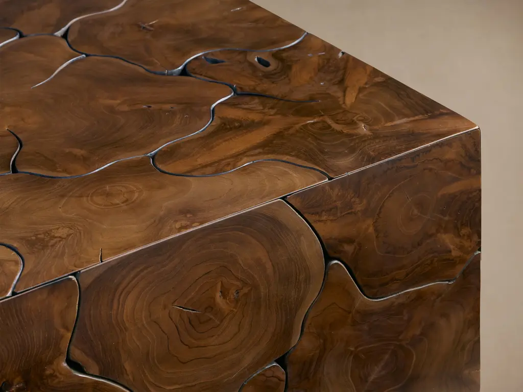 Masterfully handcrafted by our artisan partners in Indonesia, our Kalmar Collection is thoughtfully pieced together from slices of teak heartwood and sapwood affixed to solid wood frames. Each hand-cut section of teak is carefully sanded, smoothed, waxed, and sealed by hand to enhance its natural variations in wood tones, grain patterns, texture, and shape—making it truly one of a kind.