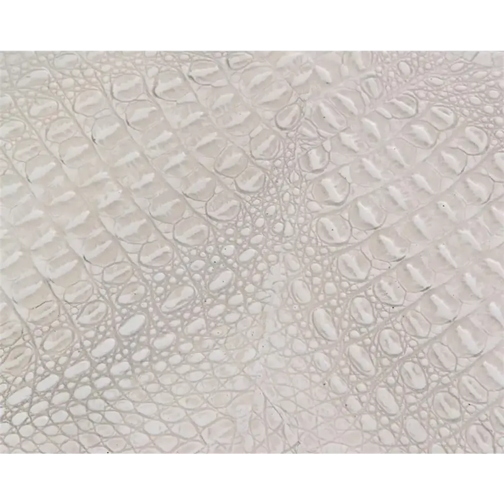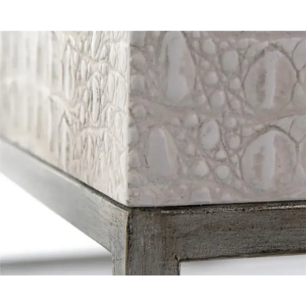 Mounted on a simple metal-framed base in a textured finish in silver white, the top of the Kano cocktail table features a book-matched crocodile pattern in textured resin finished in variegated tones of cream and white.