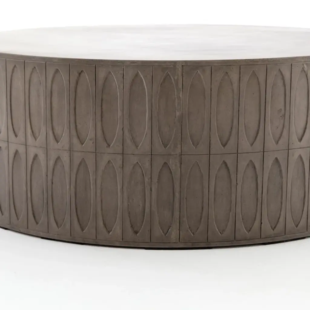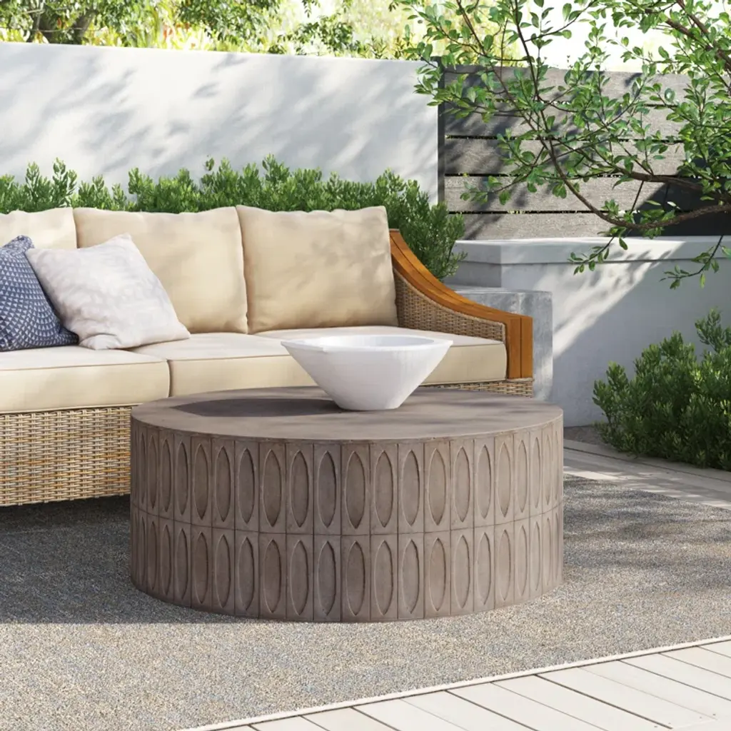 Concrete adopts alluring shapes as modern geometrics play with nature's petal form. A hollowed drum of dark gray concrete is intricately etched for artistic intrigue. Safe indoors or out. Cover or store indoors during inclement weather or when not in use.