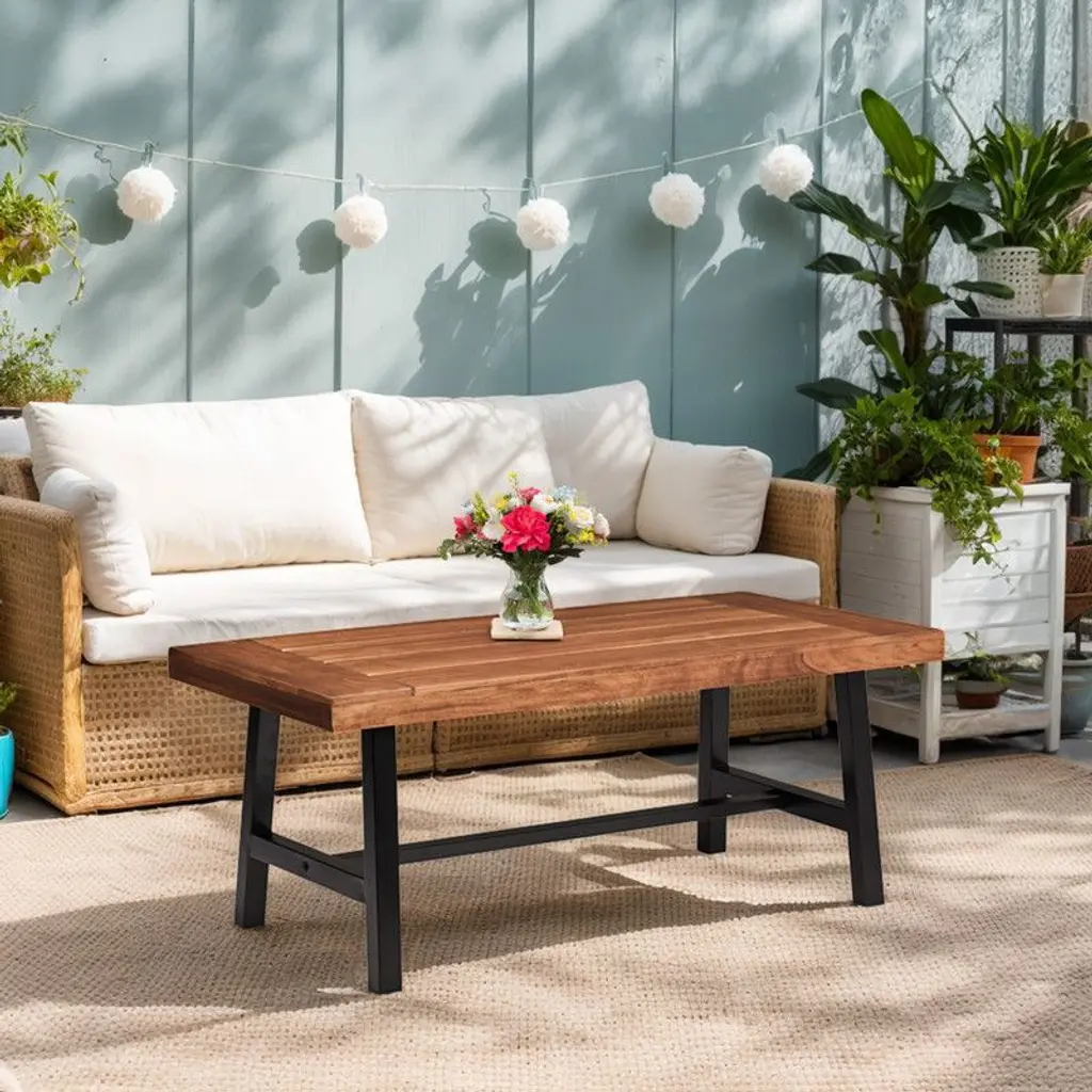 Add a touch of modern elegance to your outdoor living space with this Outdoor Patio Wood Coffee Table with Metal Legs. Perfect for your patio, garden, or backyard, this coffee table features a sleek combination of a solid poplar wood slatted tabletop and durable steel legs. Designed to withstand the elements, this versatile table offers both style and function, making it ideal for holding drinks, snacks, or decorative items while complementing a wide range of outdoor furniture styles. Whether you're hosting guests or relaxing with family, this all-weather coffee table provides ample space and a sleek design to enhance any outdoor or indoor area.