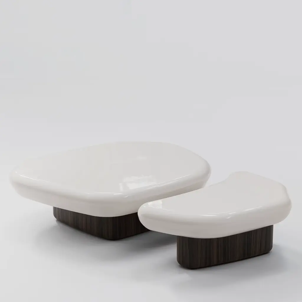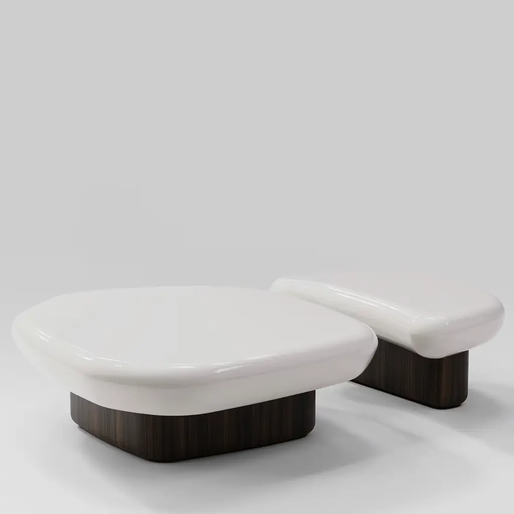 The Kawa Minor Coffee Table, designed by Artefatto Design Studio, features a glossy tortora wood lacquered top paired with a dark stained walnut base, combining elegance and durability. Inspired by the natural shapes and textures of pebbles found on the beach. It can be used individually or together, offering flexibility and functionality in your living space. Available in different finishes, it enhances any modern interior.