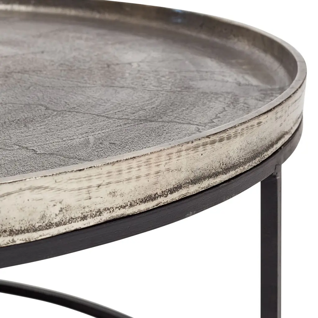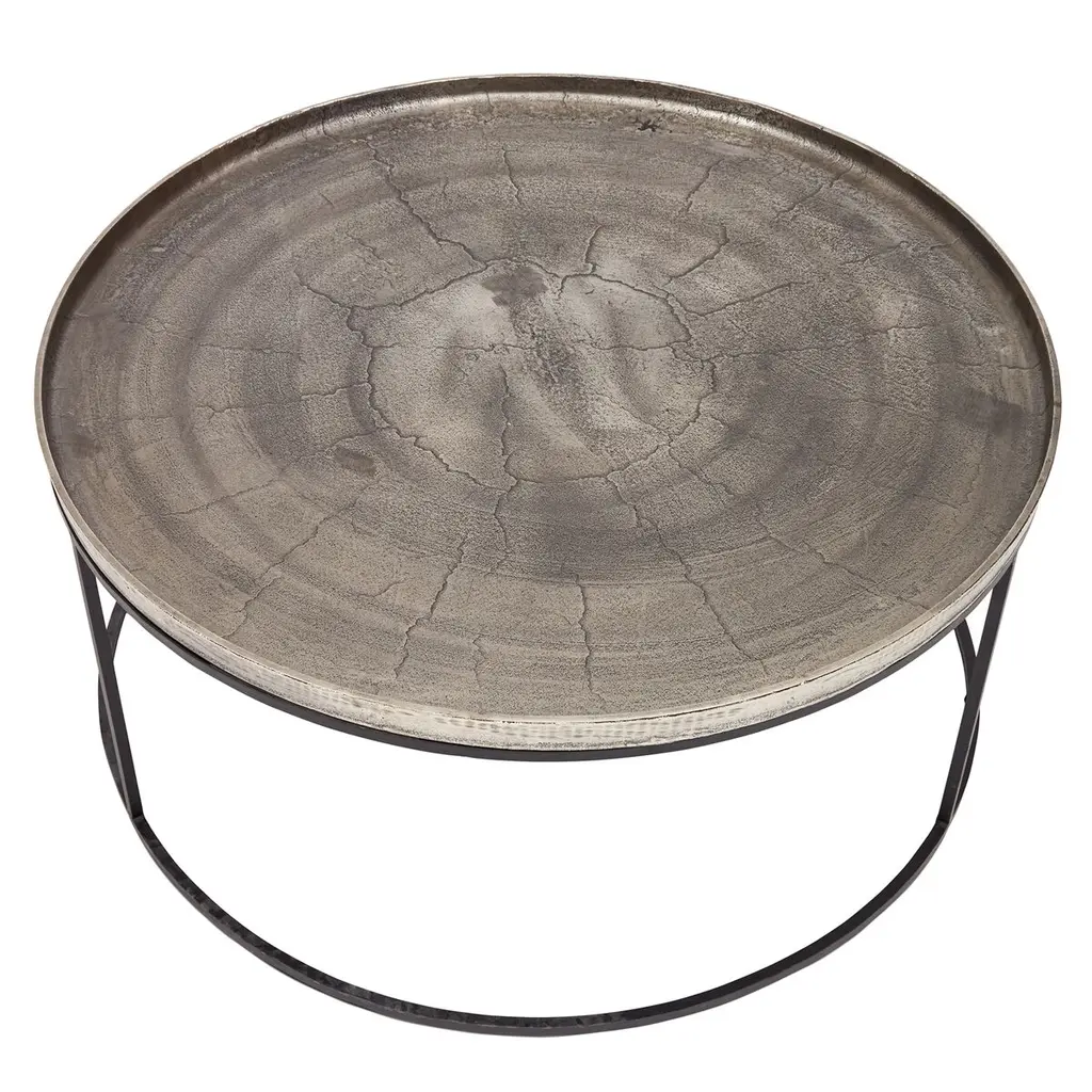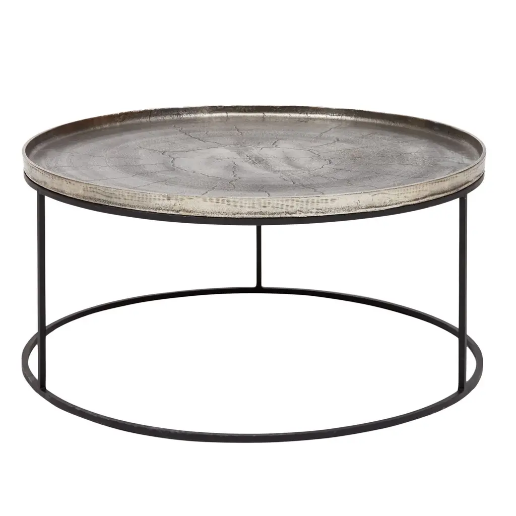 Made from recycled and repurposed materials, this coffee table is handcrafted from reclaimed aluminum, making it a sustainable addition to the living space. The rustic textured round provides long-term durability and sits atop three sleek legs and a hollow circular base. Features include a sculptural design, use of reclaimed aluminum, and each piece is handcrafted and unique.