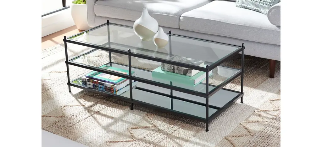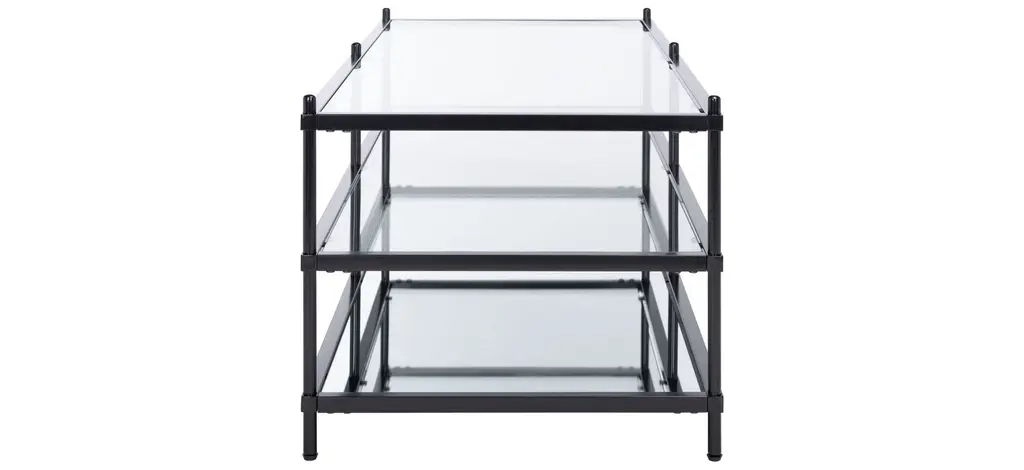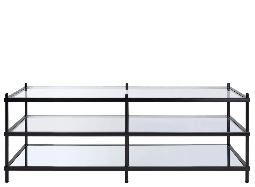 This Keelin Coffee Table is a designer must-have for today's celebrity-chic décor. Three tiers are ideal for storage or display, and glass and mirror shelves shine with glamorous depth that's perfectly balanced by Keelin's matte black frame.