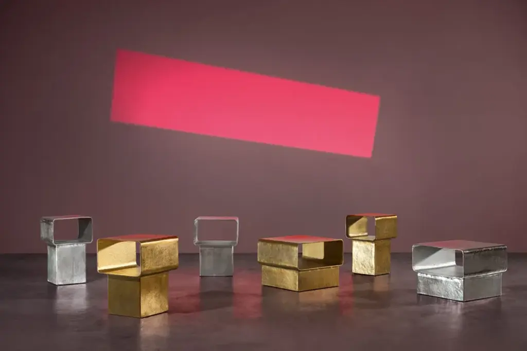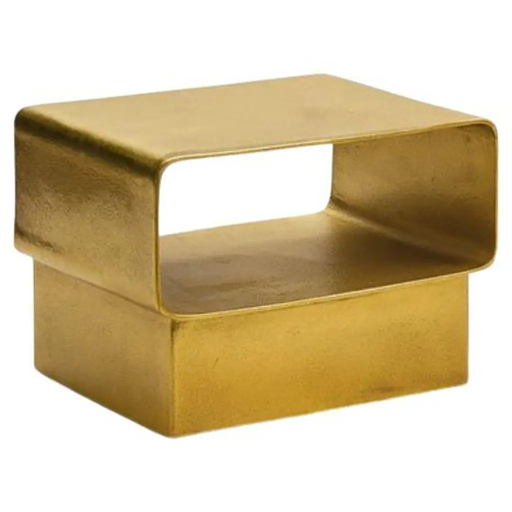 Kira is a side table distinguished by its bold design, featuring a play of solid and empty volumes. Made of cast aluminum, it showcases clean geometries, with a cubic base and a square top with rounded corners. The Gold or Chrome finishes accentuate its sparkling and industrial aesthetic.